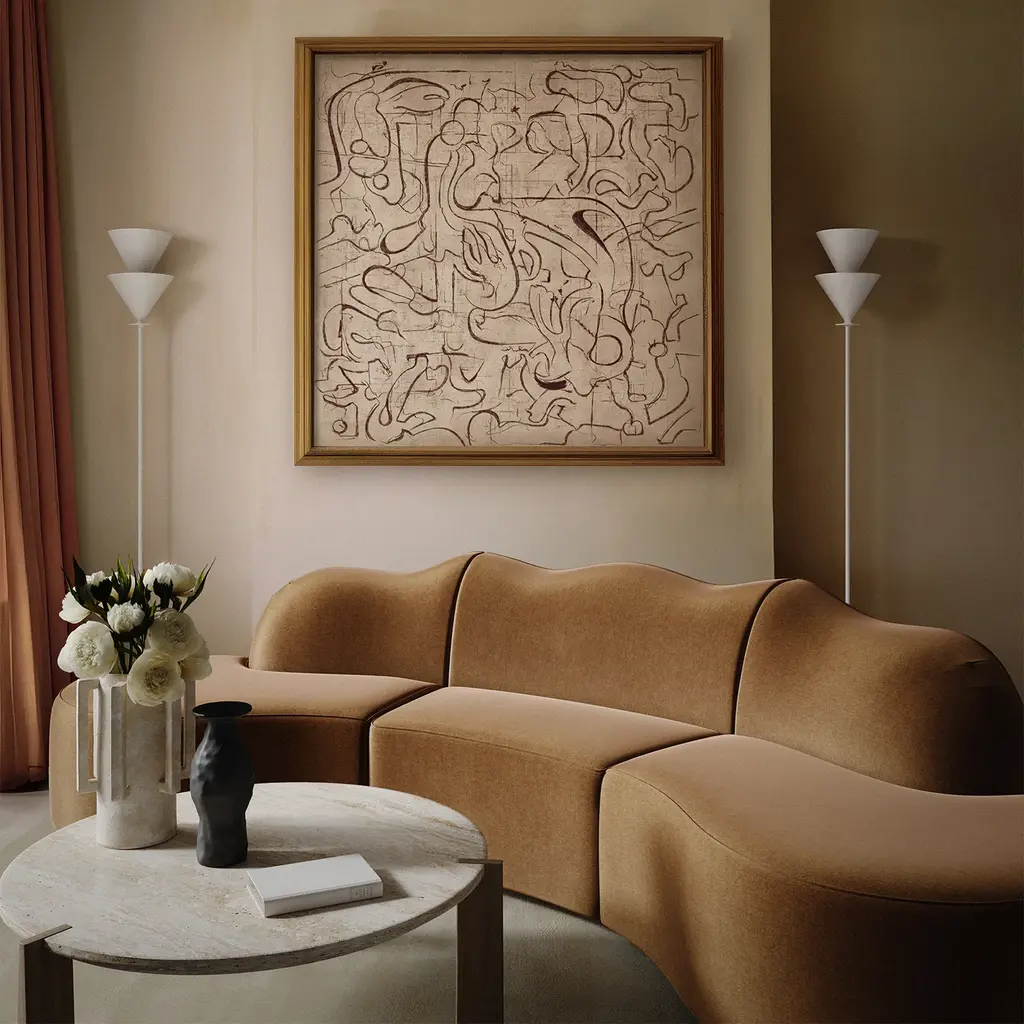 The Serpentine Sectional draws on the biomorphic lineage of Jean Royère and Vladimir Kagan, offering a restorative counterpoint to angular interiors. Flowing curves create a visual breath, a quiet architecture of calm. Designed as a multi-piece composition, the Serpentine’s soft contours and modular scale bring spatial grace to living rooms, libraries, or open floor plans. Modules can be configured into sweeping curves or anchored arrangements to suit the horizon of the space by adding additional wedge units.