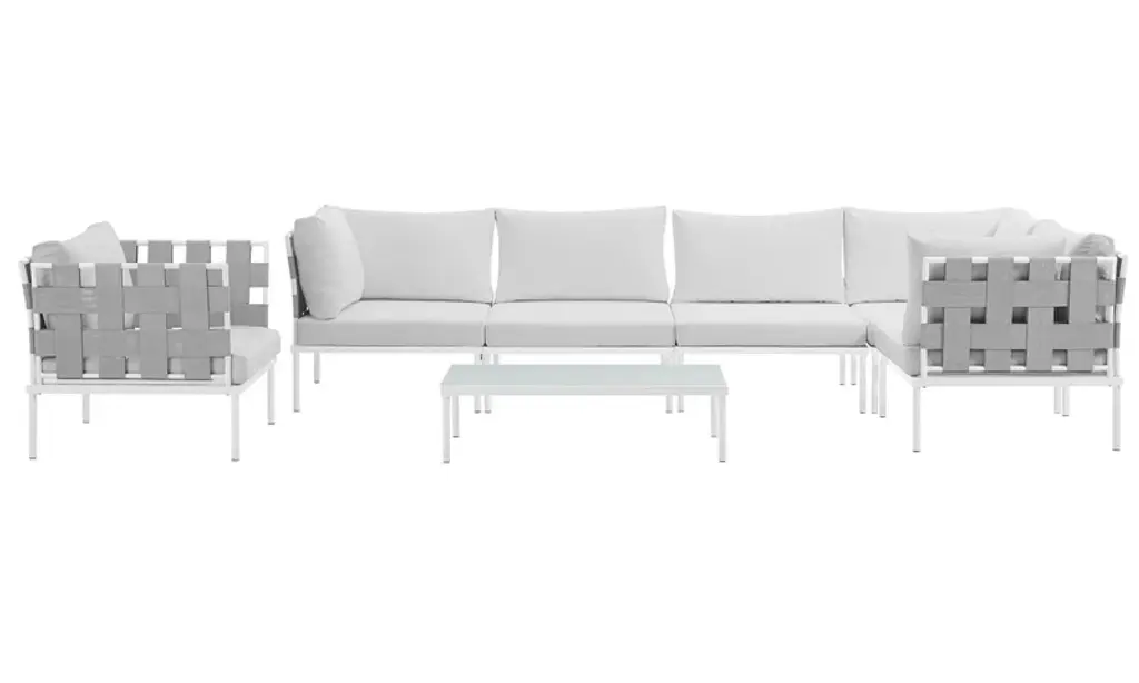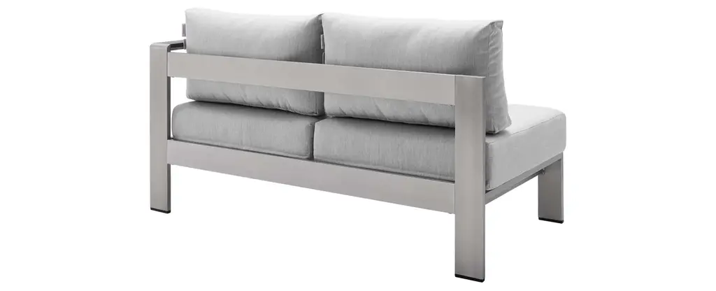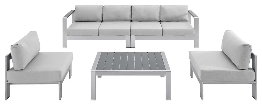 Enjoy your patio or backyard leisure time with the strong and durable Shore Outdoor Patio Aluminum 5 Piece Sectional Sofa Set. Made with anodized brushed aluminum frames and non-marking black plastic foot caps, Shore comes outfitted with resilient Sunbrella fabric canvas cushions tested to last through all weather conditions. The Shore Outdoor Sectional Sofa Set complements your casual gatherings with a look and functionality you can rely on. Set Includes: 1 Left-Arm Sofa, 1 Right-Arm Sofa, 2 Armless Chairs, 1 Coffee TableBullet Features:5-Piece Outdoor Sectional Sofa SetAll-Weather Sunbrella FabricComfortable Dense Foam PaddingAnodized Aluminum FramesNon-Marking Black Plastic Foot CapsMachine Washable CushionsAssembly RequiredSet Includes:One - Shore Coffee TableOne - Shore Left-Arm LoveseatOne - Shore Right-Arm LoveseatTwo - Shore Armless ChairProduct Dimensions:Overall Right-Arm Loveseat Dimensions: 27.5"L x 53"W x 25"HSeat Dimensions: 27.5"L x 50"W x 16.5"HArmrest Dimensions: 27.5"L x 8"W x 25"HBackrest Dimensions: 13.5"HSeat Cushion Dimensions: 27"L x 25"W x 5"HOverall Armless Chair Dimensions: 27.5"L x 25"W x 23.5"HSeat Dimensions: 27.5"L x 23.5"W x 11"HBackrest Dimensions: 25"W x 14"HSeat Cushion Dimensions: 27"L x 25"W x 5"HOverall Coffee Table Dimensions: 23.5"L x 39.5"W x 15.5"HFloor to Underside of Table: 13"HBase Width: 17.5"WWidth of Legs: 17.5"WAluminum Tube: 22.5"L x 3.5"W x 1/2"HOverall Product Dimensions: 67"L x 106"W x 25"H