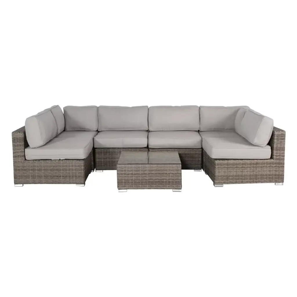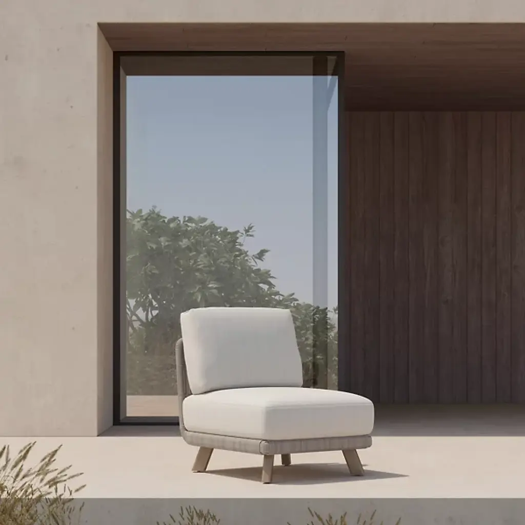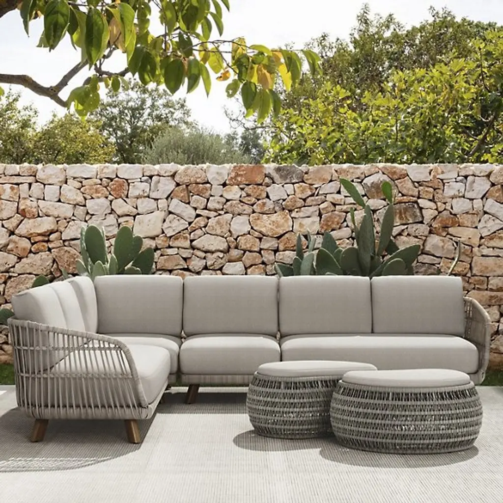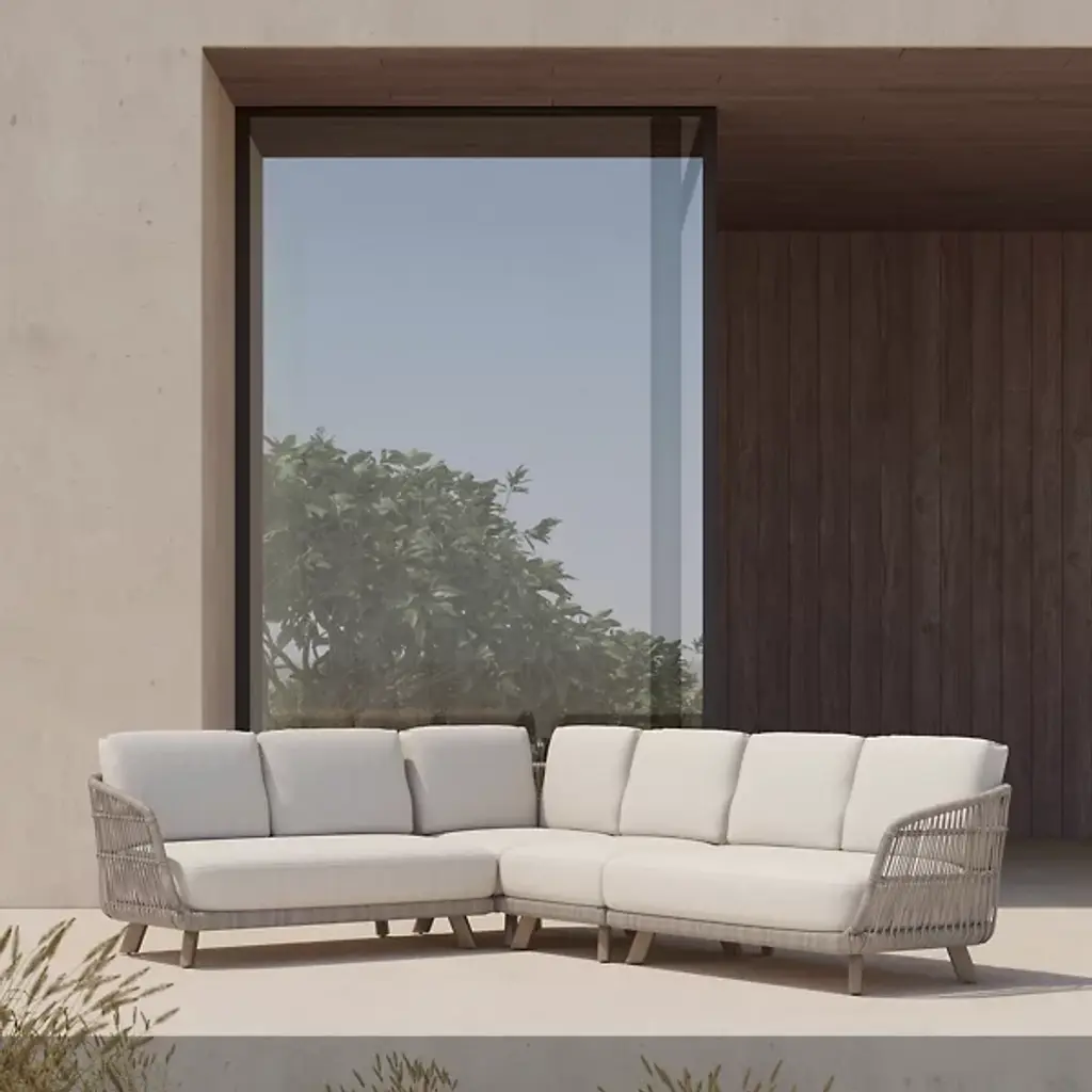 The Sicily Modular 4-Piece Sectional Sofa from Azzurro Living features gentle curves and lavish proportions, creating an inviting outdoor lounging experience through its expansive modular design. All-weather wicker weaves around a fully welded powder-coated aluminum frame while natural teak accents provide lasting beauty and natural resilience. Deep cushions conform to the body, while soft performance fabrics effectively handle outdoor conditions. Colorfast wicker maintains its original appearance even after extended exposure, and sustainably harvested teak naturally weathers from a rich amber to a silvery gray patina.