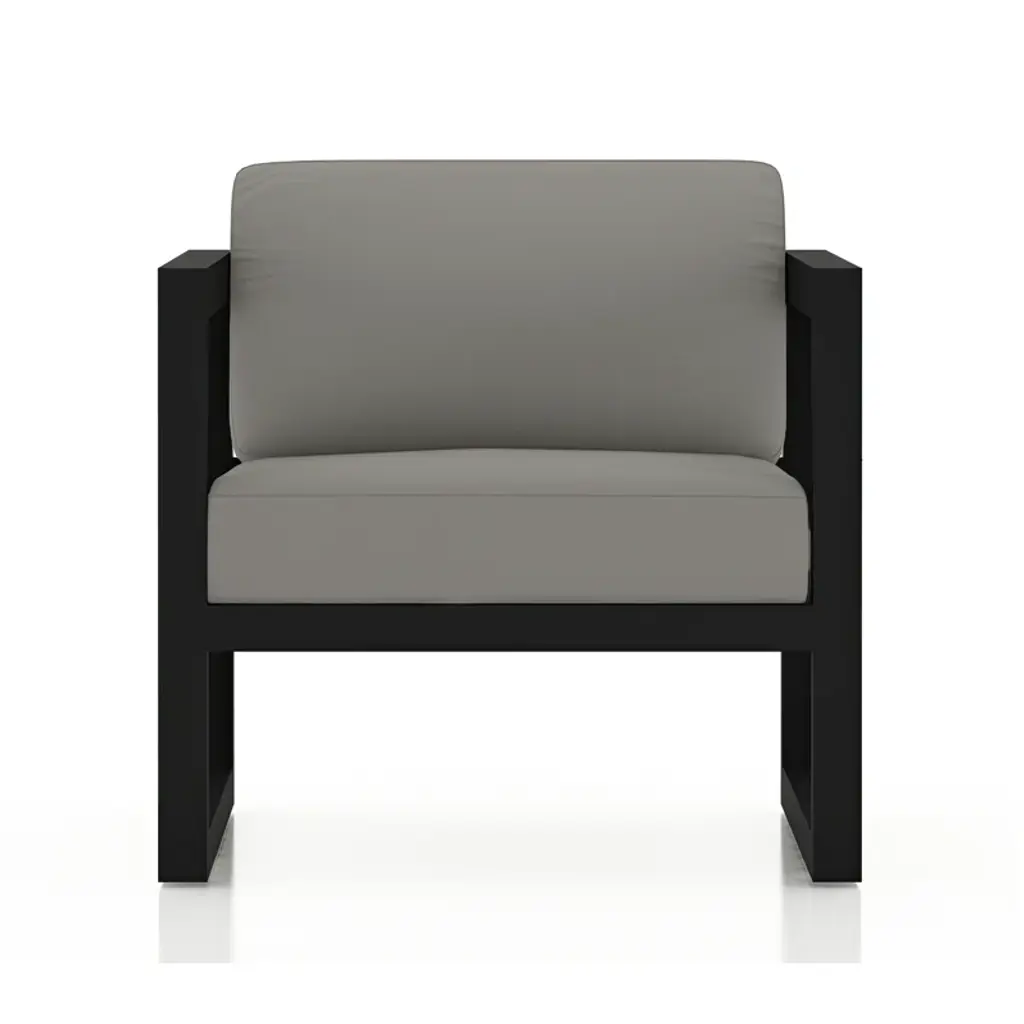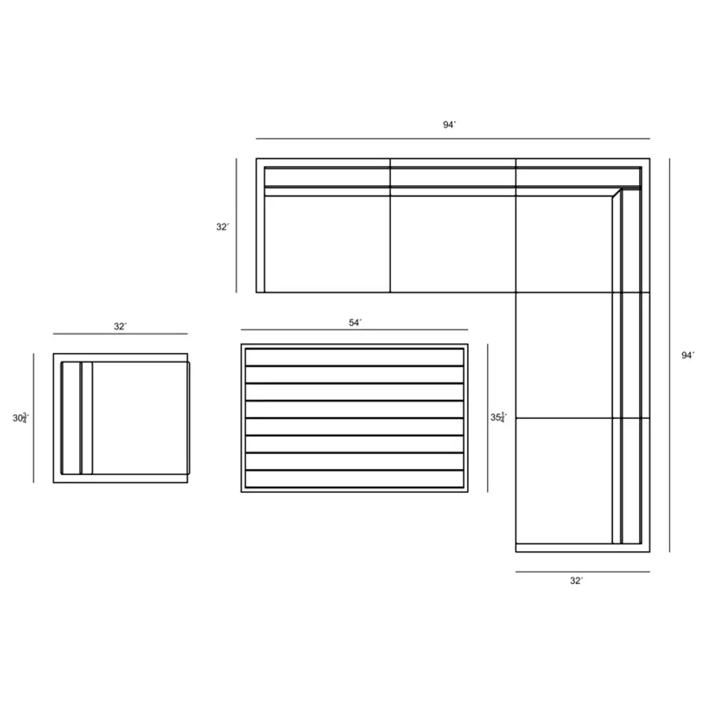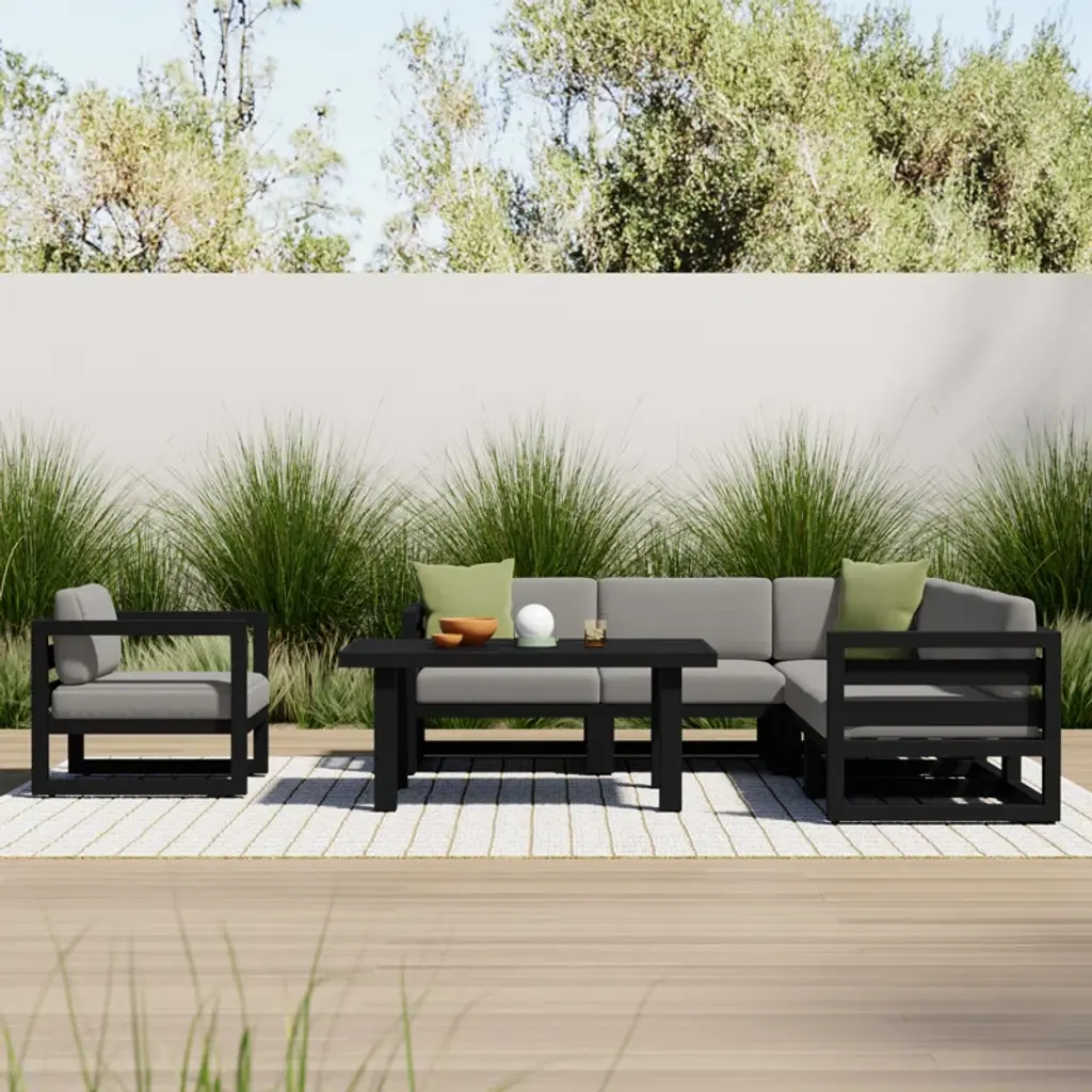 With its thick cushions + bold lines, this outdoor seating group makes alfresco lounging as stylish as it is comfortable. Built from powder-coated aluminum, it includes a chair + sectional with cushions wrapped in washable Sunbrella covers, plus a breezy slatted coffee table.