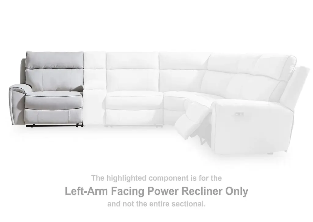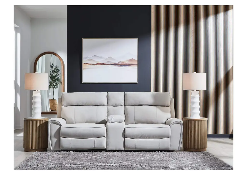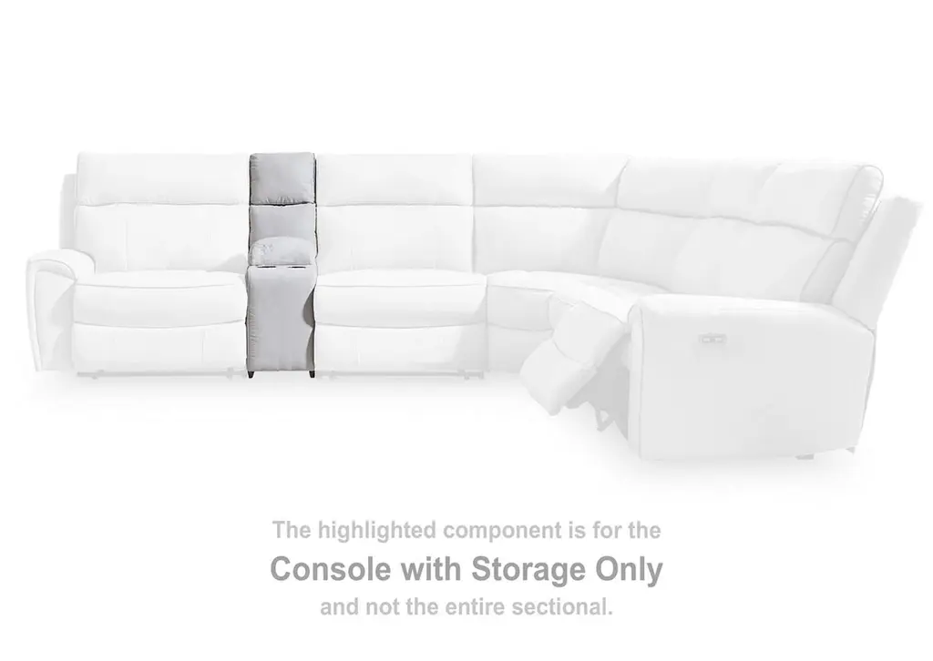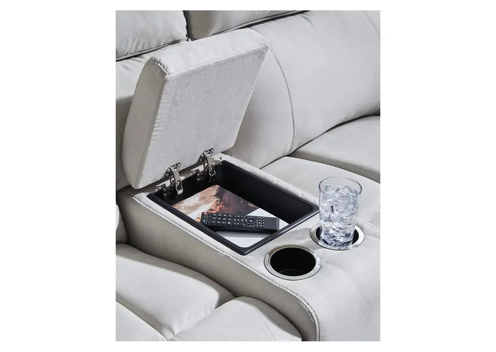 Smart, clean and ultra modern, this power reclining sectional is utterly in vogue. You'll love its indulgent cushions and contemporary bustle back styling. The sumptuous fabric, accentuated with contrasting welting, easily blends with your decor. A convenient console with storage and two cup holders keeps essentials handy. And with reclining at the press of a button, this modular sectional proves chic design and superb comfort go hand in hand. Weight 419.000 lbs. (188.55kgs.)