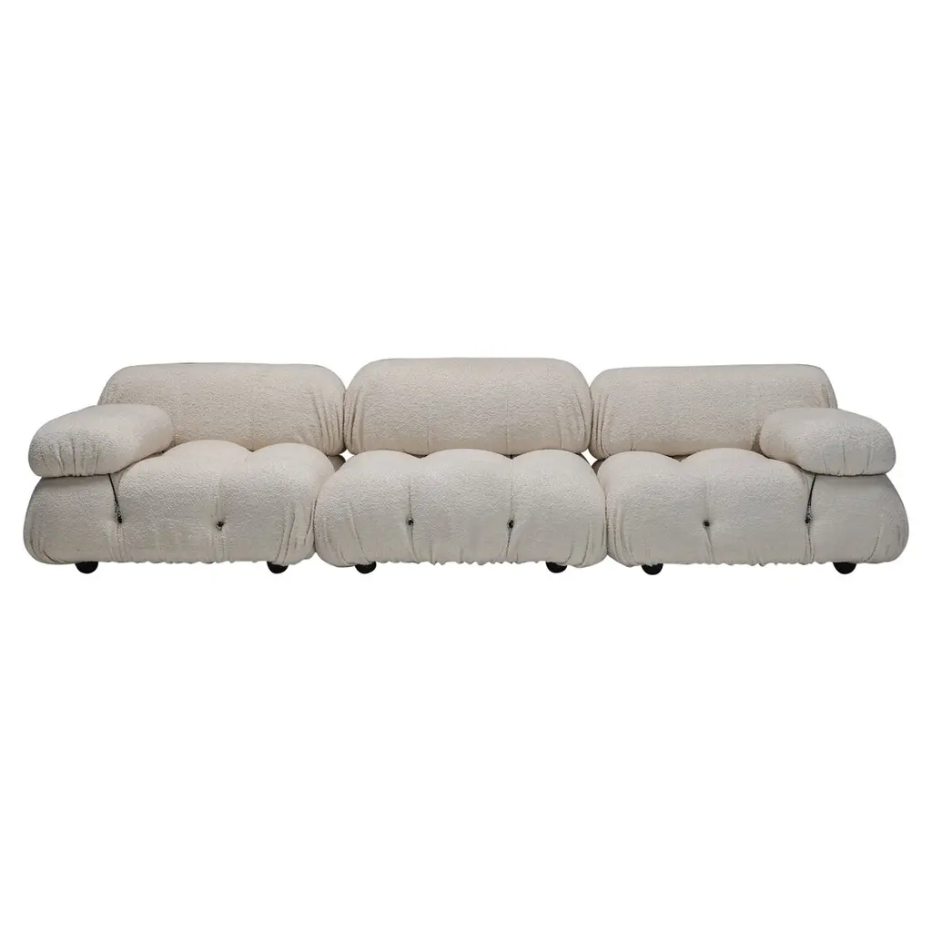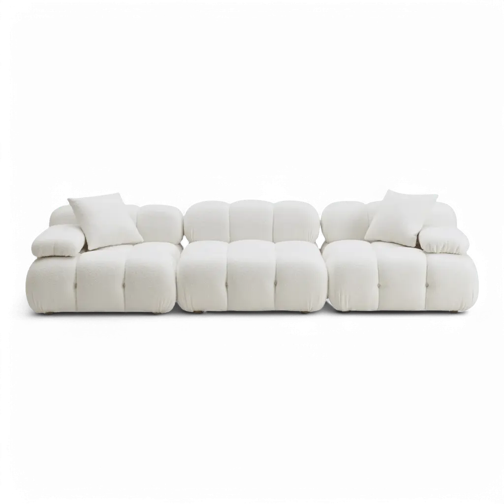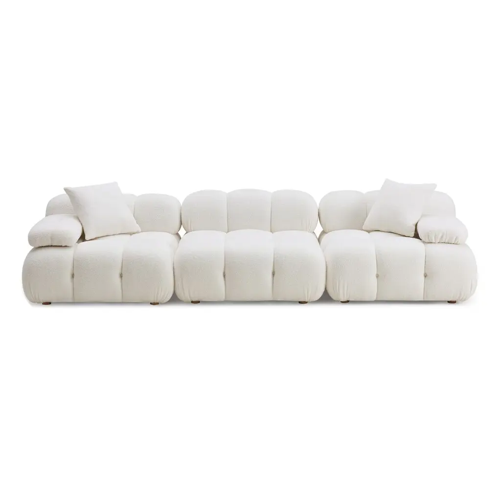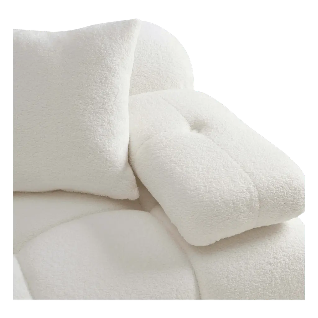 The Solace Modular Sectional in Cream Vegan Shearling offers versatility and comfort. With its modular design, you can customize your seating arrangement to fit your space while enjoying the plush texture.Fabric,Plywood,Wood | Ultra-soft vegan shearling upholstery | Pillowy silhouette with deep hand-tufted design | Modular design allows for endless configuration possibilities - create your dream piece for your space