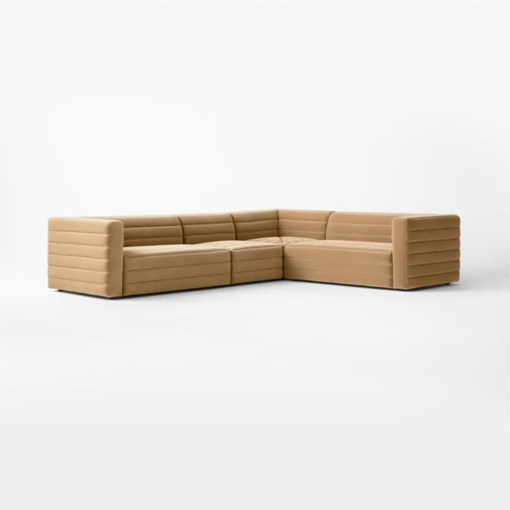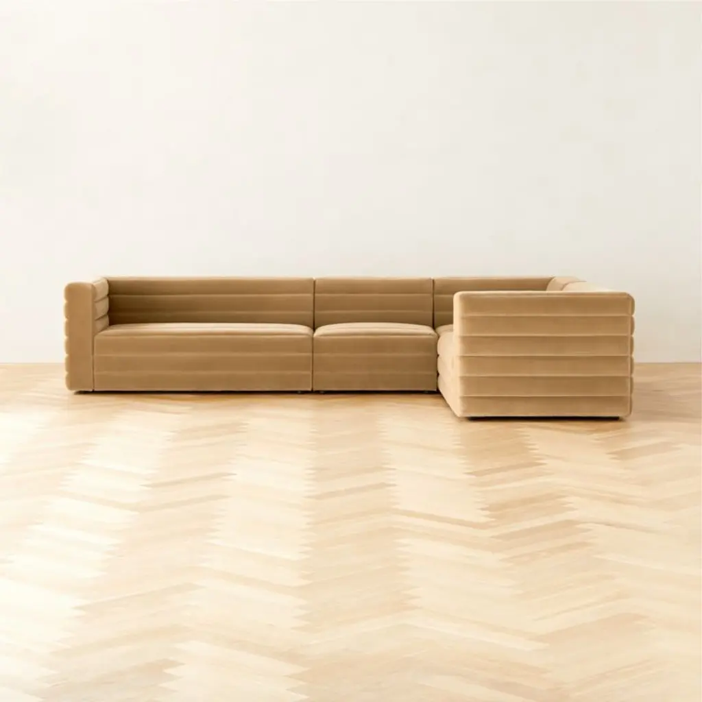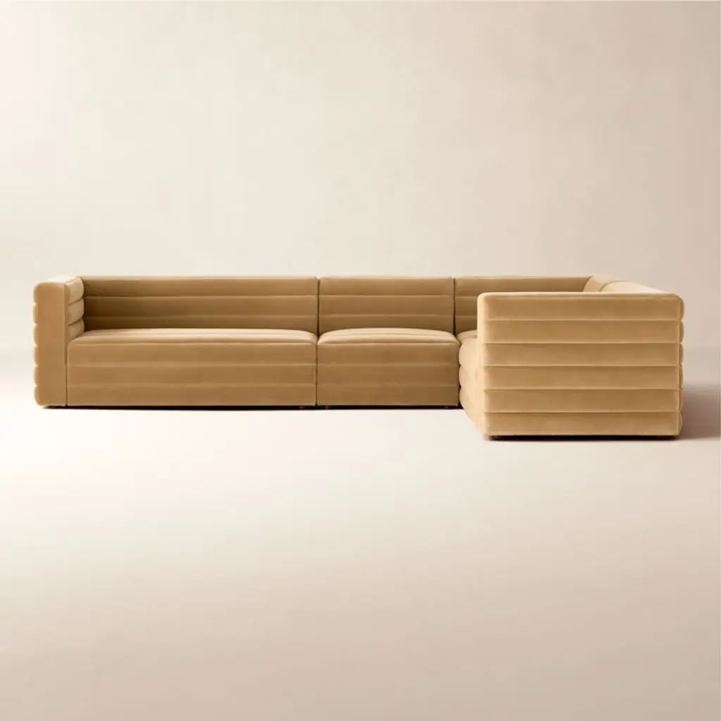 Designed by Mermelada Estudio, this vintage '70s-inspired sectional sofa is upholstered in rich camel velvet with plush channel tufting. "Luxe" doesn't do it justice. Learn more about Mermelada Estudio on our blog. CB2 exclusive.