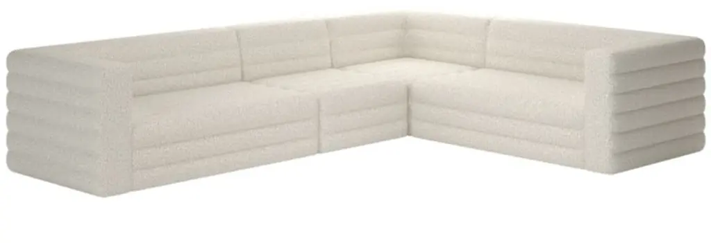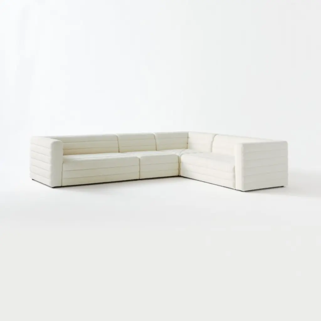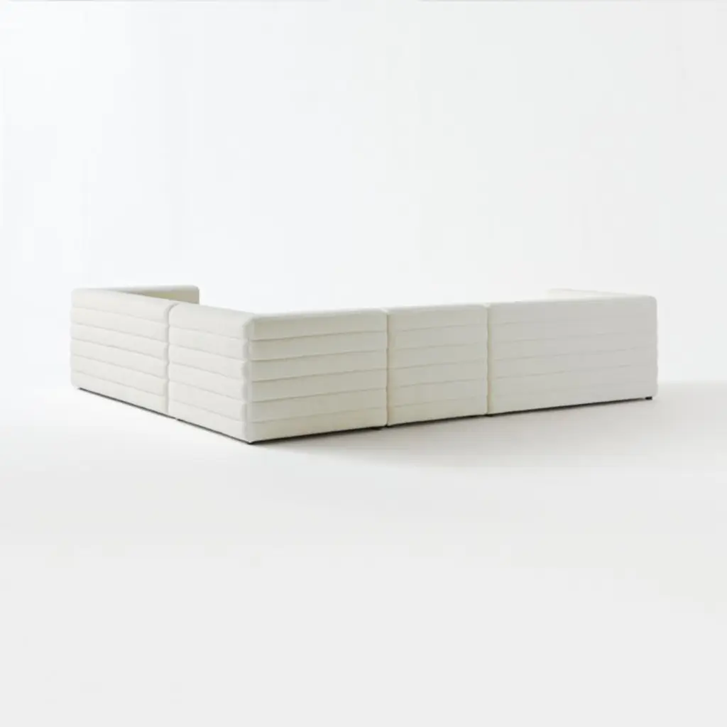 Meet Strato. Designed by Mermelada Estudio, this vintage '70s-inspired sectional sofa is upholstered in soft white boucle with plush channel tufting on all sides. "Cozy" doesn't do it justice. Learn more about Mermelada Estudio on our blog. CB2 exclusive.