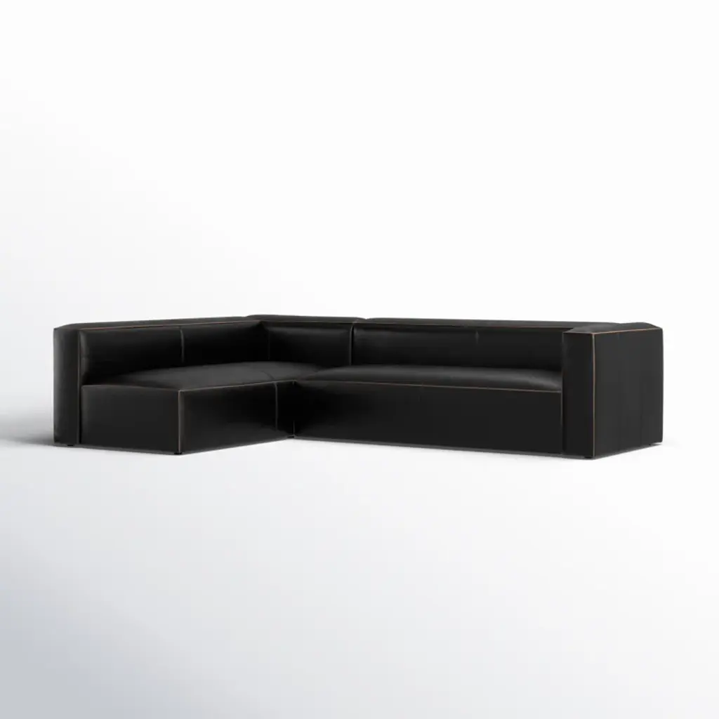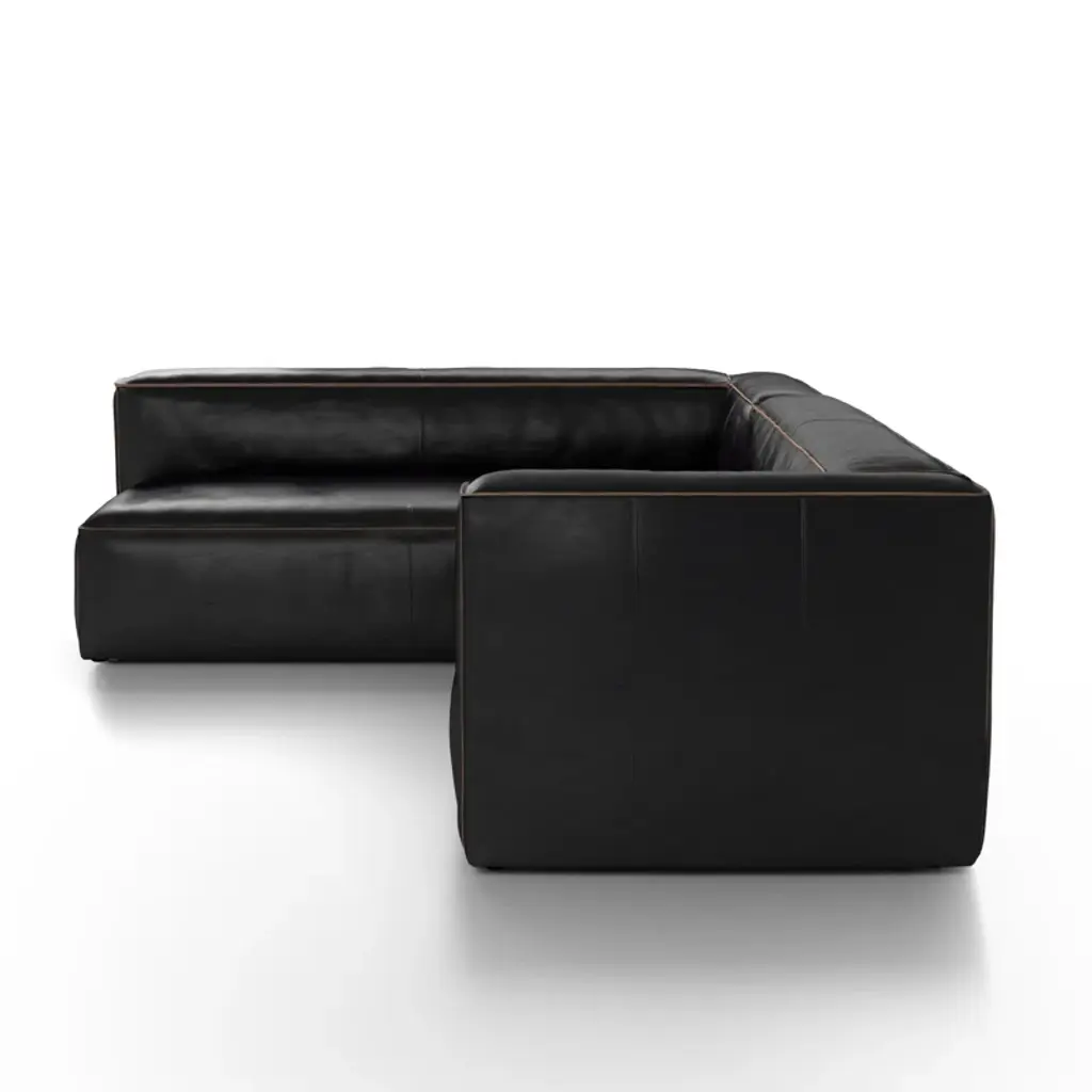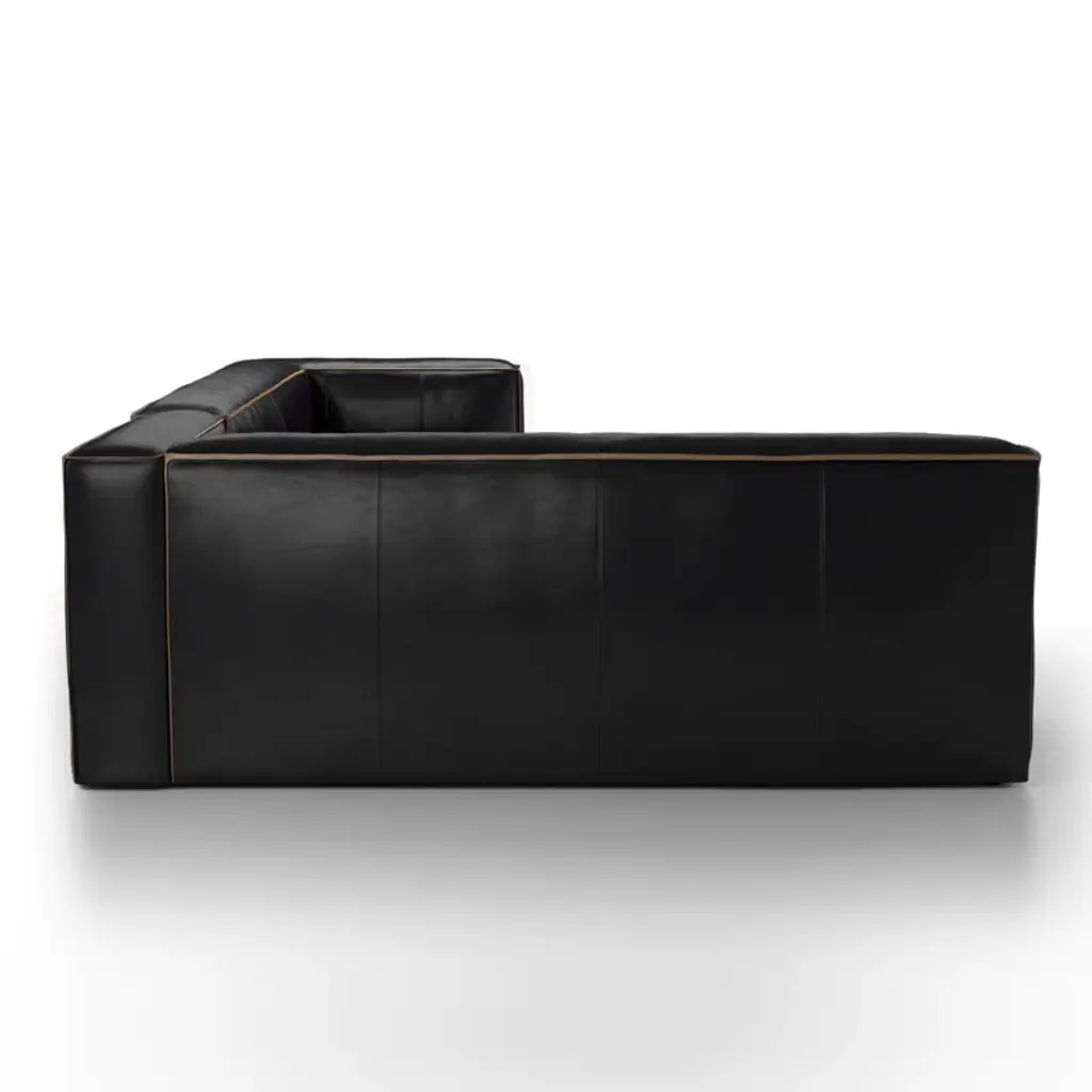 Inspired by centuries of design from old world libraries, these pieces re-invent classic themes for timeless elegance. Top-grain, hand-finished leathers feel worn, adding interest and age to modern frames. Unexpected materials push boundaries and redefine luxury, with strong attention to detail, complicated shapes and intricate patterns. Timeless comfort is captured in this favorite sectional. Clean lines, sleek cushioning and refined arms are covered in distressed, rider black leather with antique brass nailhead detailing.