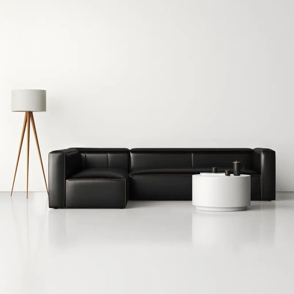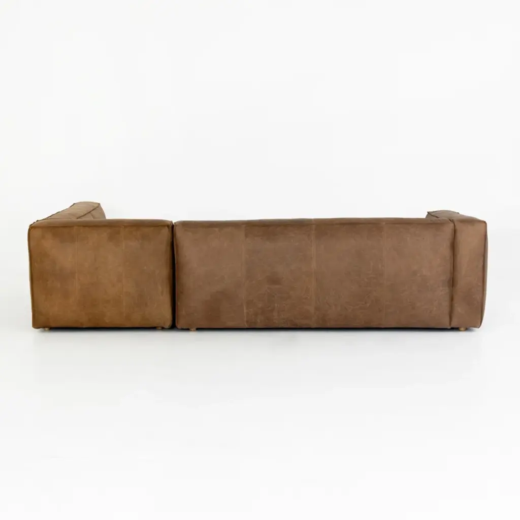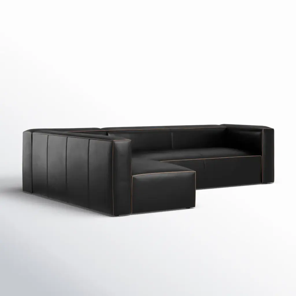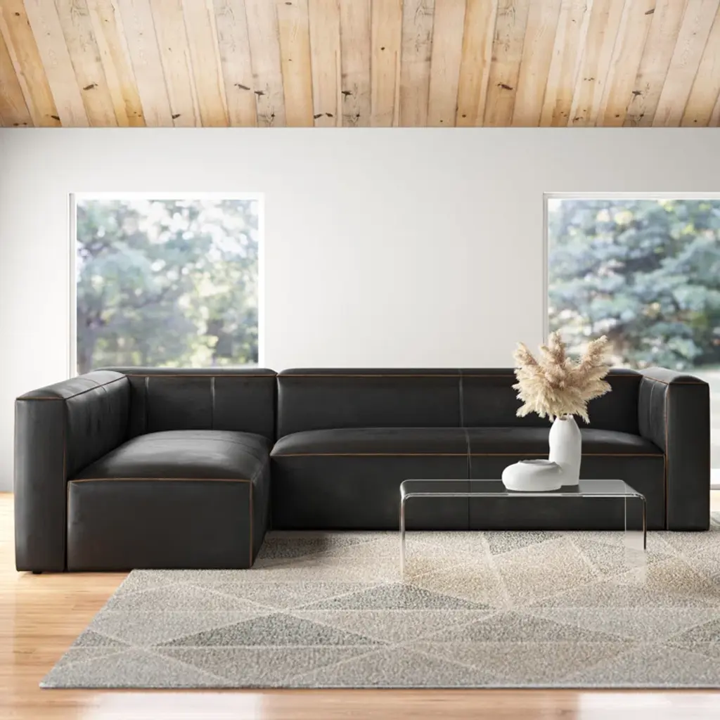 Inspired by centuries of design from old world libraries, these pieces re-invent classic themes for timeless elegance. Top-grain, hand-finished leathers feel worn, adding interest and age to modern frames. Unexpected materials push boundaries and redefine luxury, with strong attention to detail, complicated shapes and intricate patterns. Timeless comfort is captured in this favorite sectional. Clean lines, sleek cushioning and refined arms are covered in distressed, rider black leather with antique brass nailhead detailing.