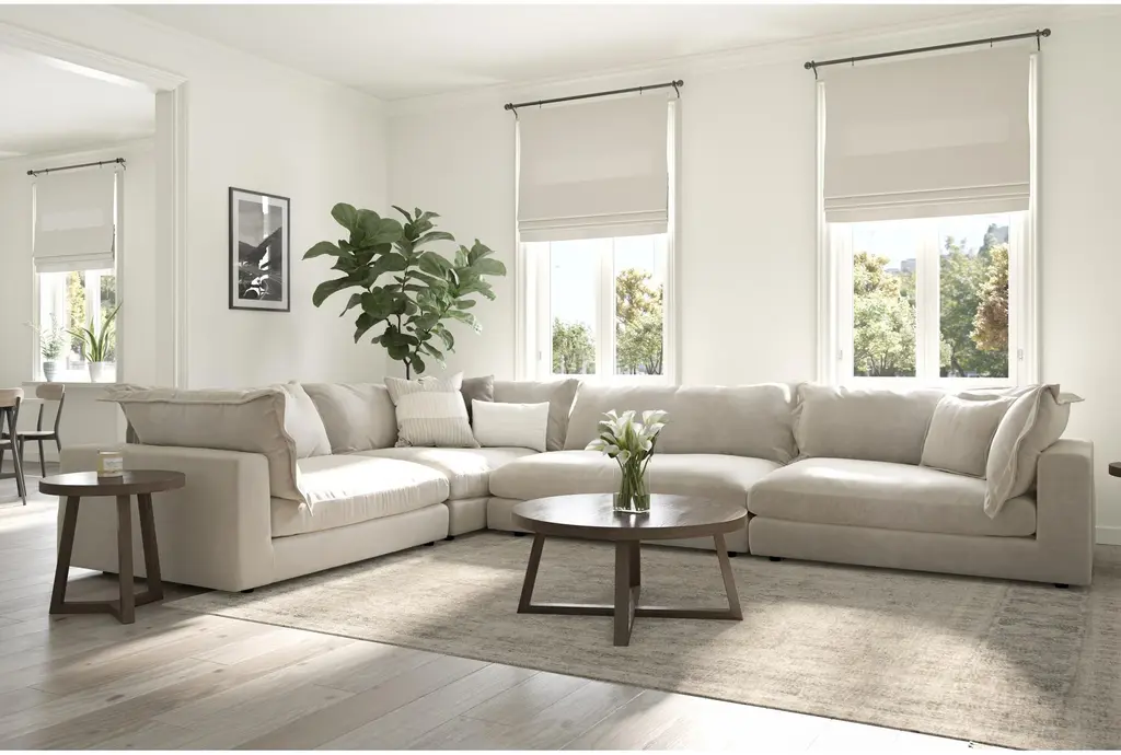 The Supreme Lounger Beige Cobblestone Fabric 4 Piece Oversized Modular U-Shaped Sectional with Right Arm Facing Chaise brings ultimate comfort and style to your living room. This modular sectional is designed to provide ample seating space for family and friends while adding a cozy touch to your home. The neutral beige color effortlessly complements any decor, making it a versatile addition to your space.