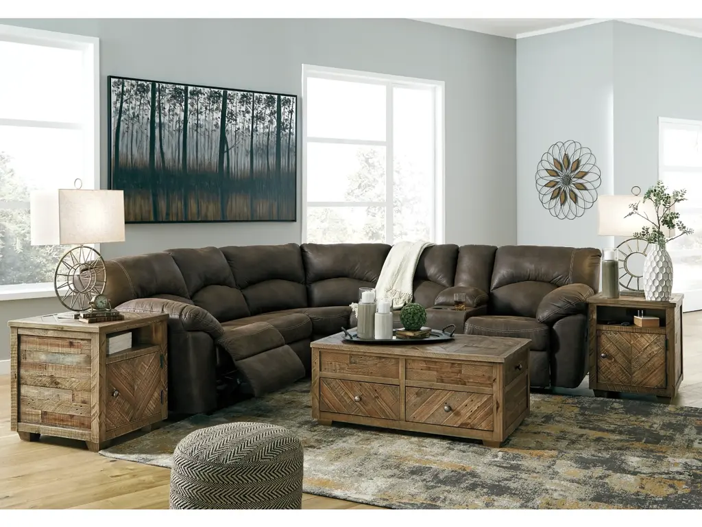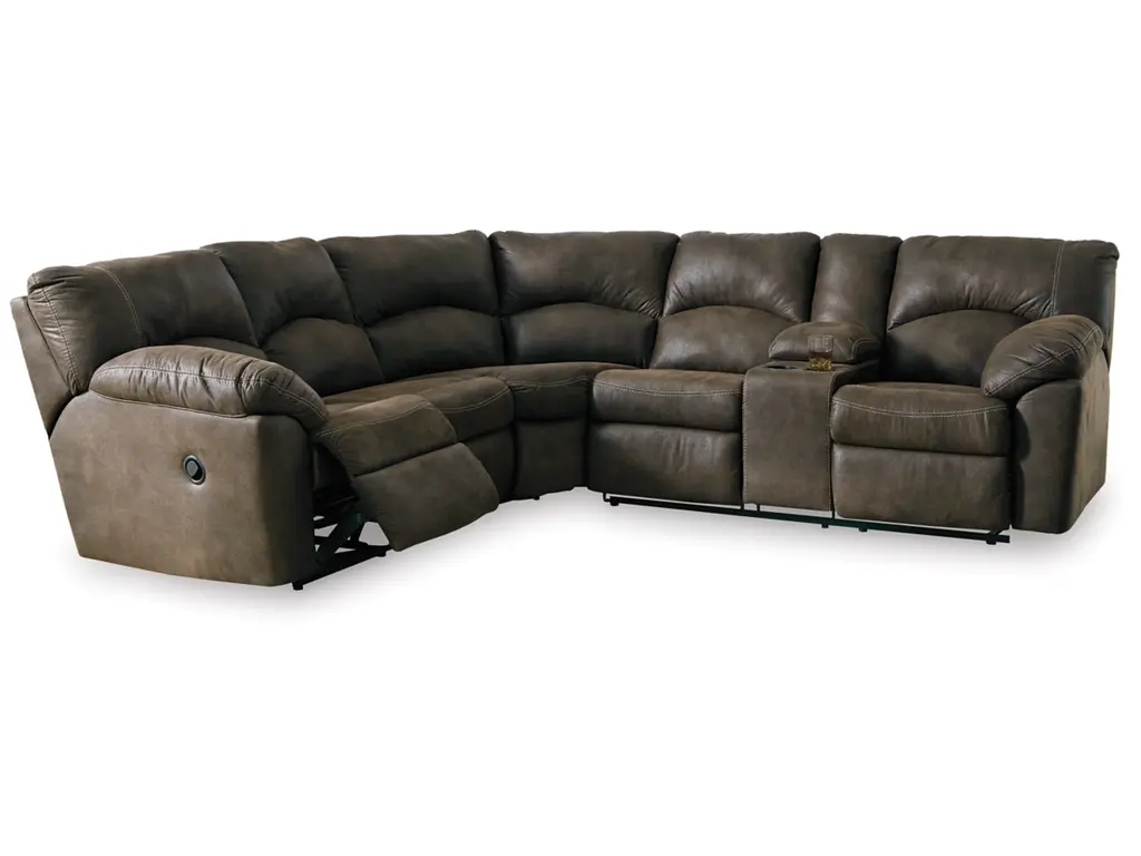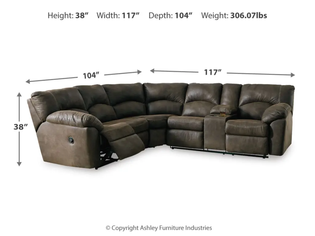 With plush cushions and wraparound pillow top arms, the Tambo sectional takes comfort to a whole new level. Faux vintage leather requires minimal care, ma this relaxation station ideal in homes with children and pets. Reclining feature engages with the pull of a tab, putting pleasure at your fingertips.