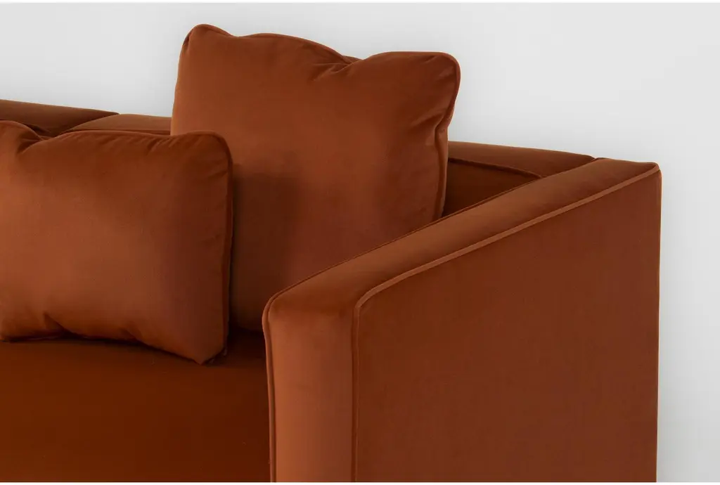 Experience the perfect blend of style and comfort with the Tao Burnt Sienna Velvet 115" 5 Piece Modular Sectional With Ottoman. This modern, symmetrical sectional features a luxurious burnt sienna velvet fabric that adds a warm, sophisticated touch to your living room. Its modular design allows you to easily configure the pieces to fit your space and lifestyle, making it a versatile addition to any home.