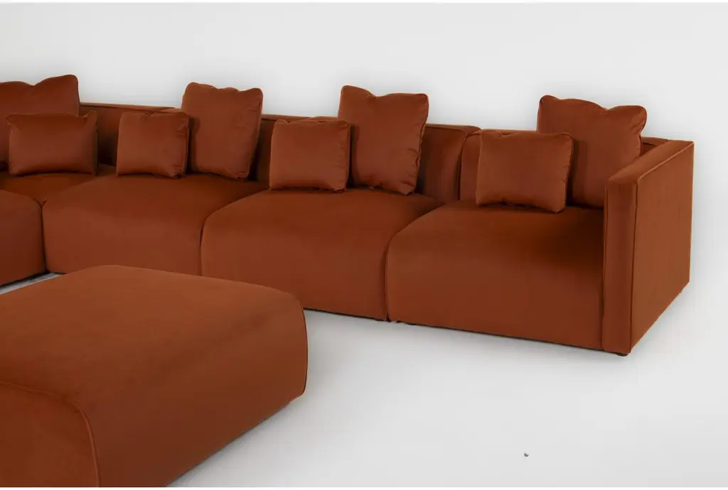 Transform your living space with the Tao Burnt Sienna Velvet 152" 6 Piece Modular Sectional With Ottoman. This modern sectional offers versatile seating options and a rich burnt sienna color that will add warmth and style to any room. The velvet fabric ensures a luxurious feel and durable comfort.