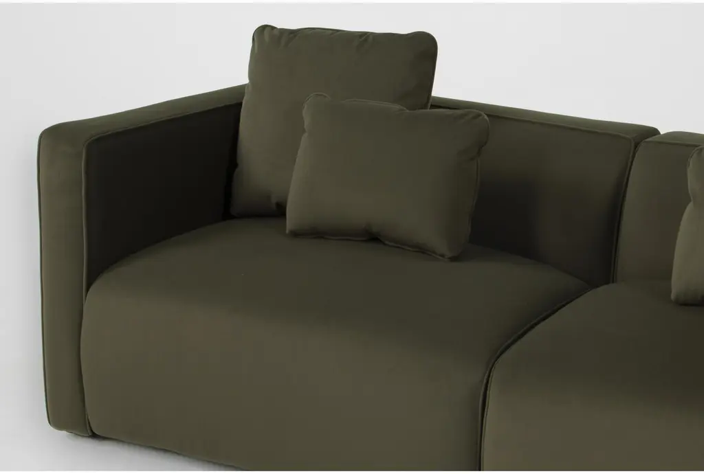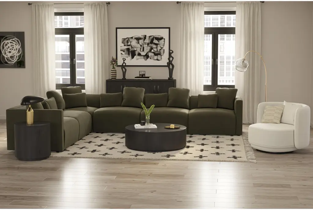 Tao Olive Green Velvet 152" 6 Piece Modular Sectional Sofa With Ottoman creates a luxurious lounge experience with its adaptable design and plush upholstery in rich olive green tones. This elegant furniture piece functions as both a sectional couch and movable seating solution for your living space, making it one of our most customizable sofas.