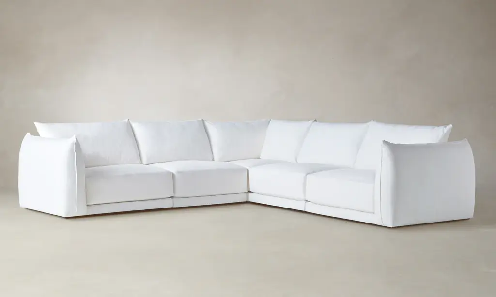 The Jones Sectional's low-lying, modular design recalls silhouettes from the 1970s. It has voluminous cushions and plush arms complete with flange seams for a tailored finish. Handcrafted in North Carolina.
