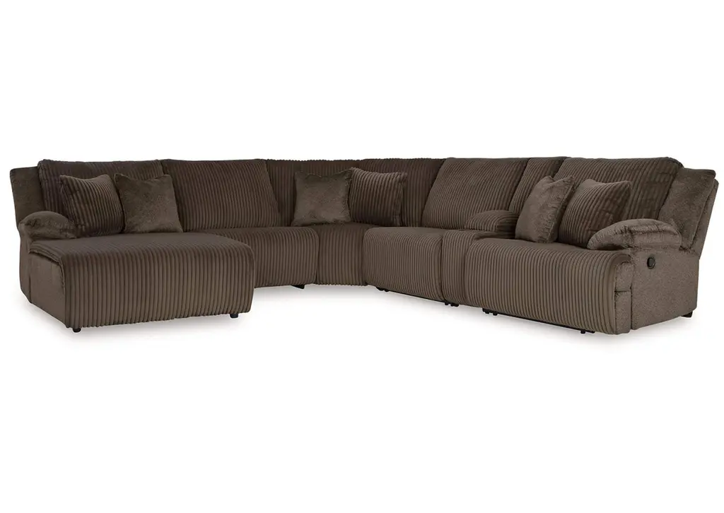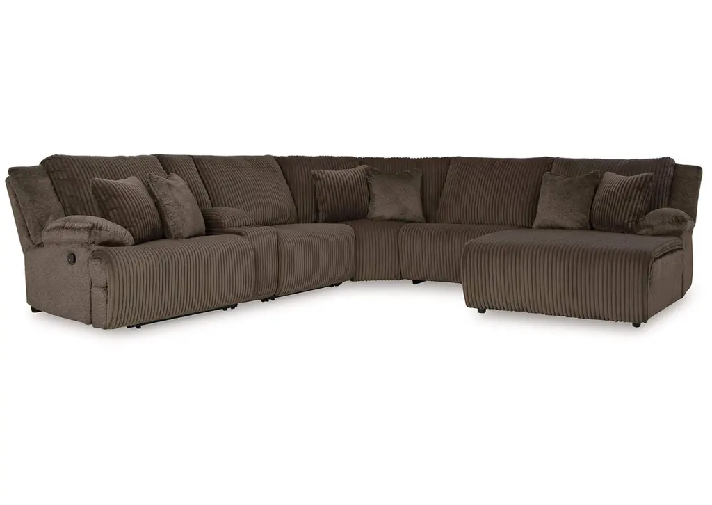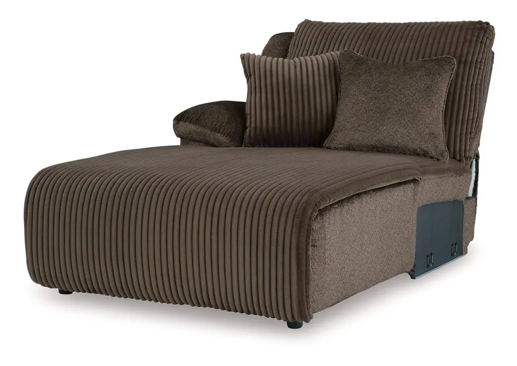 Experience unparalleled comfort with the Top Tier reclining sectional with chaise. It’s a stylish and invitingly soft look—made all the more appealing by cozy corduroy cushions that feel great and add a touch of texture. The rich chocolate brown upholstery effortlessly blends into your decor, making it a gorgeous addition to your home. So sit back and unwind in this spacious set, perfect for gatherings with friends and family. Weight 373.000 lbs. (167.85kgs.)