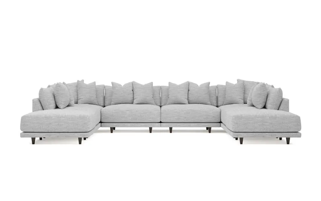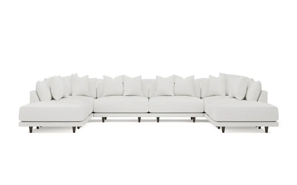 The 166” Toulouse modular U-shaped sectional is a foundational piece for great rooms. With deep seating and oh-so-many plush pillows for sink-in comfort, the modern silhouette is delightfully relaxed. Recessed wood legs are hidden from sight, giving the sofa the appearance of floating. Lofted cushions are soft and supportive, with a foam core surrounded by a blend of fiber, down, and feather fill. Choose from a variety of upholstery options, including linen, velvet, and performance fabrics.