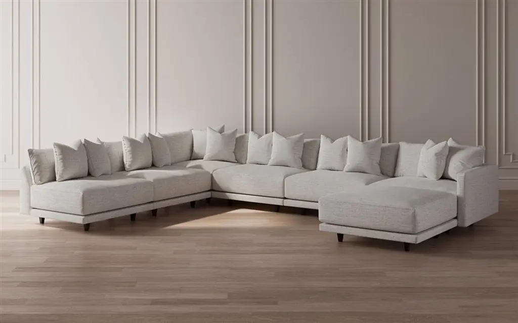 The right 171” Toulouse modular corner sectional is a family room’s perfect companion. With deep seating and oh-so-many plush pillows for sink-in comfort, the modern silhouette is delightfully relaxed. Recessed wood legs are hidden from sight, giving the sofa the appearance of floating. Lofted cushions are soft and supportive, with a foam core surrounded by a blend of fiber, down, and feather fill. Choose from a variety of upholstery options, including linen, velvet, and performance fabrics.