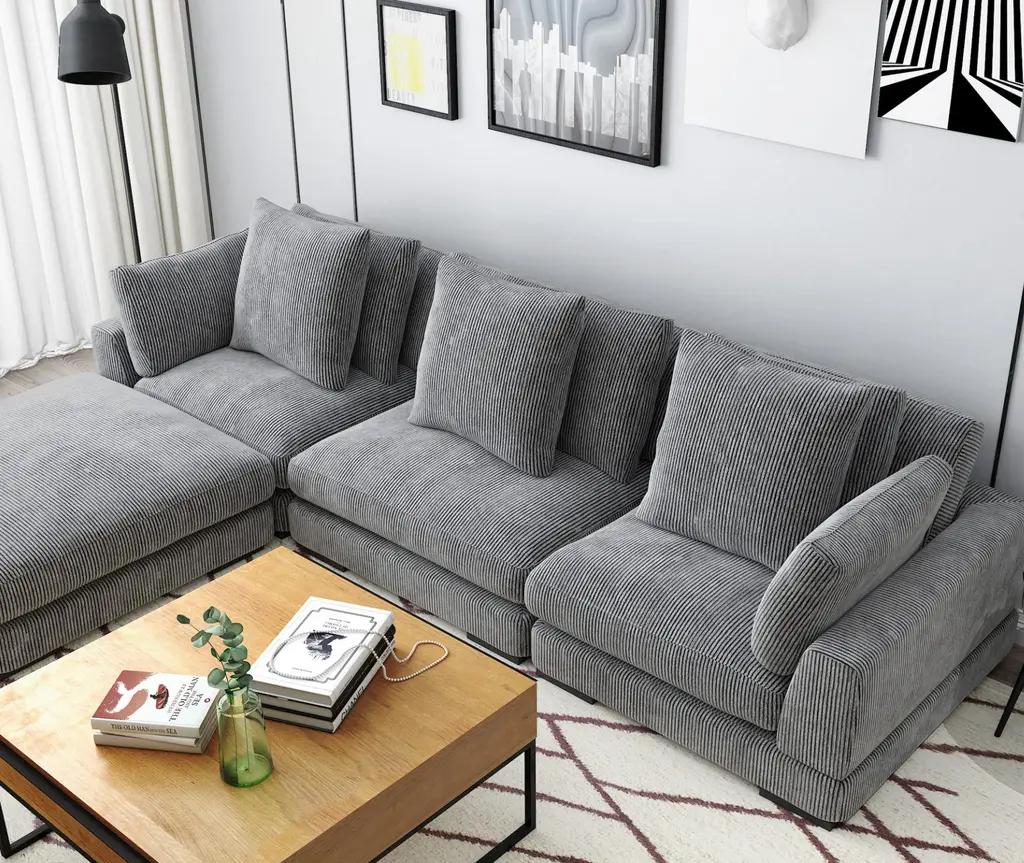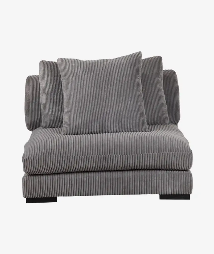 Seriously comfortable, seriously stylish - the Tumble is an ideal modular dream. Either at home or in your commercial space, you can get cozier & cushier using furniture that encourages the softer moments of calm and focus - just like Tumble's mix and match modular pieces. Tumble's corduroy naturally softens the sharp edges and hard lines of other accents like coffee and end tables with its inherent plushness. Framed in solid eucalyptus wood with extra, fully down-filled, removable back cushions. This sectional's soft corduroy will immediately add dimension, intrigue, lift, and comfort to any environment.