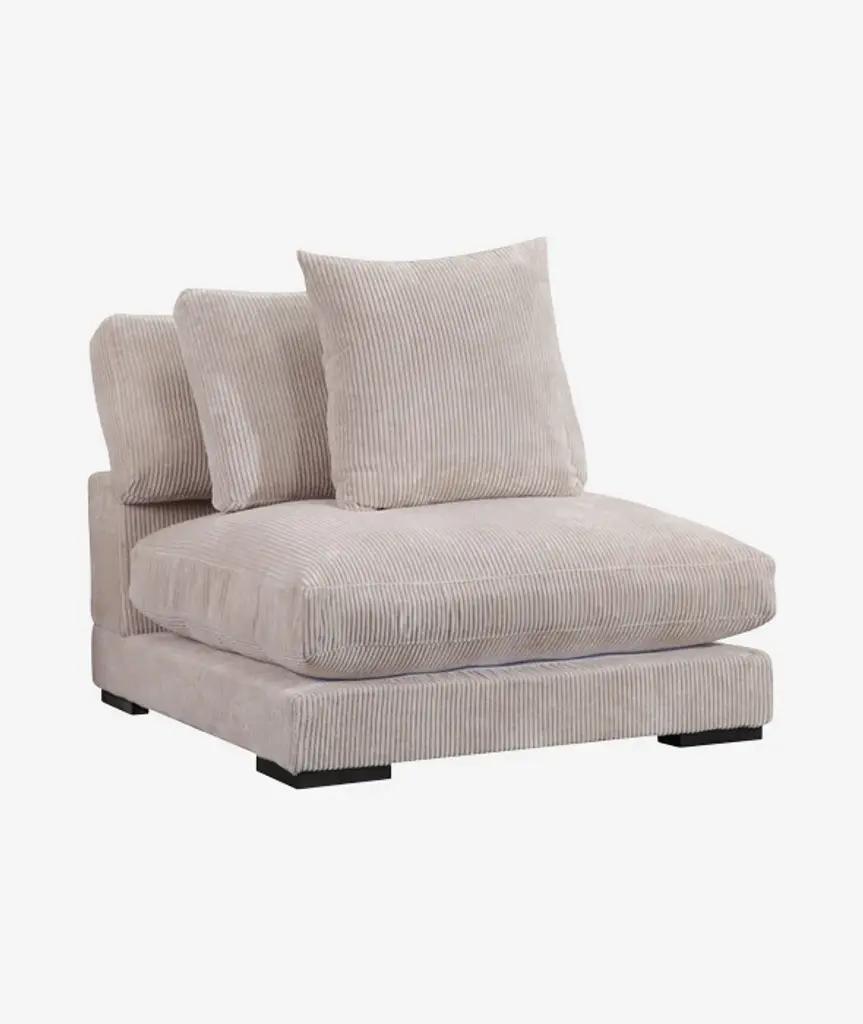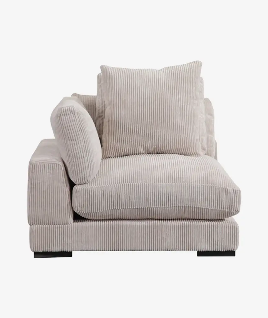 Seriously comfortable, seriously stylish - the Tumble is an ideal modular dream. Either at home or in your commercial space, you can get cozier & cushier using furniture that encourages the softer moments of calm and focus - just like Tumble's mix and match modular pieces. Tumble's corduroy naturally softens the sharp edges and hard lines of other accents like coffee and end tables with its inherent plushness. Framed in solid eucalyptus wood with extra, fully down-filled, removable back cushions. This sectional's soft corduroy will immediately add dimension, intrigue, lift, and comfort to any environment.
