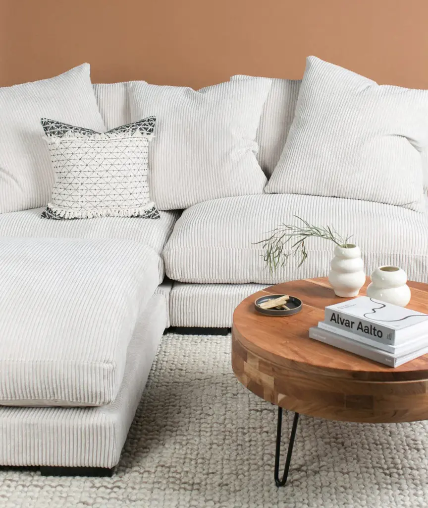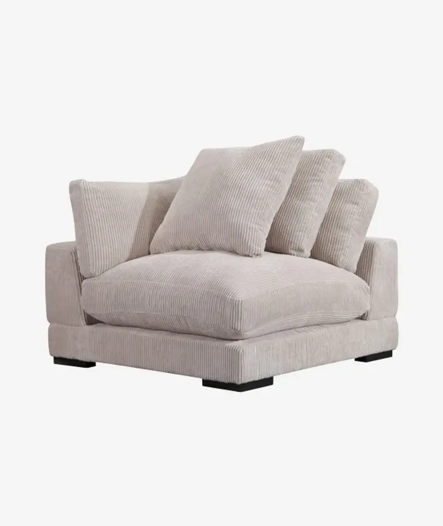 Seriously comfortable, seriously stylish - the Tumble is an ideal modular dream. Either at home or in your commercial space, you can get cozier & cushier using furniture that encourages the softer moments of calm and focus - just like Tumble's mix and match modular pieces. Tumble's corduroy naturally softens the sharp edges and hard lines of other accents like coffee and end tables with its inherent plushness. Framed in solid eucalyptus wood with extra, fully down-filled, removable back cushions. This sectional's soft corduroy will immediately add dimension, intrigue, lift, and comfort to any environment.
