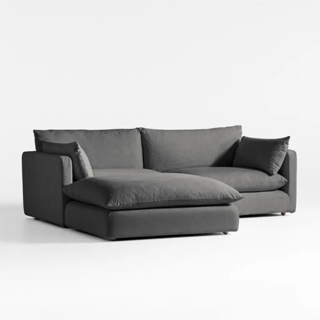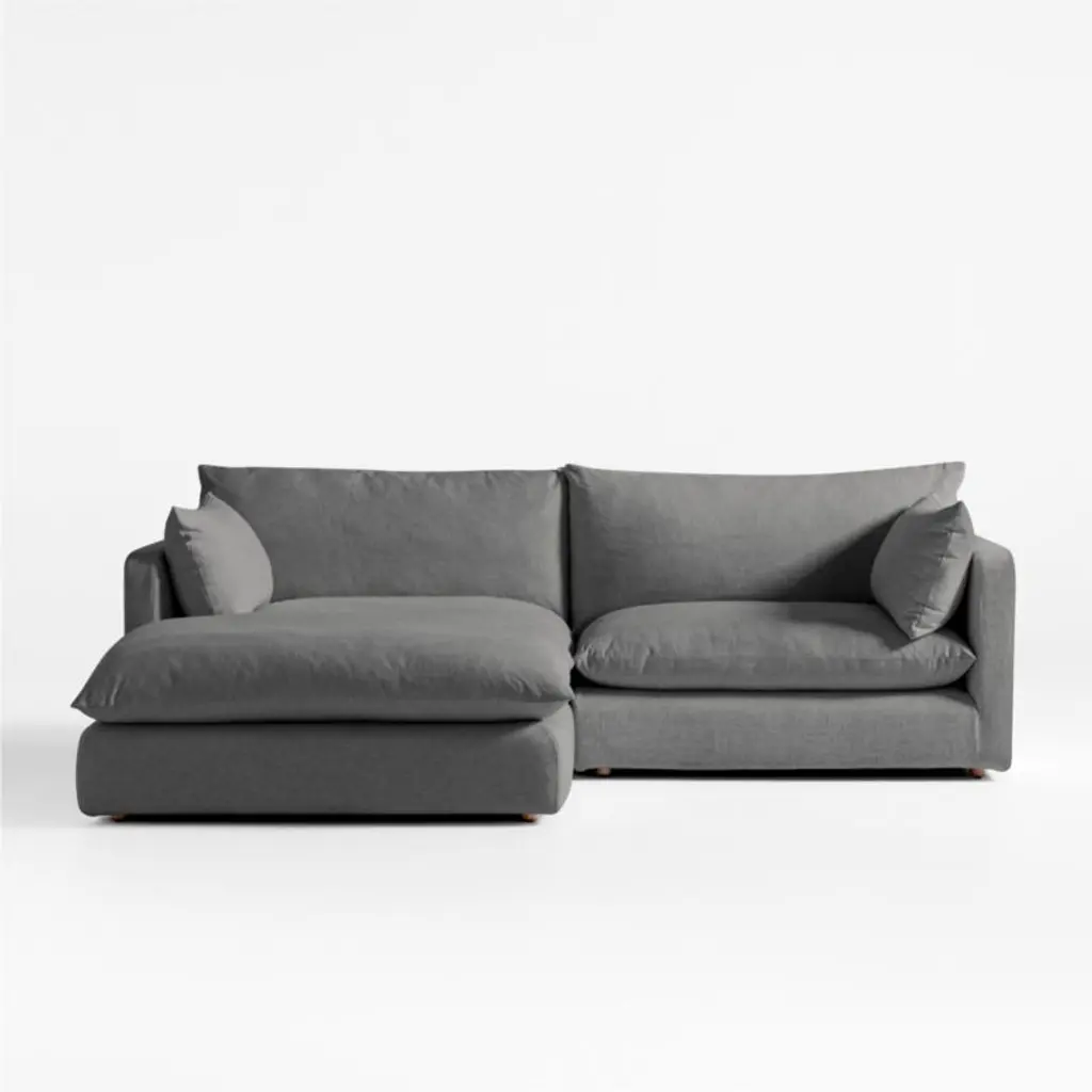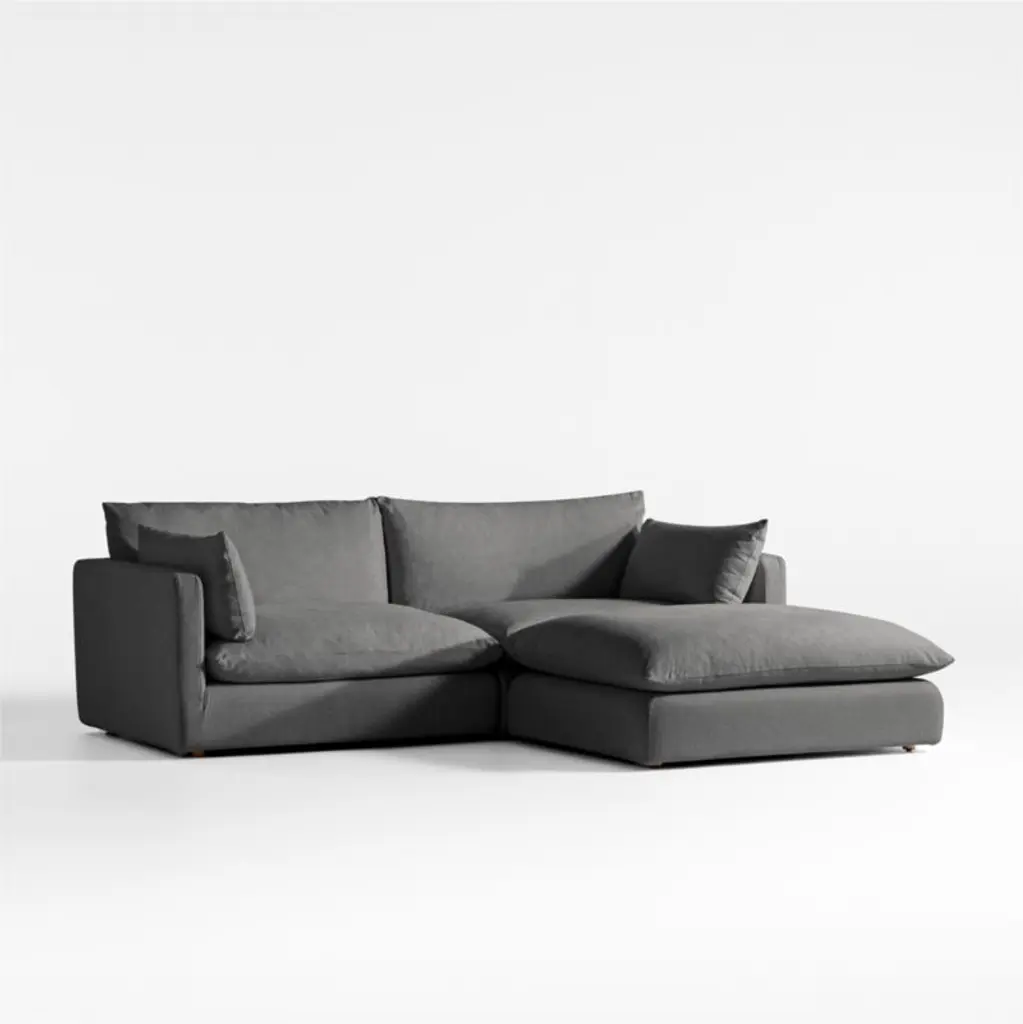 It's time to Unwind with our coastal-cool slipcovered sectional collection. Named after our favorite thing to do, this modern beauty delivers with sumptuous sink-in cushions and relaxing proportions. Slim arms and low decks that make room for pillowy back and seat cushions for an exceptionally deep and comfortable sit. To give you more flexibility, the three-piece reversible sectional combination allows you to pull the ottoman up to either the left- or right-side chair for chaise-style seating. We love the natural feel and slubby texture of the slipcovers, made of a breezy blend of cotton, linen and viscose yarns.