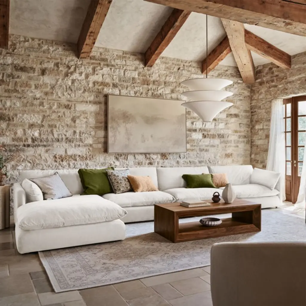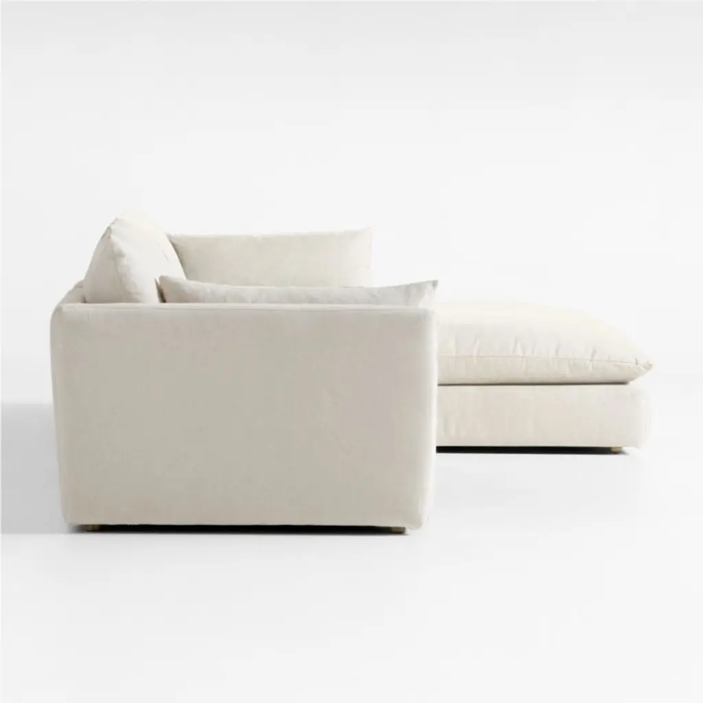 It's time to Unwind with our coastal-cool slipcovered sectional collection. Named after our favorite thing to do, this modern beauty delivers relaxing proportions and sumptuous sink-in cushions. Comprising a left-arm chair, armless chair and right-arm chaise, the three-piece sectional features slim arms and low decks that make room for pillowy back and seat cushions for an exceptionally deep, comfortable sit. We love the natural feel and slubby texture of the slipcovers, made of a breezy blend of cotton, linen and viscose yarns.