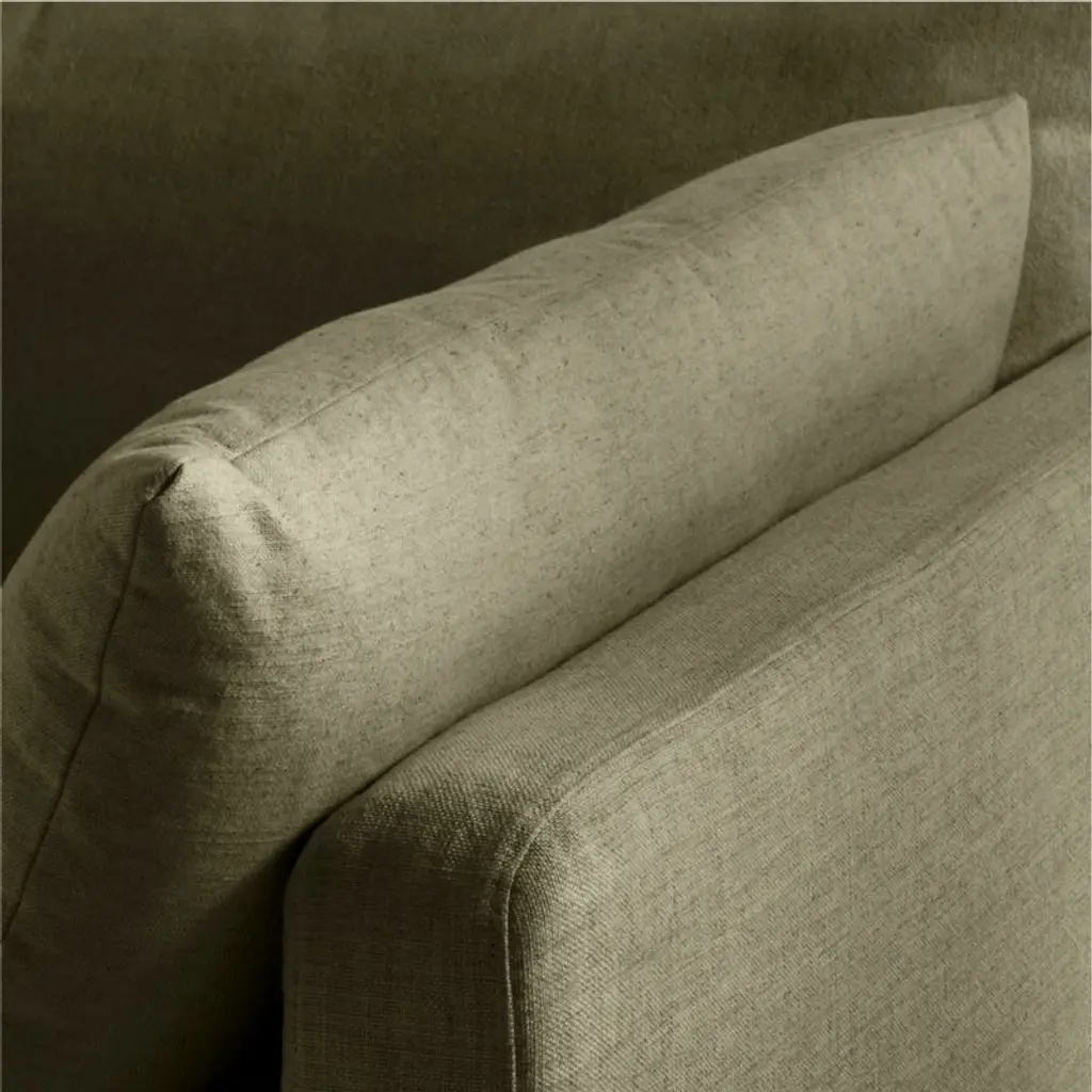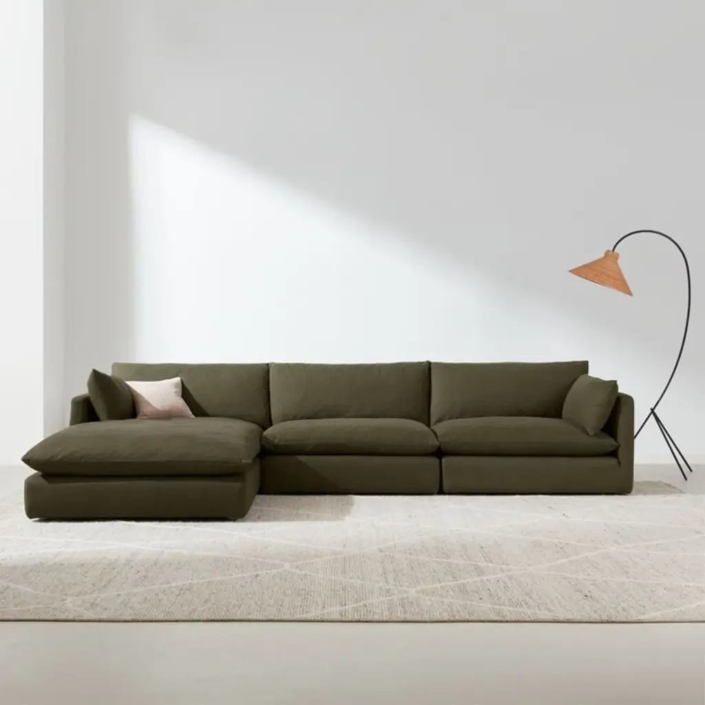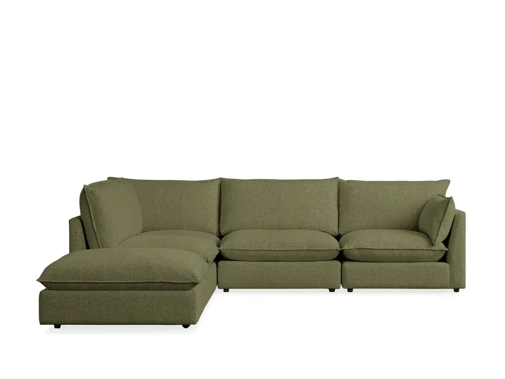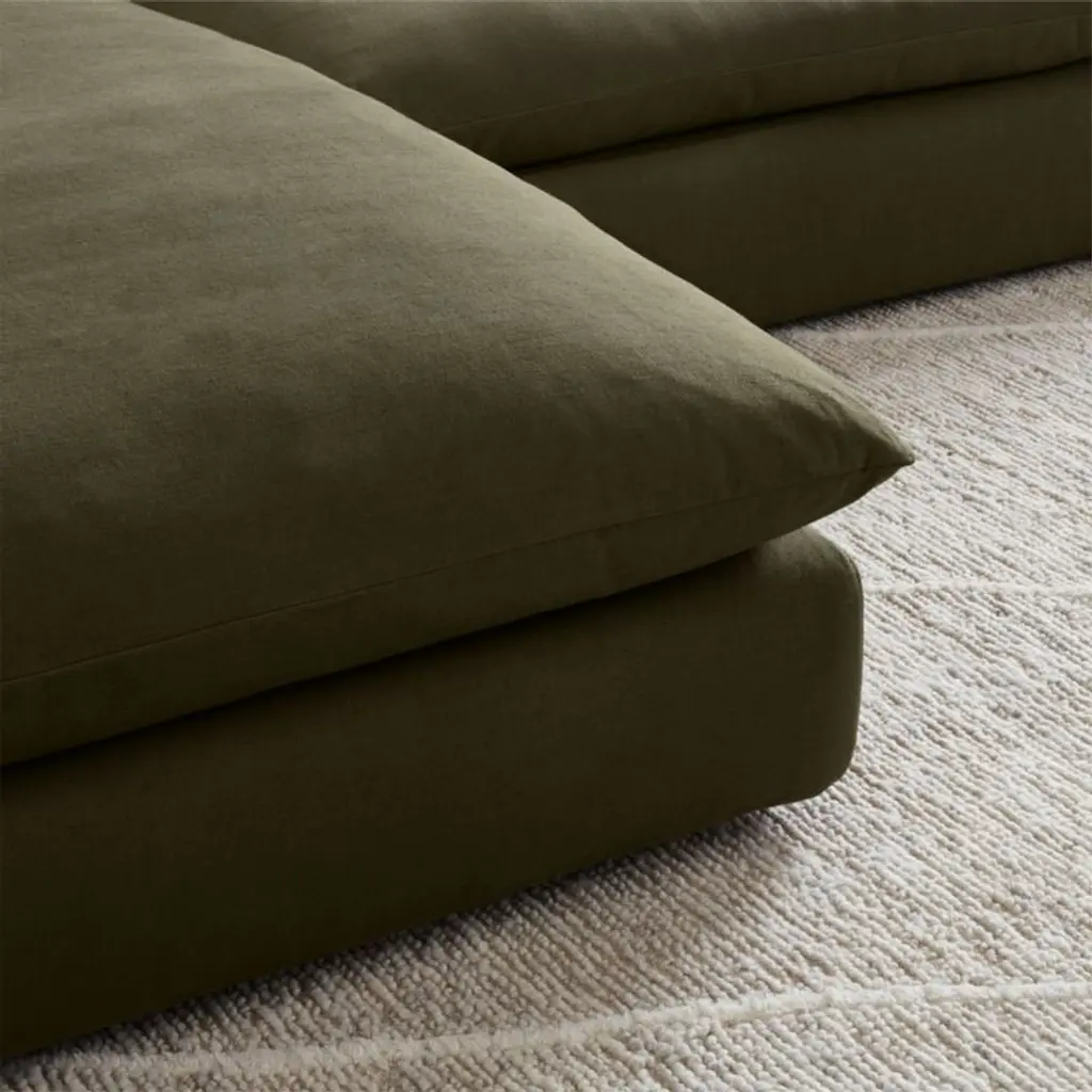 It's time to Unwind with our coastal-cool slipcovered sectional collection. Named after our favorite thing to do, this modern beauty delivers with sumptuous sink-in cushions and relaxing proportions. Consisting of an armless chair flanked by right- and left-hand chairs plus two ottomans, the five-piece sectional features slim arms and low decks that make room for pillowy back and seat cushions for an exceptionally deep and comfortable sit. We love the natural feel and slubby texture of the slipcovers, made of a breezy blend of cotton, linen and viscose yarns.