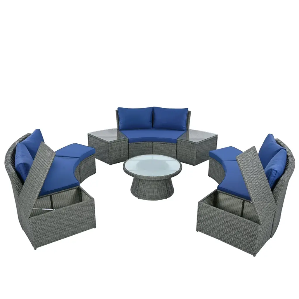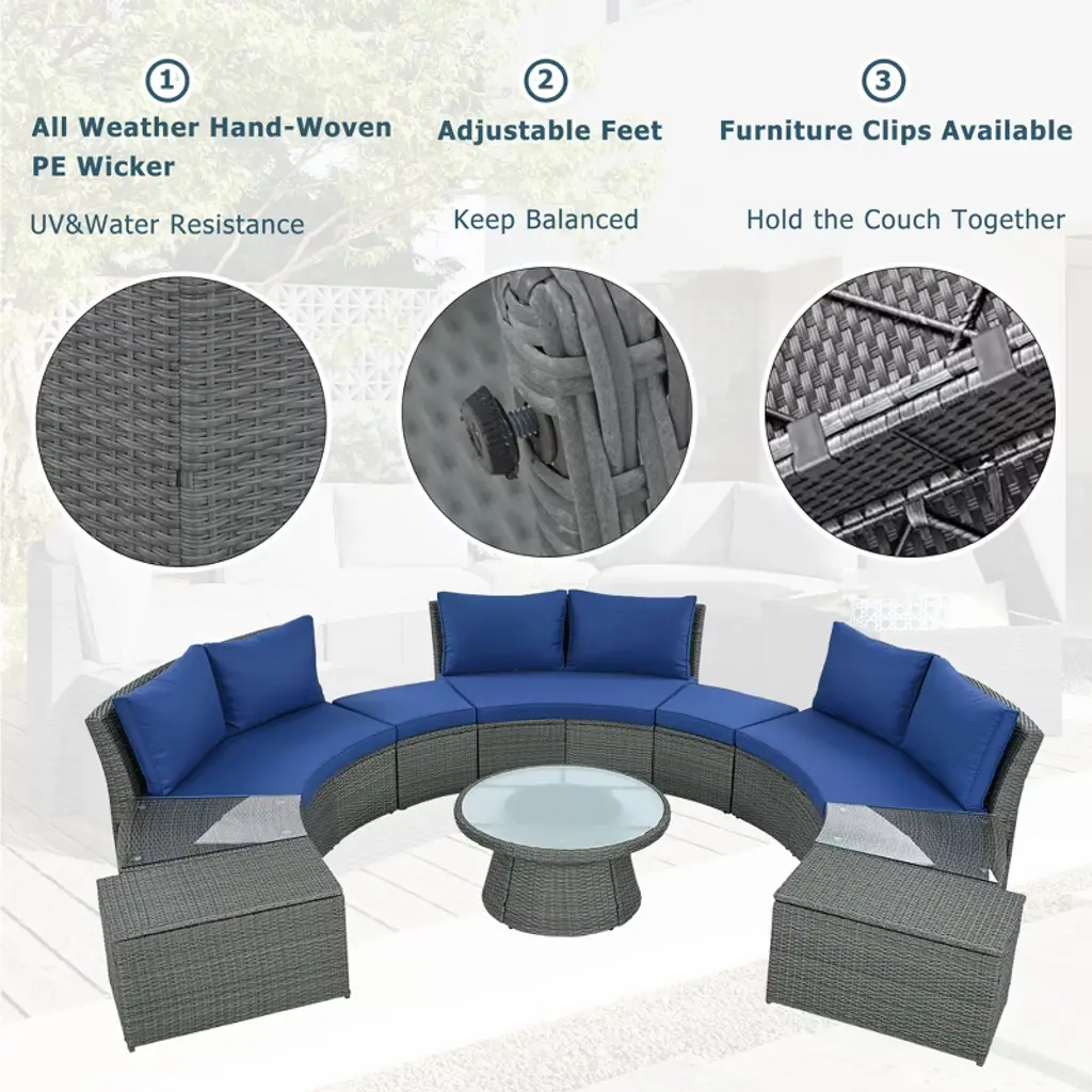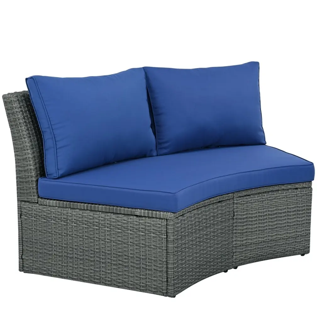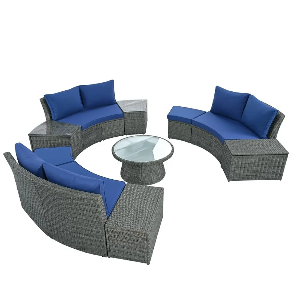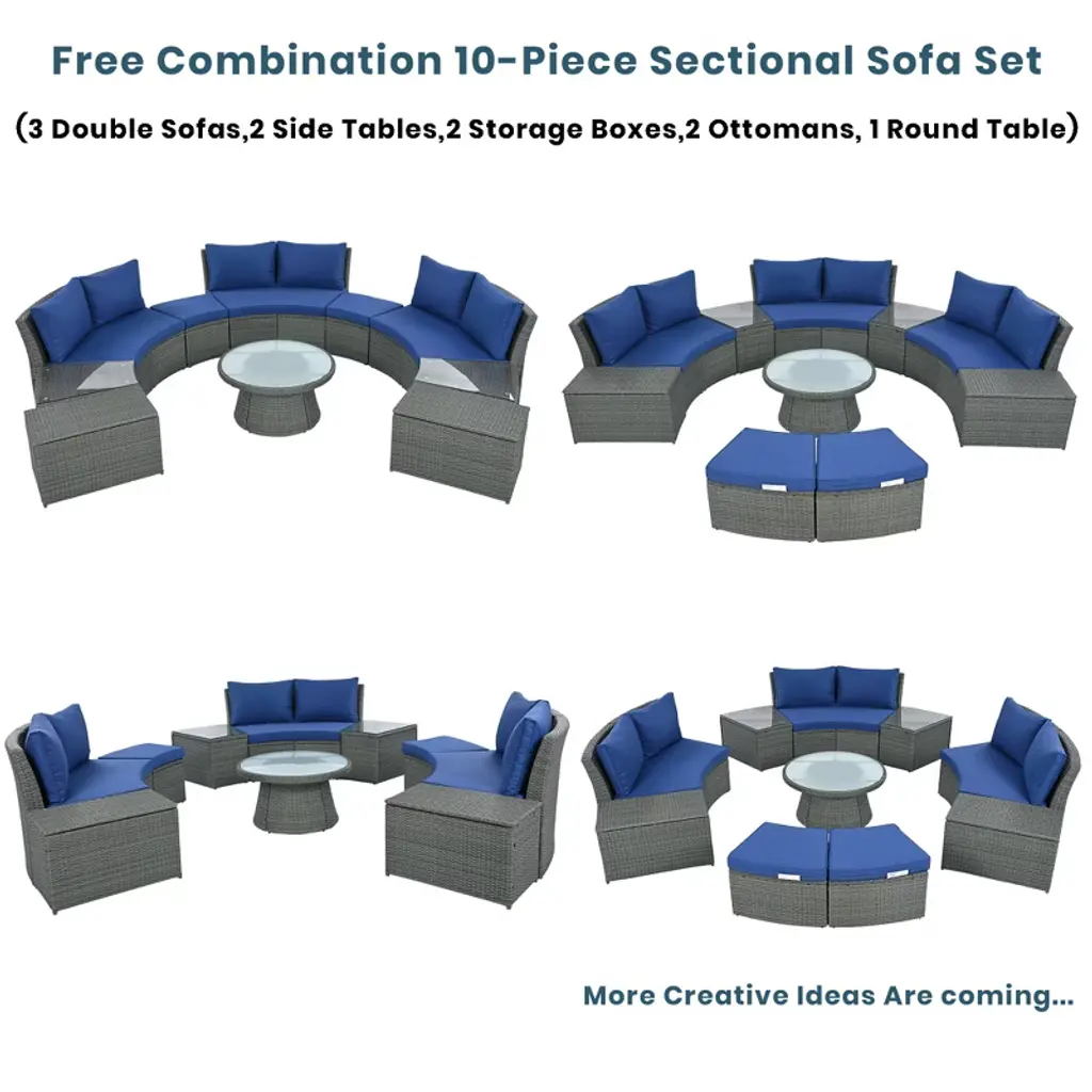 Whisen 10-piece Outdoor Sectional Sofa Set, Half Round Pe Wicker Patio Set For Free Combination - Blue