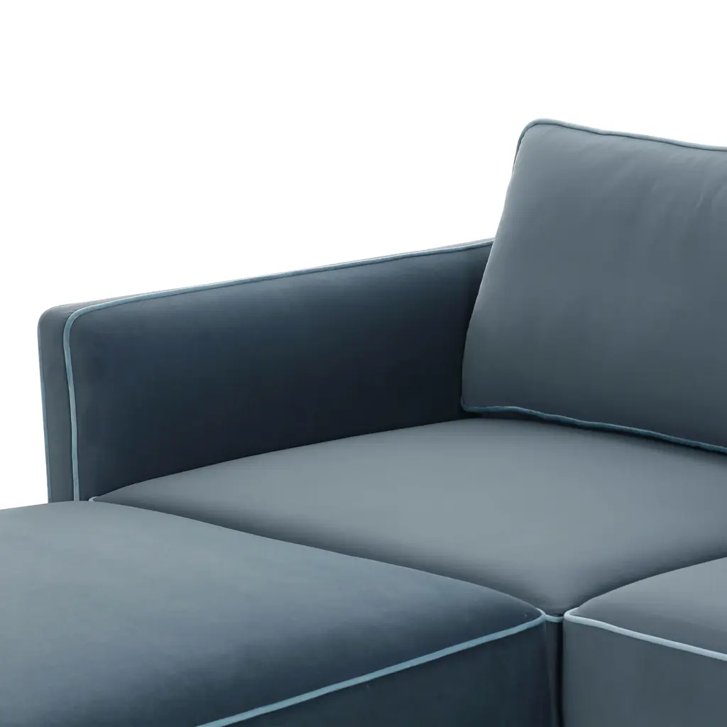 Discover the timeless elegance of the Willow Sectional, a modular masterpiece upholstered in luxurious velvet. This sectional features striking contrast piping in the sophisticated hues of Berry Red, a rich burgundy accented with mauve piping, and Misty Blue, a serene grey-blue with delicate pale blue piping. For those who prefer classic simplicity, the Willow Sectional is also available in solid velvet colors including Taupe, Navy, and Charcoal. With its versatile modular design and plush comfort, the Willow Sectional is the perfect centerpiece for a modern, stylish home.