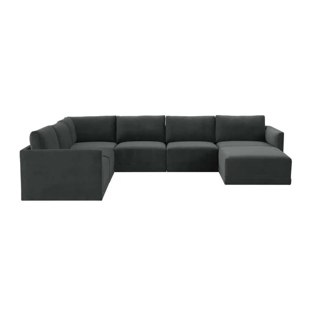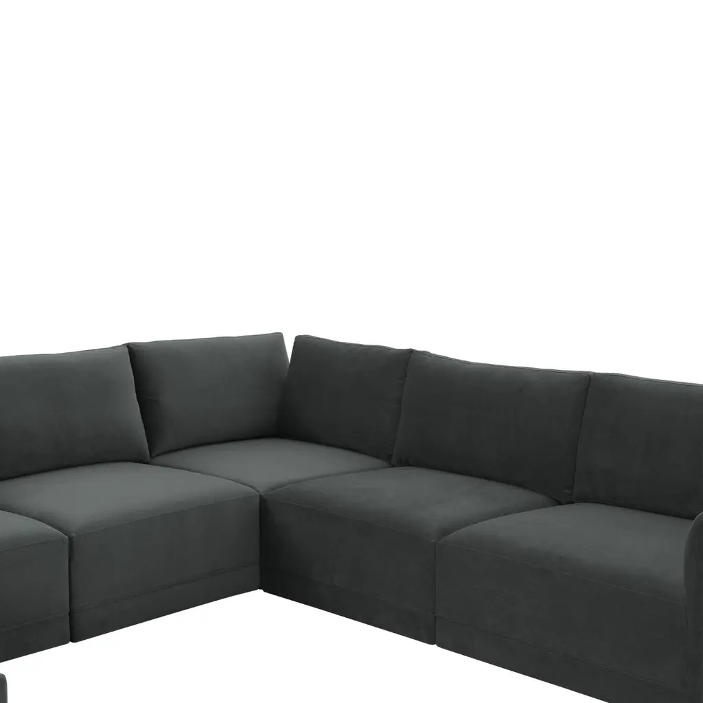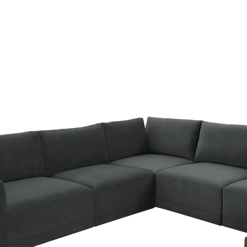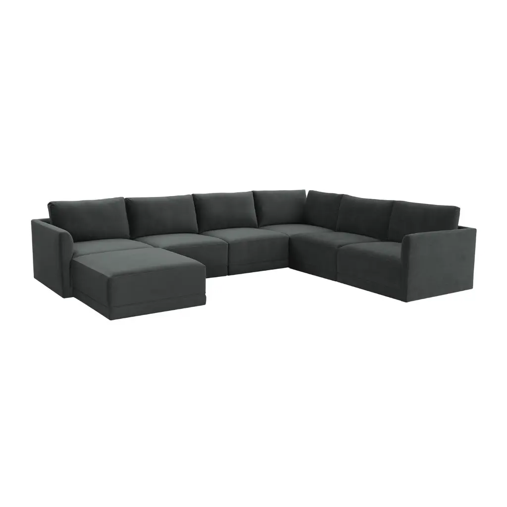 Polished seating at its finest, the Willow Modular Collection, does not disappoint. Simultaneously firm and extraordinarily comfortable, the Willow Modular Collection offers stylish, elegant lounging. Available in 3 luxurious velvet finishes, the Willow Modular Collection can be configured in many ways that will best suit your home. Part of the Willow Collection by TOV Furniture Sectional includes LAF Chair, 3x Armless Chairs, Corner Chair, RAF Chair, and Ottoman Charcoal velvet upholstery Also available in charcoal and navy velvet Connecting brackets connect pieces from the bottom Solid pine and plywood frame High-gauge sinuous springs provide cushion support Seat and back cushions are made with high-resilience foam