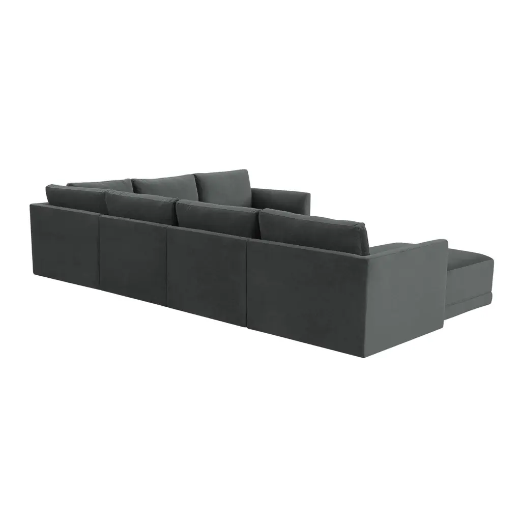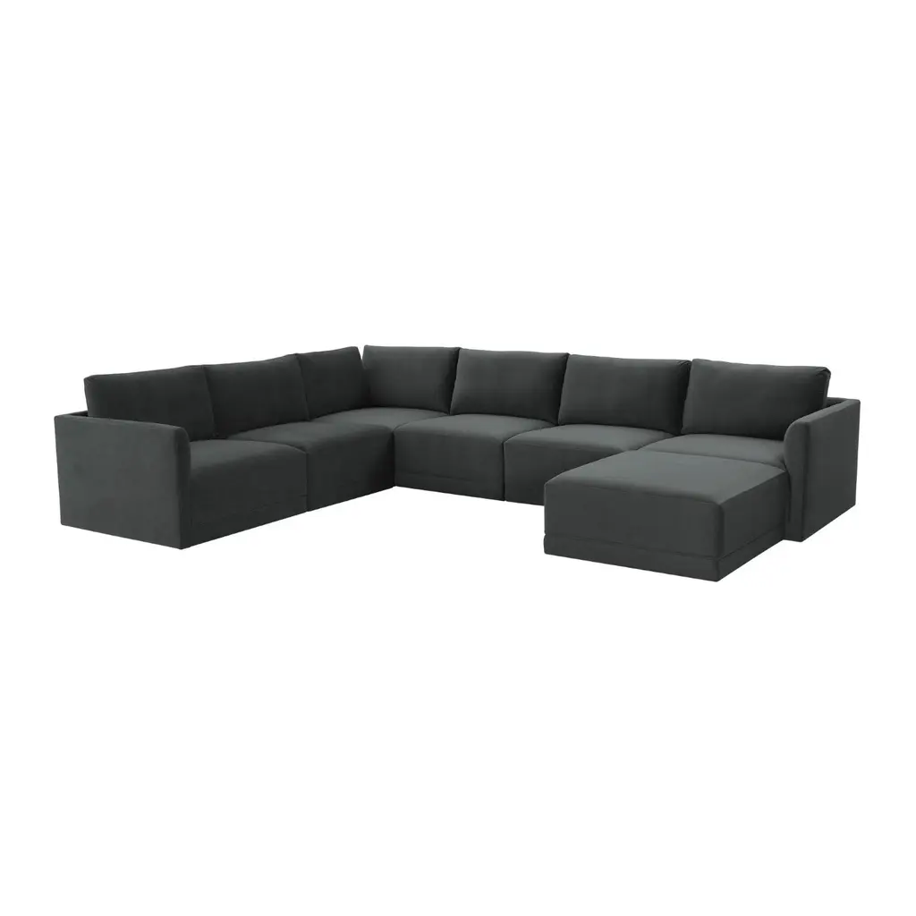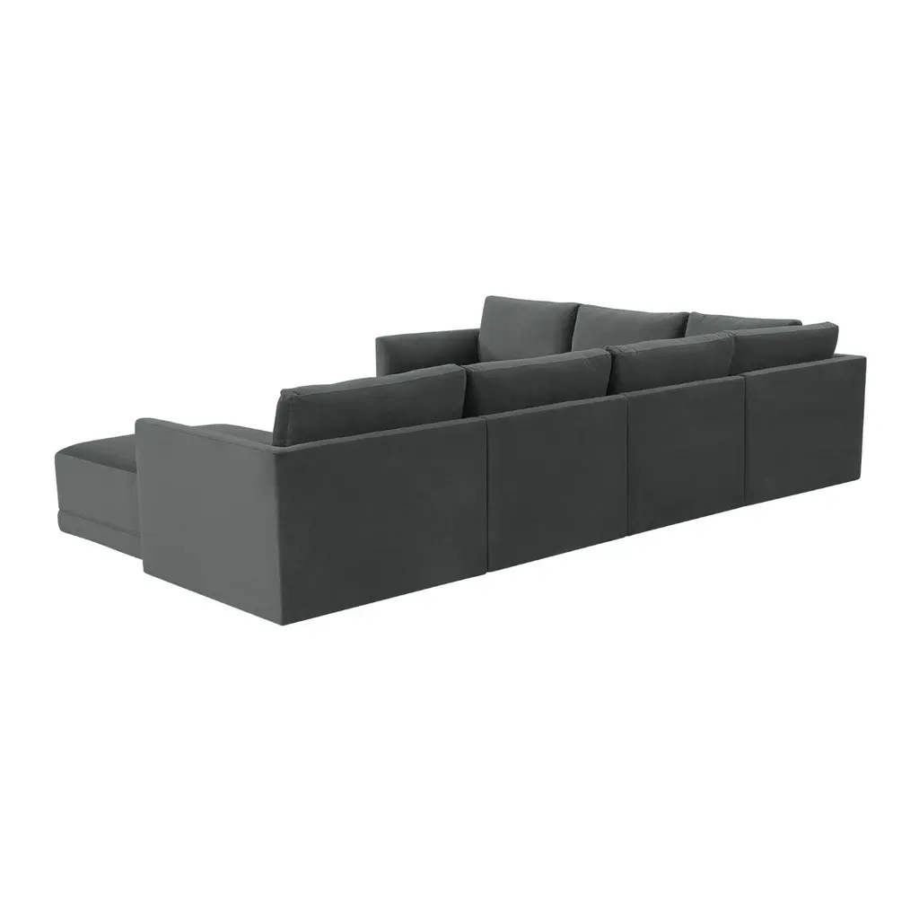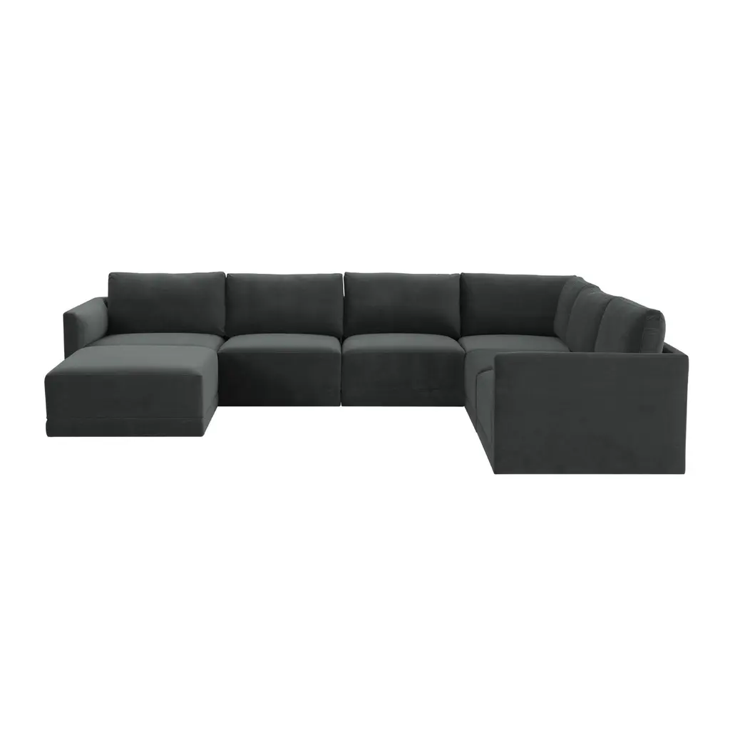 Polished seating at its finest, the Willow Modular Collection, does not disappoint. Simultaneously firm and extraordinarily comfortable, the Willow Modular Collection offers stylish, elegant lounging. Available in 3 luxurious velvet finishes, the Willow Modular Collection can be configured in many ways that will best suit your home. Part of the Willow Collection by TOV Furniture Sectional includes LAF Chair, 3x Armless Chairs, Corner Chair, RAF Chair, and Ottoman Charcoal velvet upholstery Also available in charcoal and navy velvet Connecting brackets connect pieces from the bottom Solid pine and plywood frame High-gauge sinuous springs provide cushion support Seat and back cushions are made with high-resilience foam