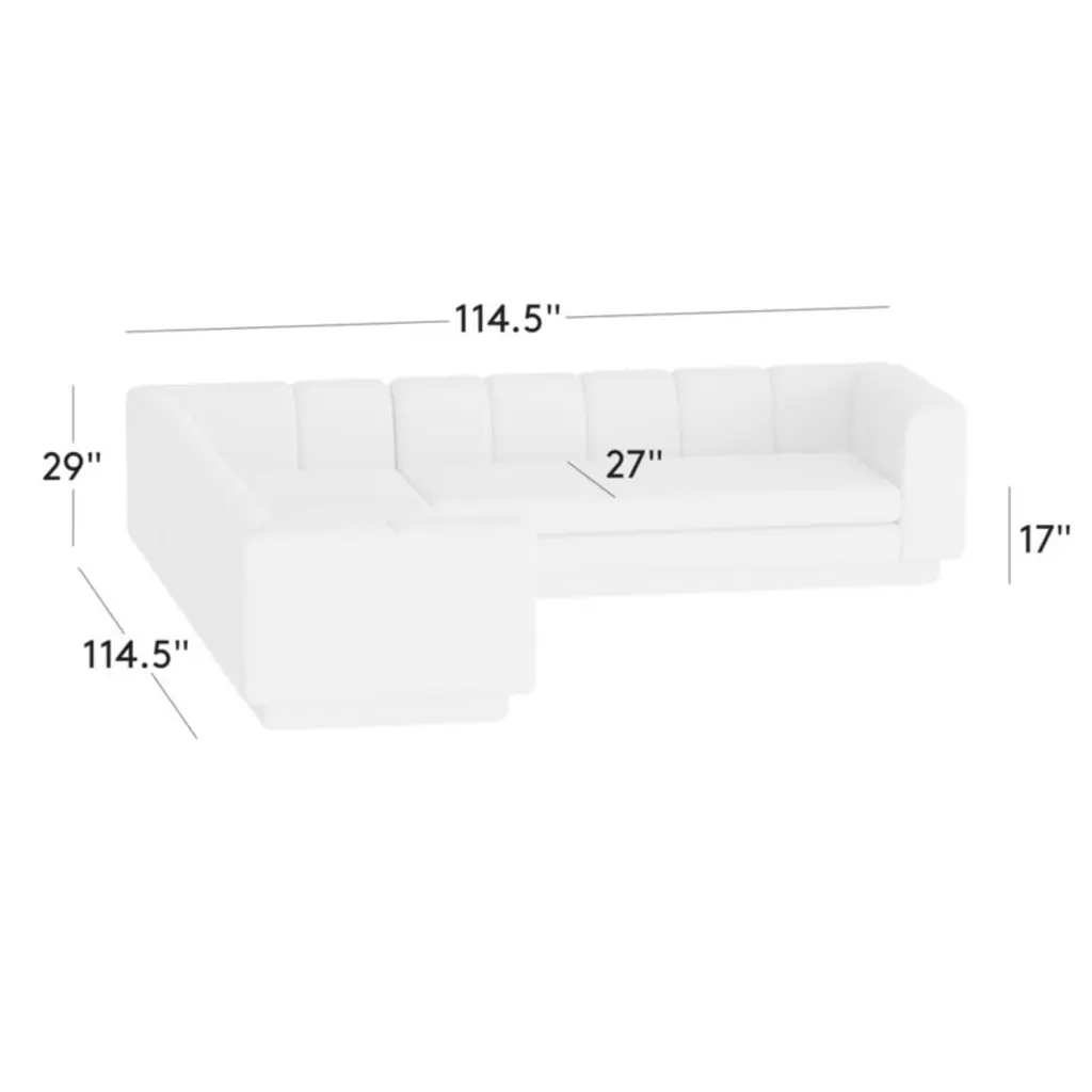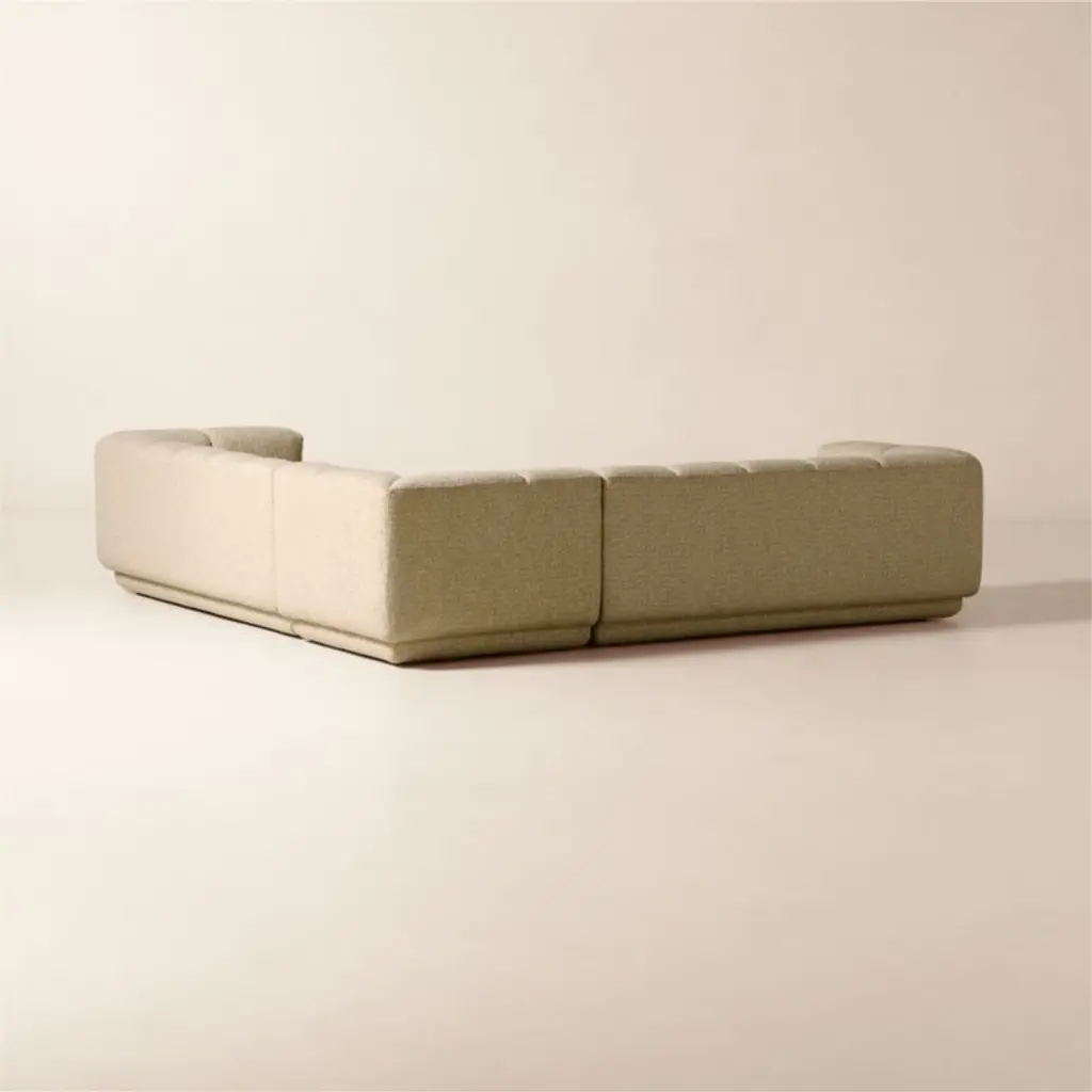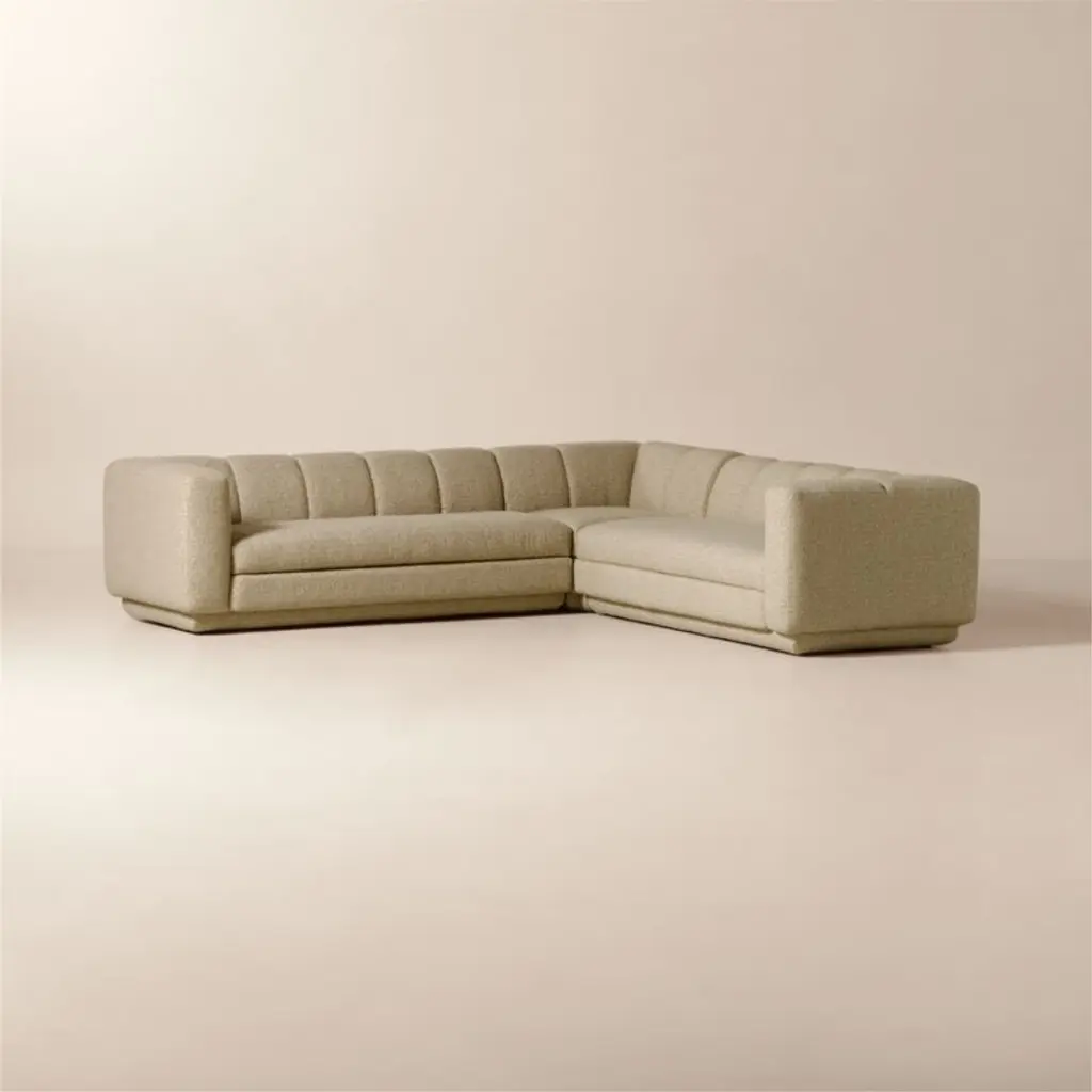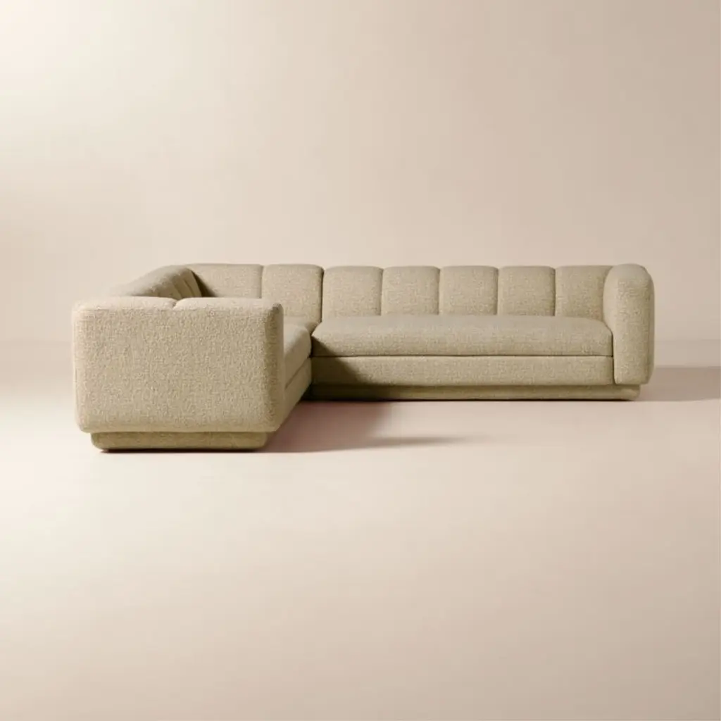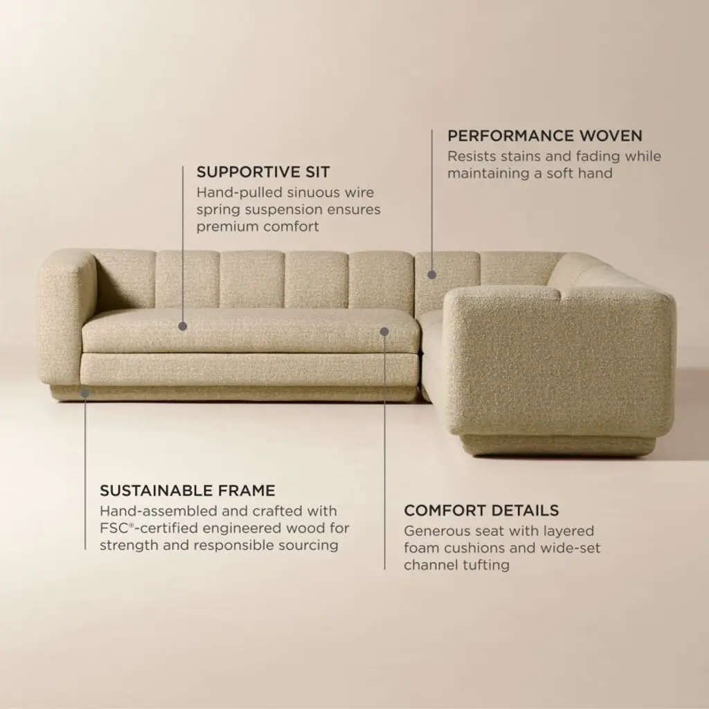 Taking stylistic nods from 1970s Italian design and the designers' own laid-back Southern California aesthetic, three-piece sectional sofa by Lawson-Fenning has generous proportions for gathering and relaxing. A deep seat is complemented by a relaxed back with wide-set channel tufting that highlights the rich texture of the easy-care textured woven performance upholstery. Each piece is assembled by hand to ensure a level of quality befitting the design. CB2 exclusive.