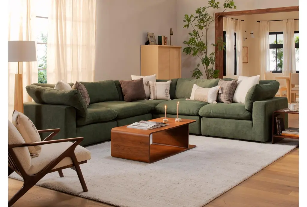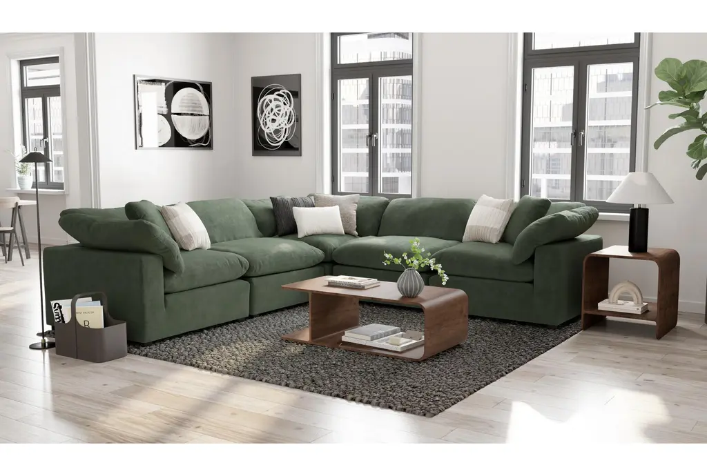 Zone Green Fabric 5 Piece Modular L-Shaped Sectional With 3 Corners 2 Armless Chairs | Reversible | Loose Reversible Back