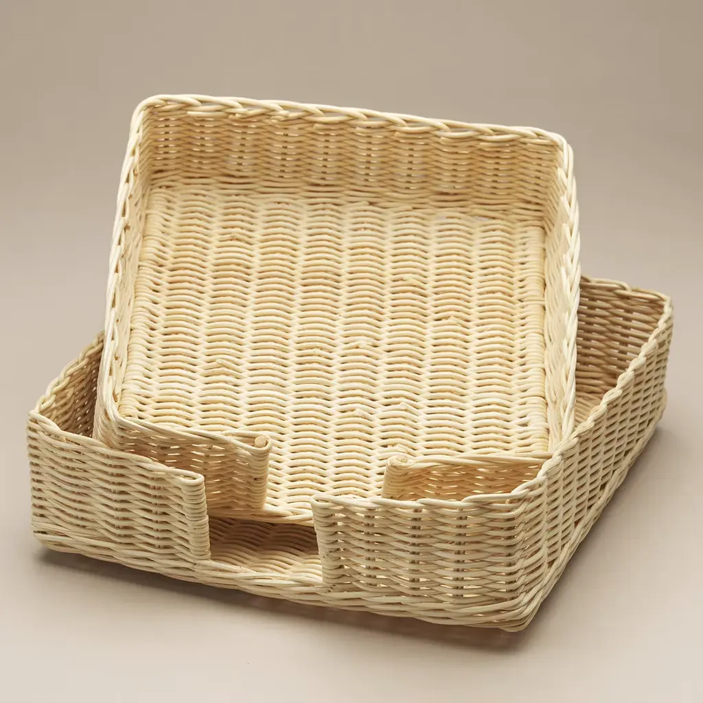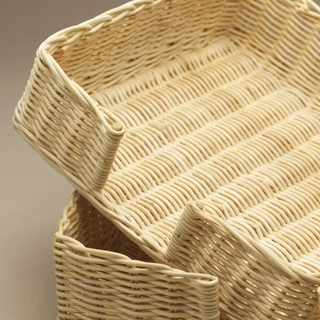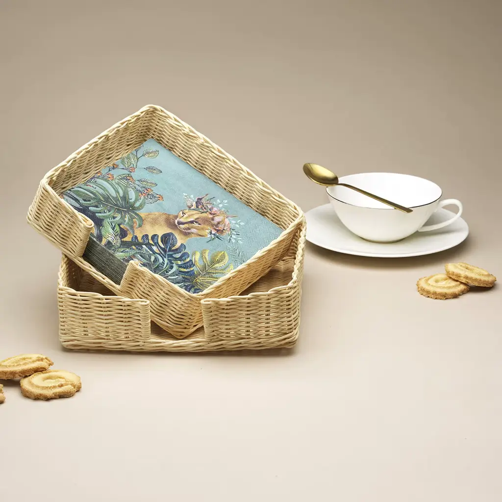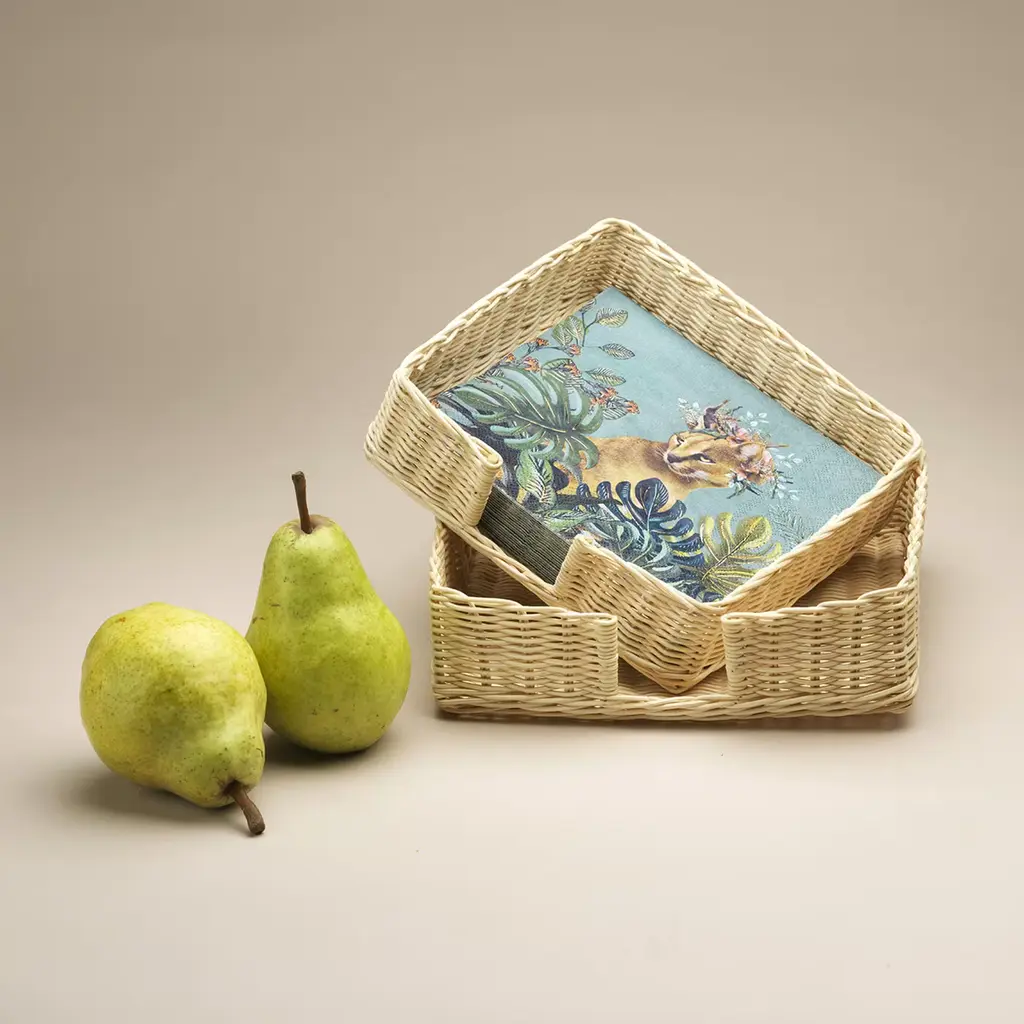 Clean lines outlining superb, intricate wicker wefts define the enthralling aesthetic of this napkin basket from the Mies en Place Collection, here offered in a larger variant but also available in a smaller variant measuring 18.5 x 18.5 x H 5.5cm. A water-based treatment is used to preserve the natural beauty of reeds untouched, for a must-have tableware object celebrating craftsmanship and nature at once.
