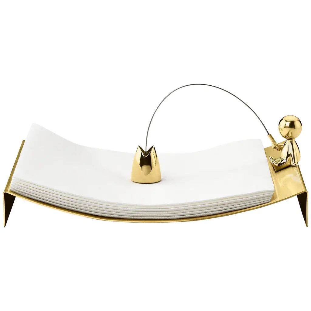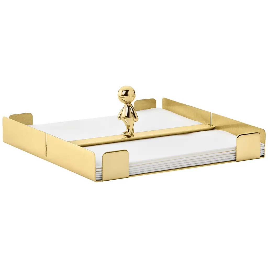 Part of the Omini Collection, this brass napkin tray is distinguished for its geometric silhouette and whimsical design. The square frame is composed of two tall sides connected by a long, flat rod, whose height is adjustable according to the quantity of napkins in the tray. A small figurine of a man stands atop the rod, resembling a tight-rope walker suspended in air. An everyday kitchen item reinvented with creative flair, this innovative piece will transform any modern kitchen.