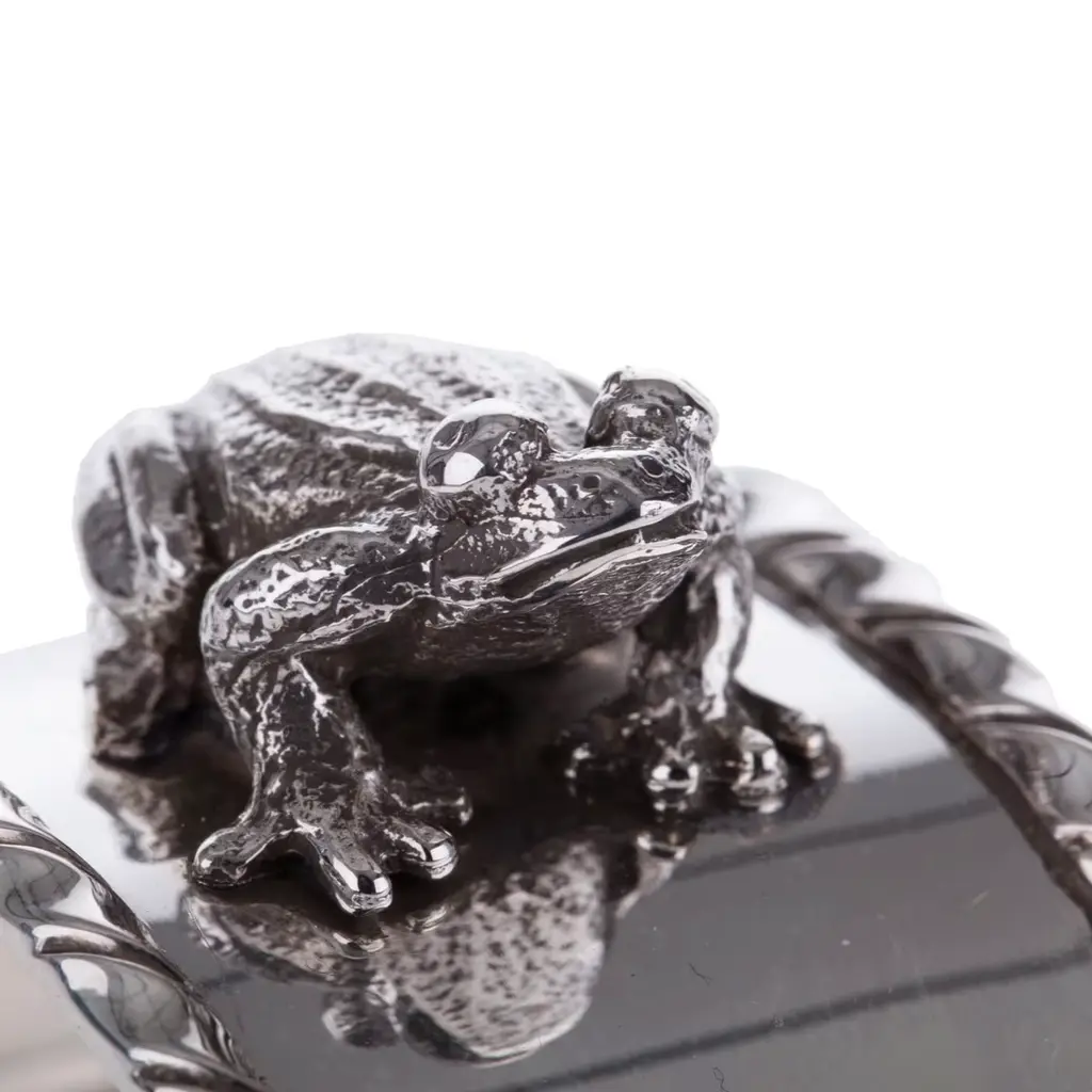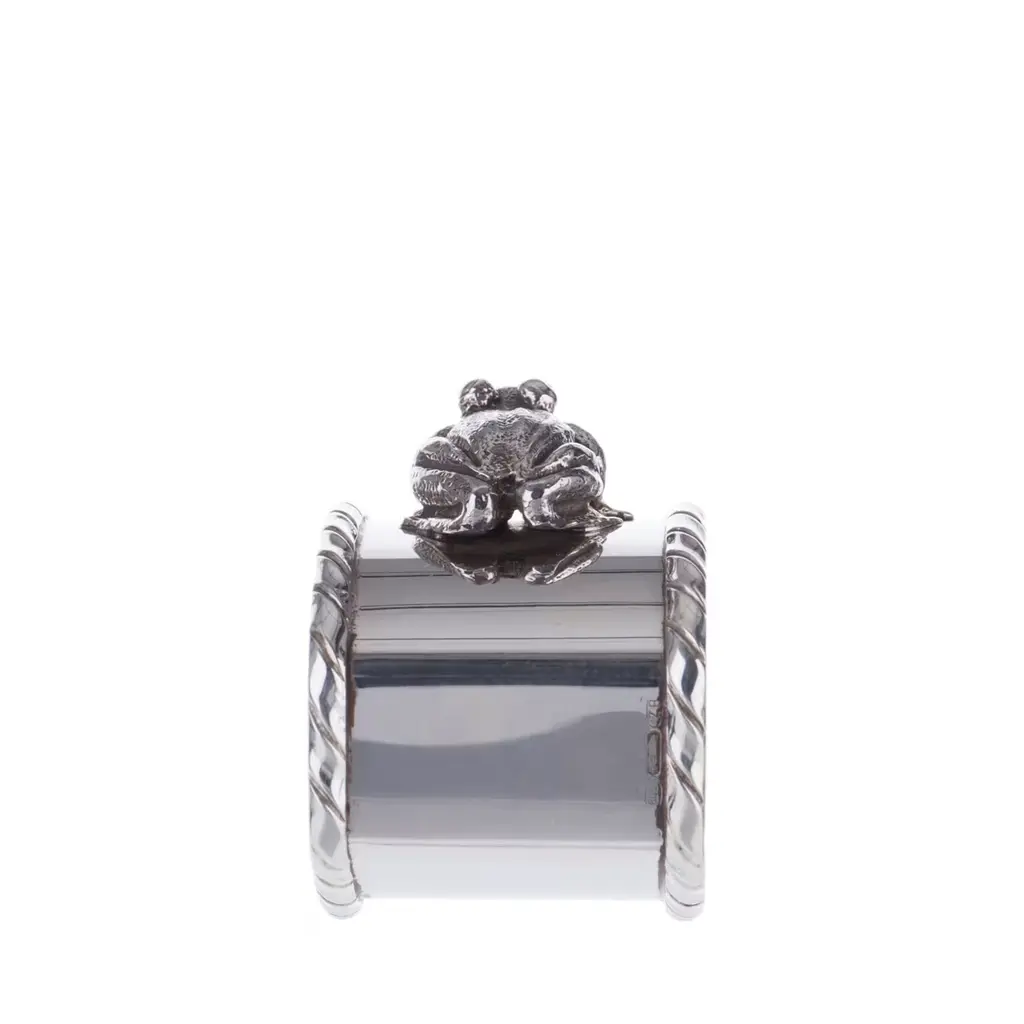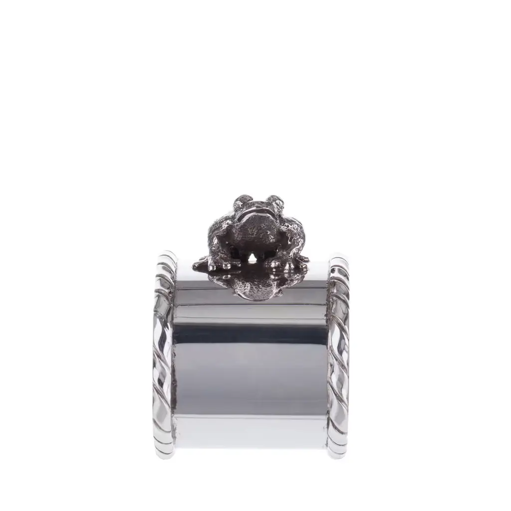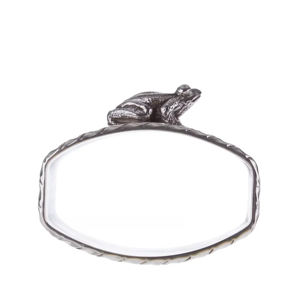 This is a sterling silver napkin ring by Florentine silversmiths Pagliai. The piece features a San Marco style rim and a graceful statuette of a frog created using the lost-wax casting technique. Pagliai offers different animal-inspired napkin rings that can be mixed and matched according to your taste.