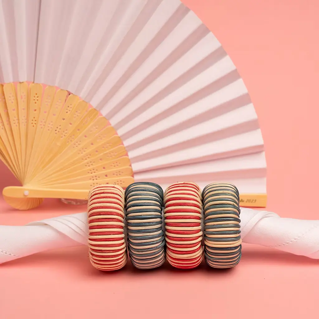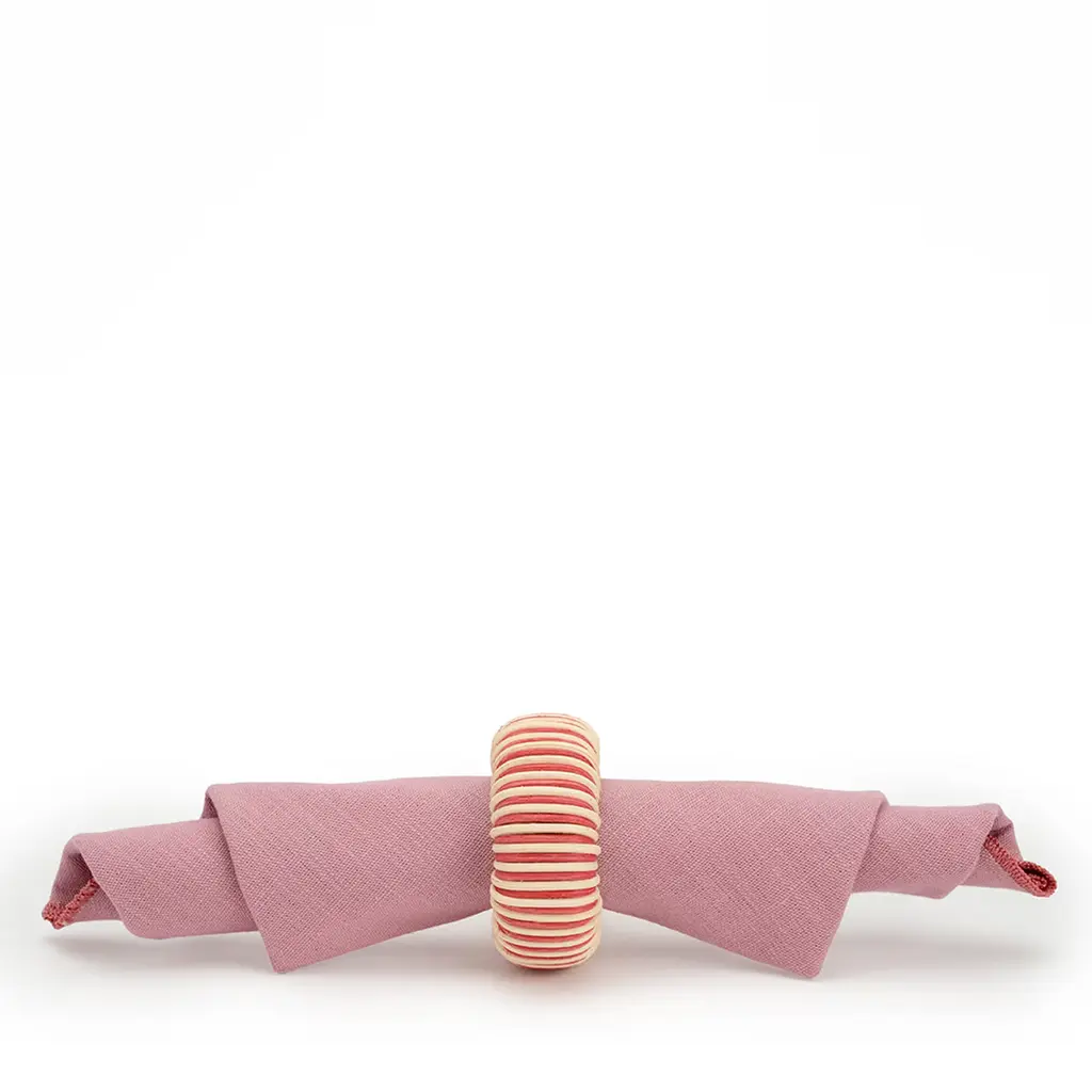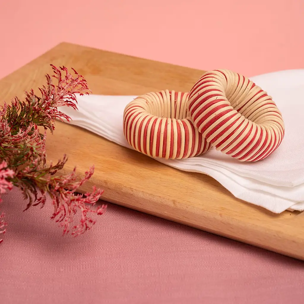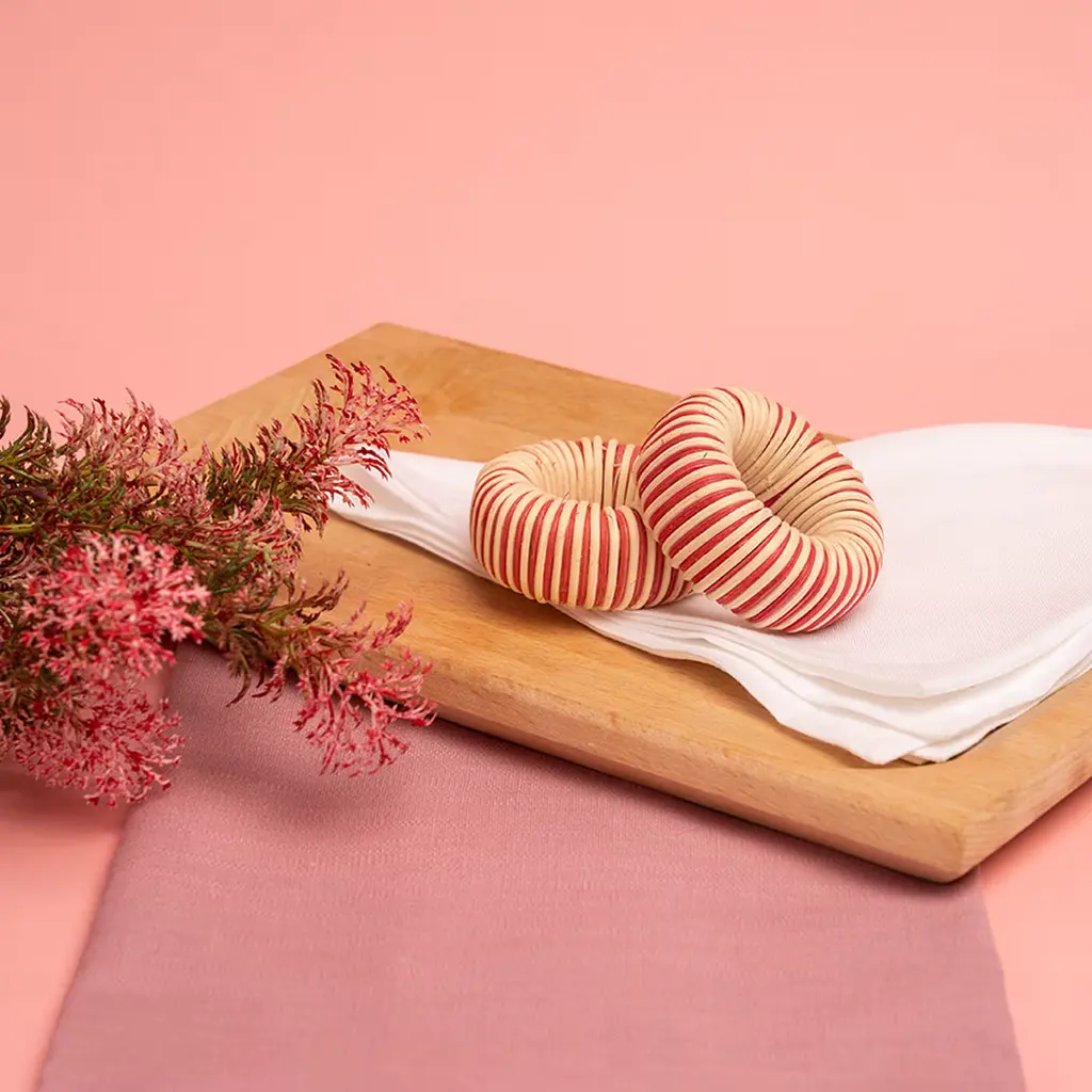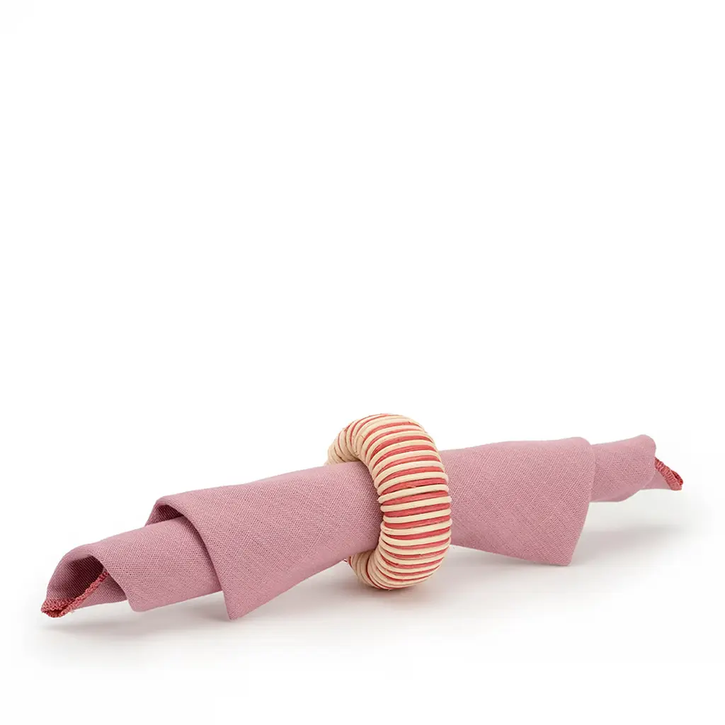This stunning set of four napkin rings, meticulously crafted from natural wicker, is intertwined with a charming rose geranium hue. Crafted from the finest dye plants, the mesmerizing bicolor finish captivates with its natural allure. The enchanting pink pigment is expertly extracted from the madder plant, revered since ancient times for its remarkable dyeing properties. Bring a touch of timeless beauty and sophistication to your table setting with this artisanal masterpiece.