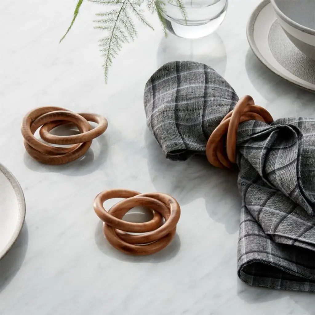 Three rounded rings of acacia are stained brown and intertwined to create this table-enhancing napkin ring. Interlocking rings bring the appeal of a trio of bangles to a placesetting. The smooth wood adds organic beauty to a modern, minimalist table. Or pair the wood napkin ring with linen napkins and rattan placemats to set a natural table.By choosing FSC®-certified products, you are supporting responsible management of the world's forests.