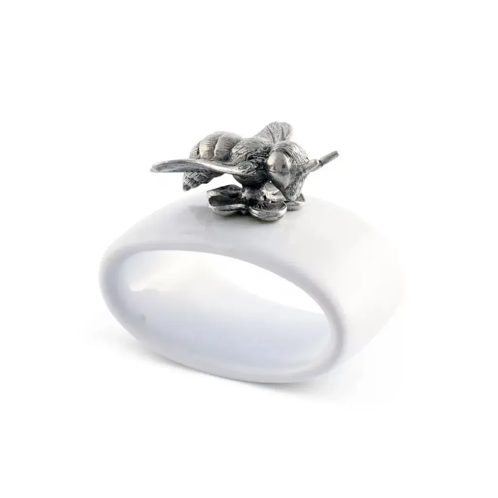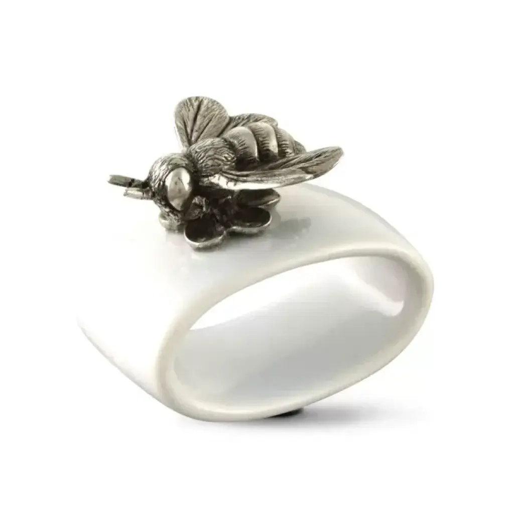 A gorgeous honeybee displays remarkable detail as it feeds on a flower at the top of Vagabond House's Stoneware Napkin Ring. A rippled abdomen and intricate wings highlight the insect's striking realism. This pure-pewter design looks exceptionally distinguished against our elegant stoneware. Vagabond House is a family-owned American company specializing in fine pewter tableware, servingware and giftware. Largely inspired by nature, their exclusive products are designed to be unique, functional heirlooms for those who seek to express tradition and style in both family and formal entertaining.