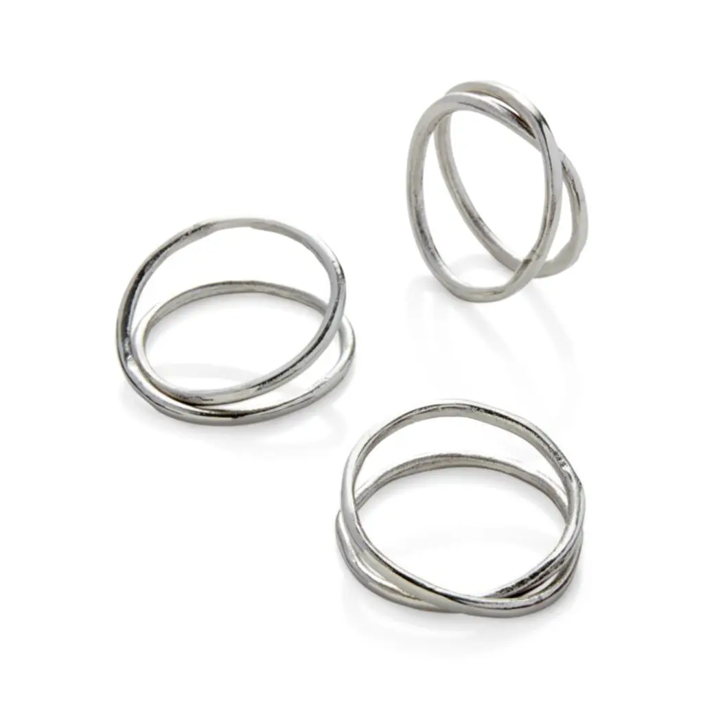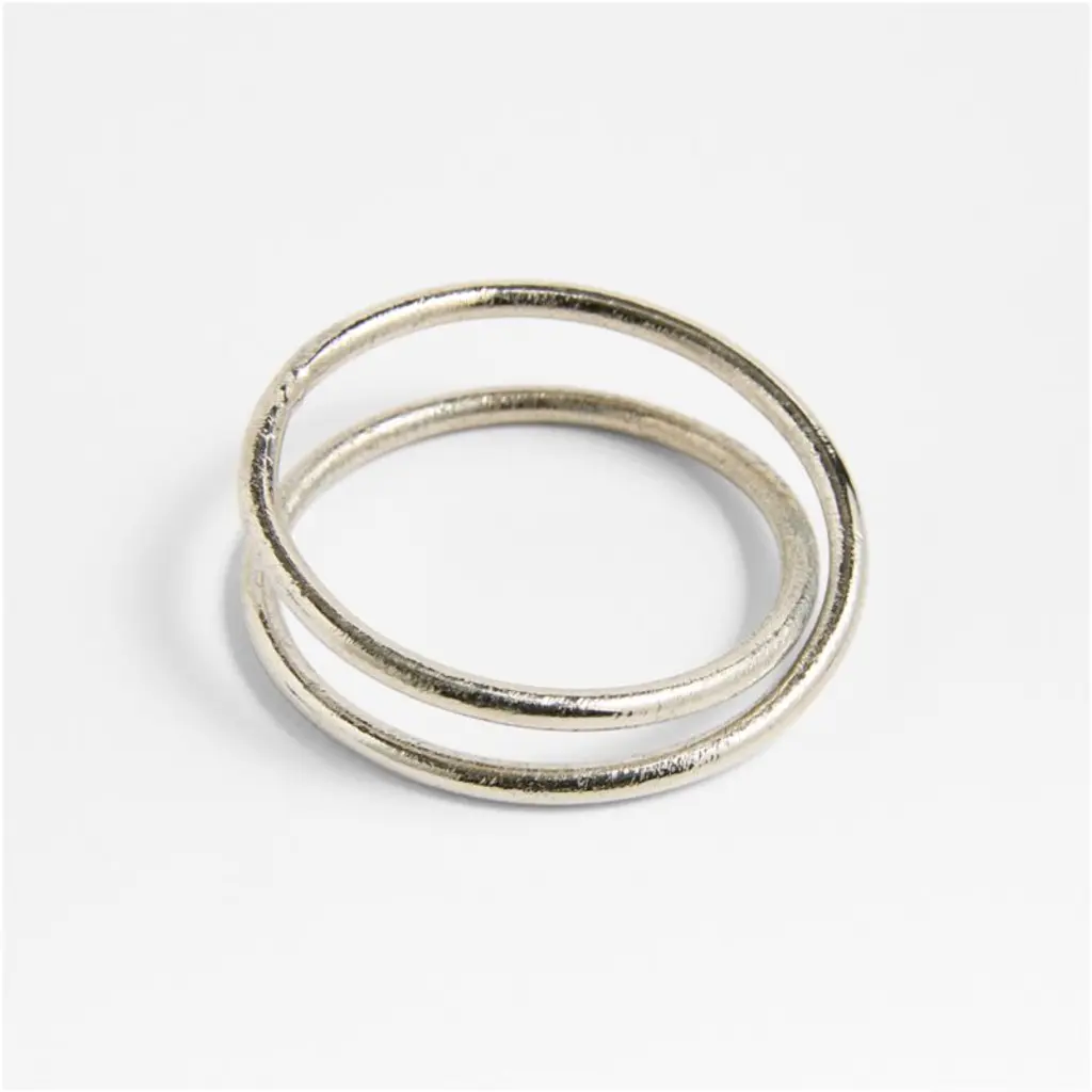 A simple, organic shape entwines silver bands with a soft, lustrous finish to form a beautiful napkin ring for elegant table settings and special occasions. Made of stainless steel with a silver finish, the two-ring design looks elegant with formal dinnerware and adds sparkle to casual linen and cotton napkins for everyday meals. We love the hint of glimmer with all-white or monochromatic place settings. Napkin rings can secure napkins in a range of folded designs, from the simple roll to the fan fold or double candle fan fold.