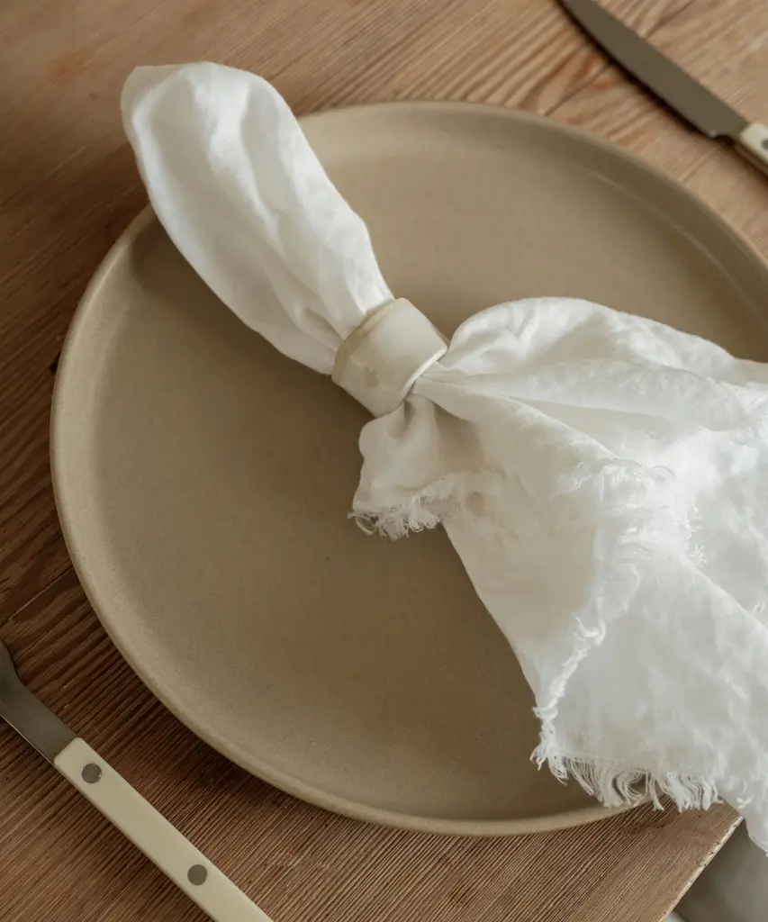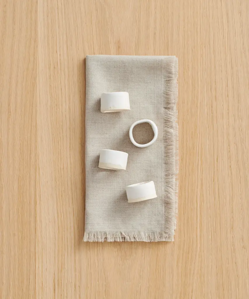 Ceramic Napkin Rings Ivory Glaze In the slowing down and being present, feeling all things big and small, Stacie Krajchir created each of these pieces with her hands to be enjoyed for years to come. Set of 4 ceramic napkin rings. Handmade in California and one-of-a kind. Each napkin ring varies in shape and size. Half glazed, half raw, with an unglazed rim to show the natural clay color and texture.