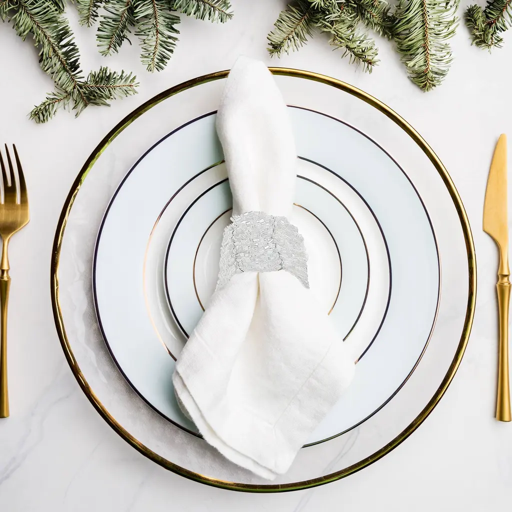 The Beaded Napkin Ring (White) adds a touch of elegance and sophistication to the dining table by holding a napkin rolled or folded around formal dining decor. It is made of shiny small glass beads strung together on a wire. It has a circular ring shape with an opening in the center that allows for easy insertion and removal of the napkin. It adds a touch of glamor to special dining occasions such as family festive dinners, birthday parties, weddings, and formal dinners.