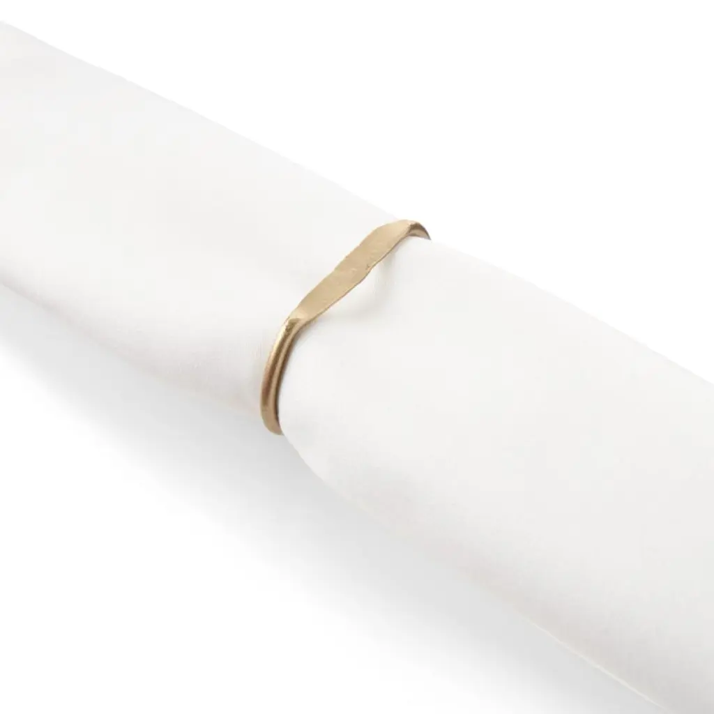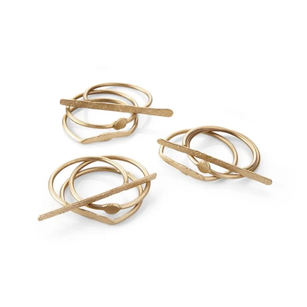 Like a set of edgy handcrafted bangles, these three napkin rings can each be used alone or stacked together in fun combinations. These dainty and modern brass finish rings have plenty of intriguing texture. Load up napkins with a multitude of rings for intimate dinners, or spread the wealth when setting the table for large gatherings.