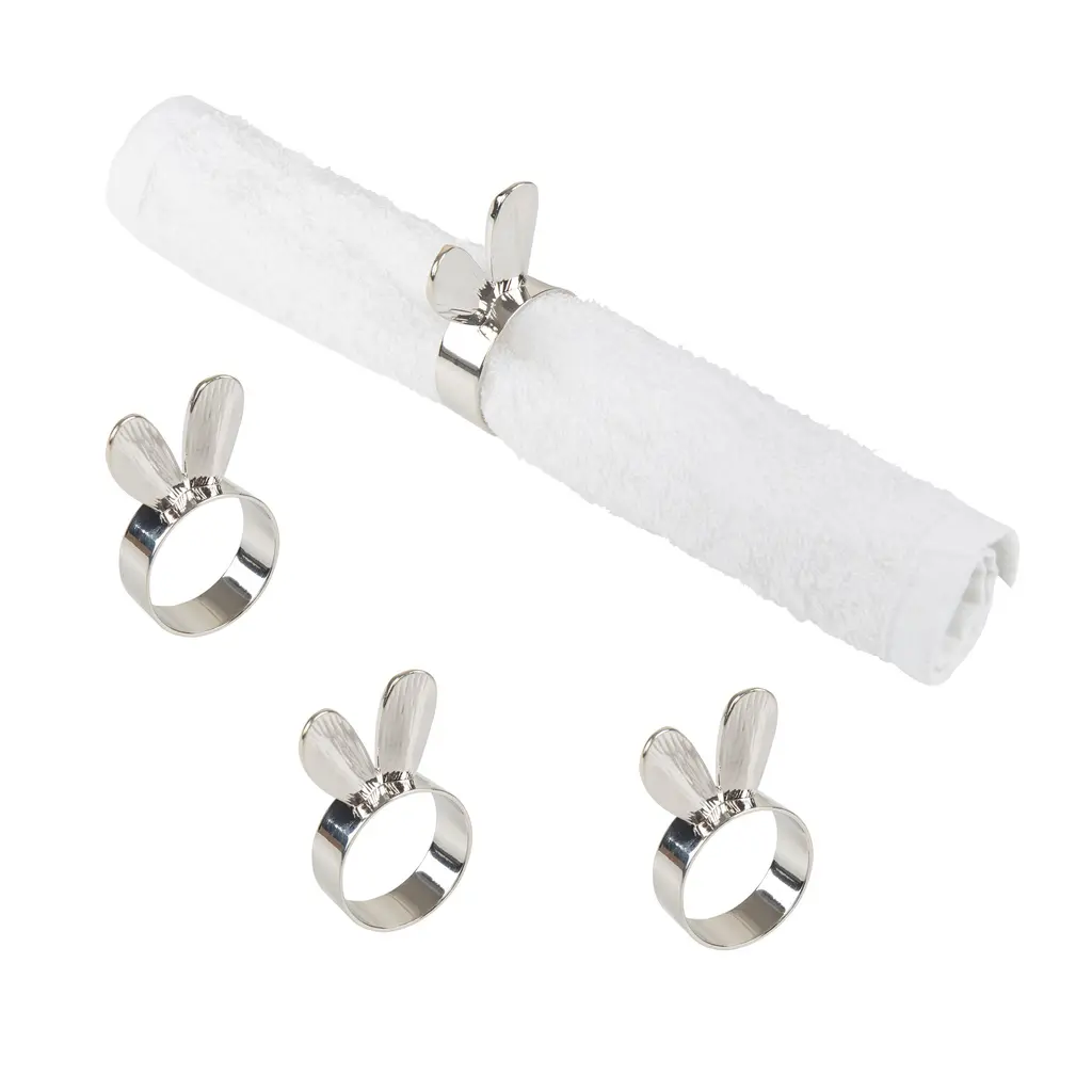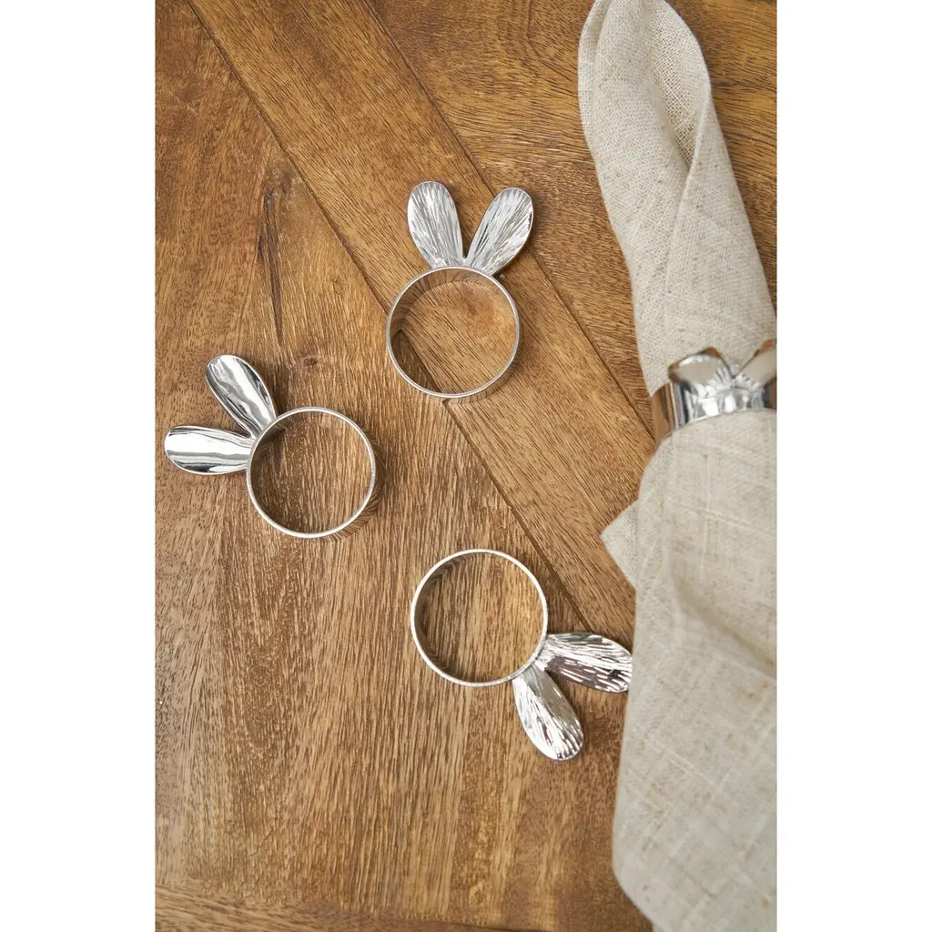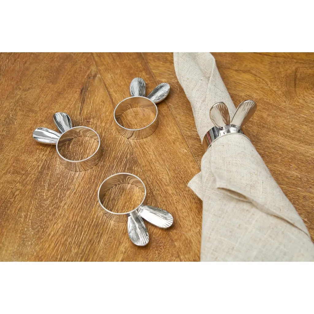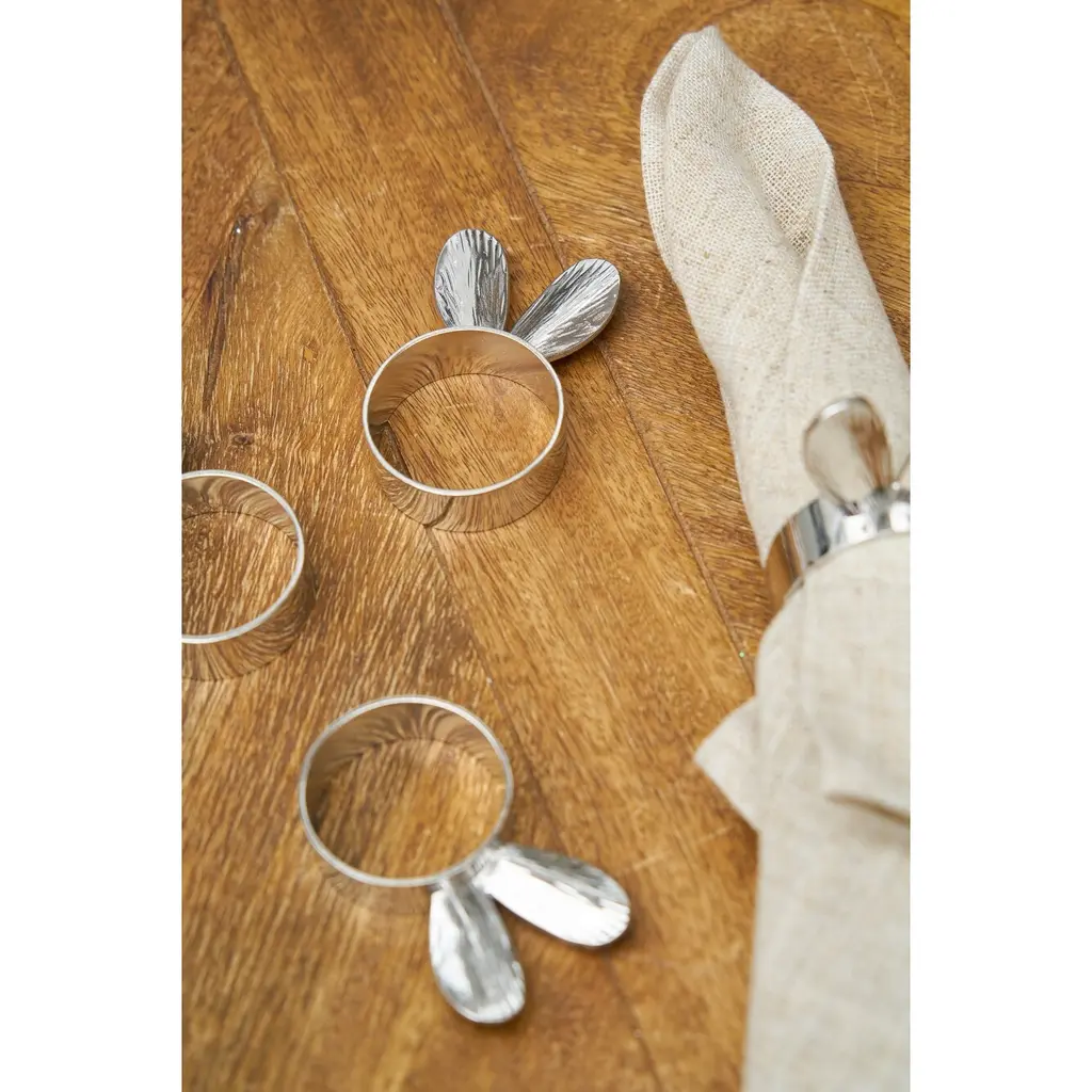 We are firm believers that if you like it, you should put a (napkin ring) on it. Add the final touch to your tabletop with this Silver Bunny Ears Napkin Ring, Set of 4. Add the finishing touch to your table setting. Designed to work with any tabletop decor, they are perfect for family dinners and any other special occasions. They are crafted to work with any standard size napkin and can be wiped clean with a damp cloth when needed. Don't let drab tableware distract your guests from a fabulous evening!This set of 4 napkin rings are the perfect start to building a new dining room theme and coordinate well with any aesthetic and dining room themes.Each ring measures 4.33" x 1.13" x 1.97".Rings are constructed from Zinc for a touch of quality and durability.