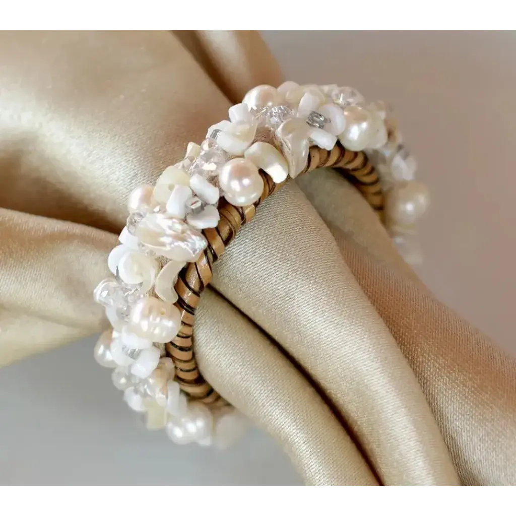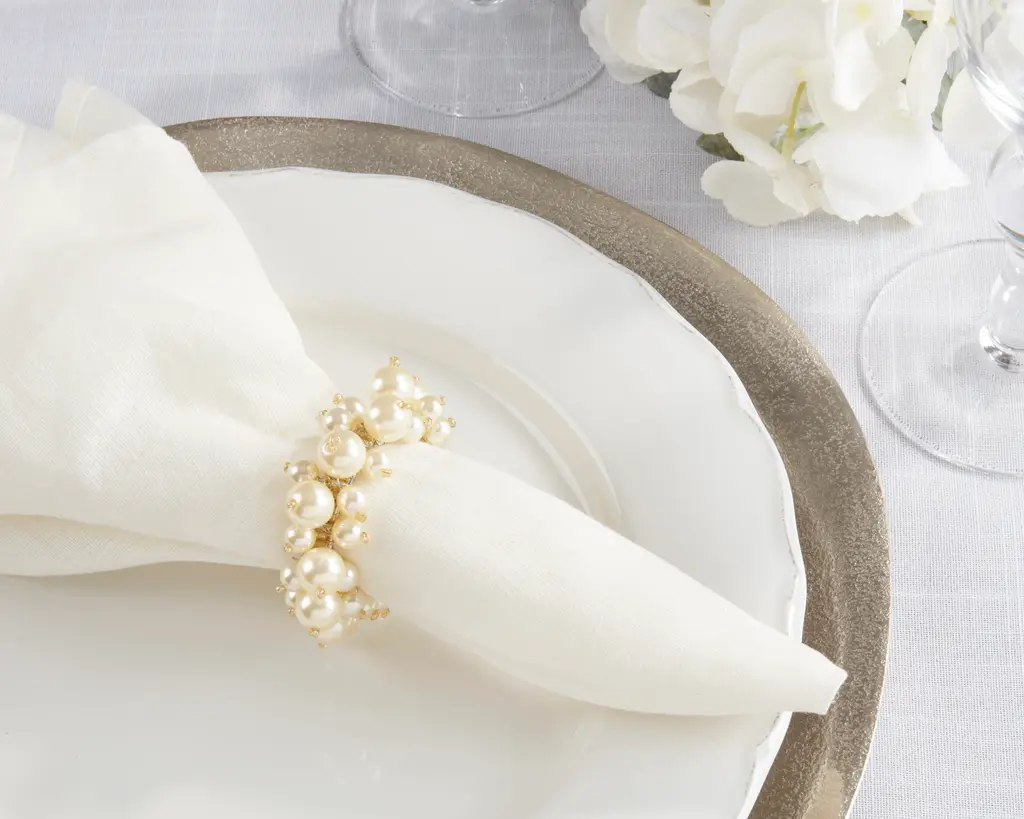 The Faux Pearl Napkin Rings are the perfect finish touch to an elegant table decor. The design features a lovely combination of big and small faux pearls creating a homogeneous appearance. They'll certainly bring an elegant flair to the table.