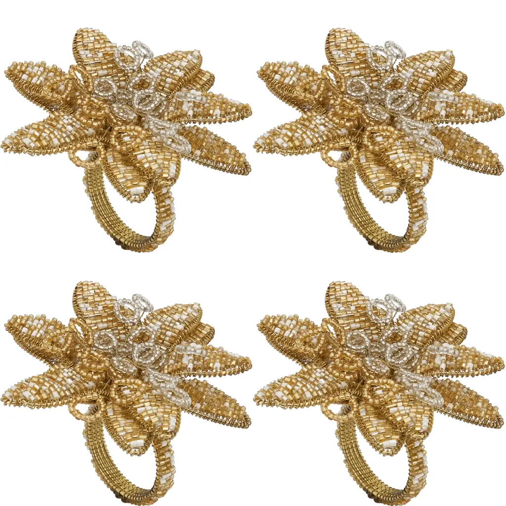 Flower Design Beaded Napkin Rings (Set Of 4) - Set Of 4 - Gold