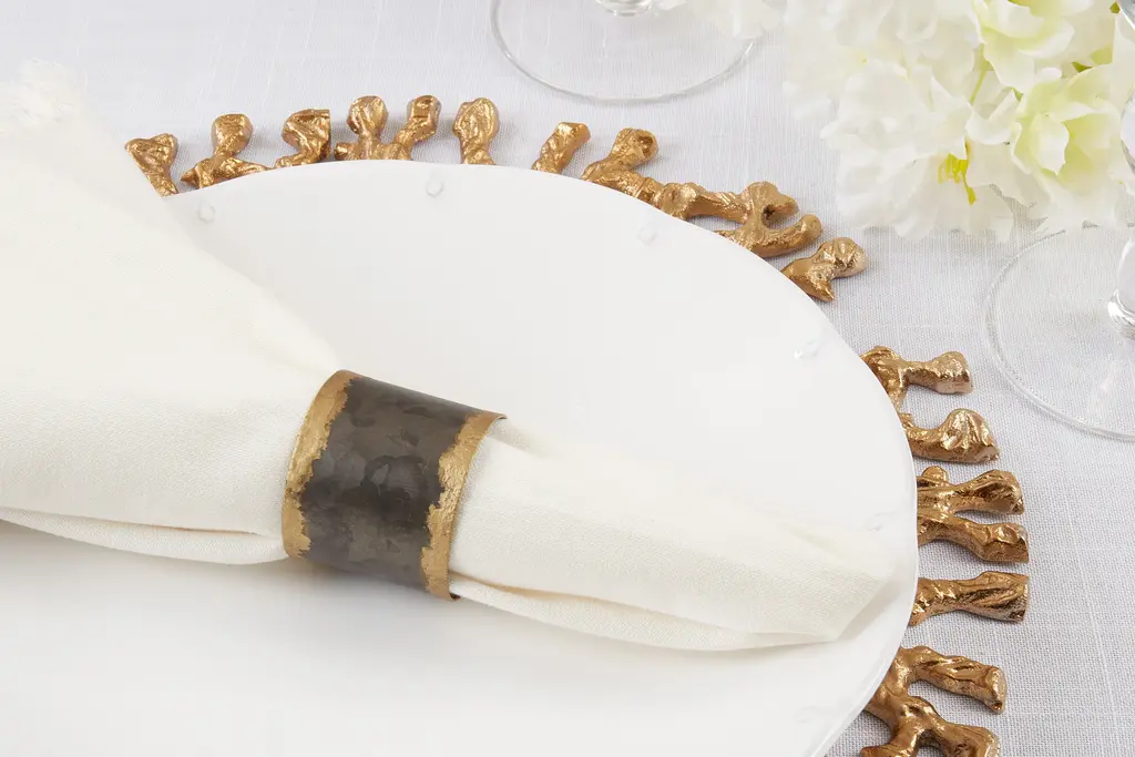 Highly versatile, this lovely set of Galvanized Gold Rim Napkin Rings is easy to dress up or pare down to suit any occasion, from casual dining to entertaining guests. It's dark metal design contrasts beautifully with the golden rim, adding depth and dimension to your place settings. Pair with dark plates or flatware for a coordinated look.