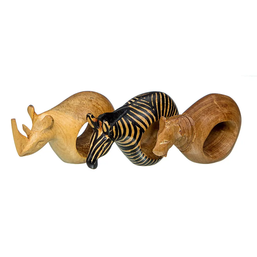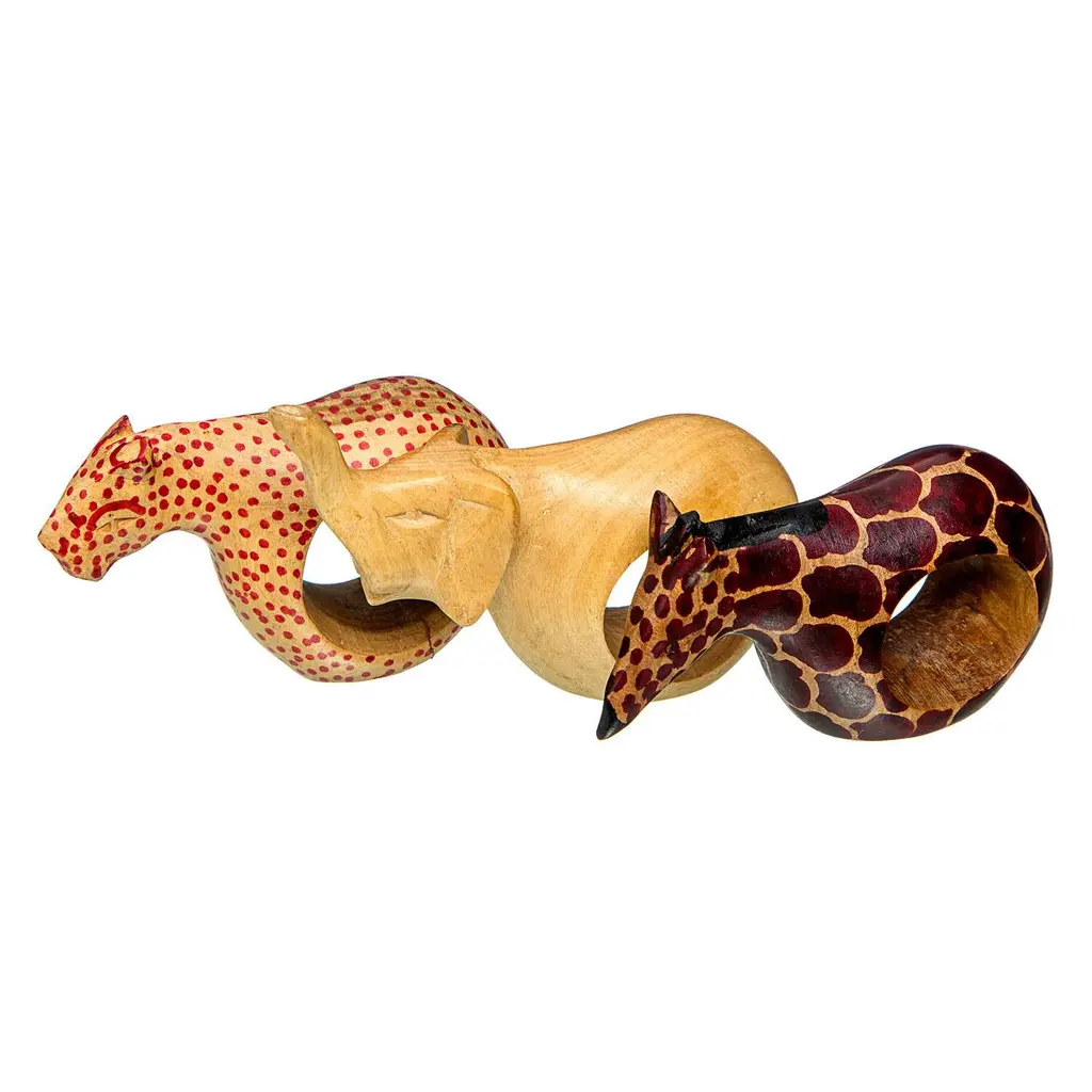 Add a unique look to your dinner table with this set of six handmade safari napkin rings. Fun animal designs create a perfect accent for dinner napkins, and the African mahogany construction delivers an upscale finishing touch. Each piece in this set depicts a different animal for mix-and-match place setting capabilities.