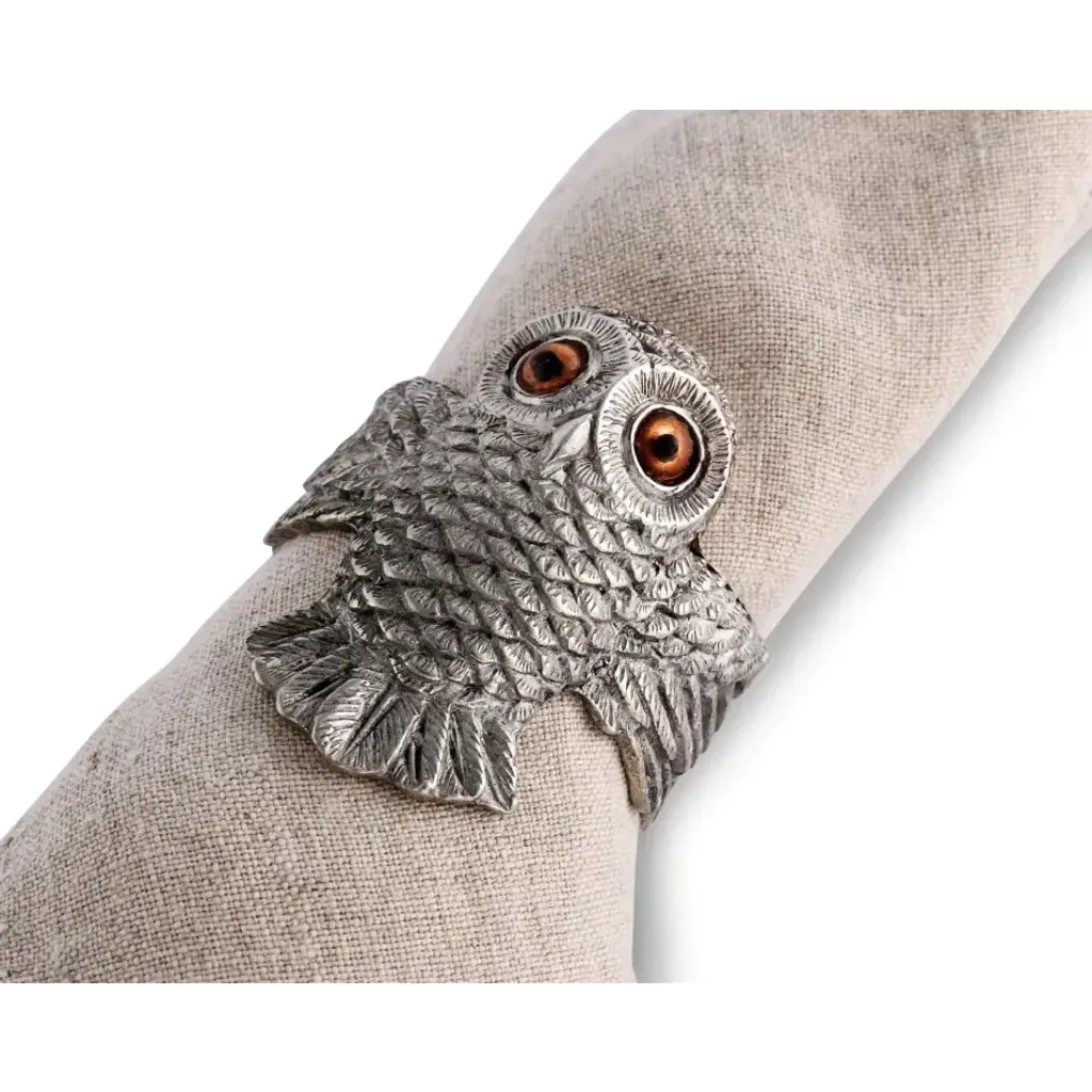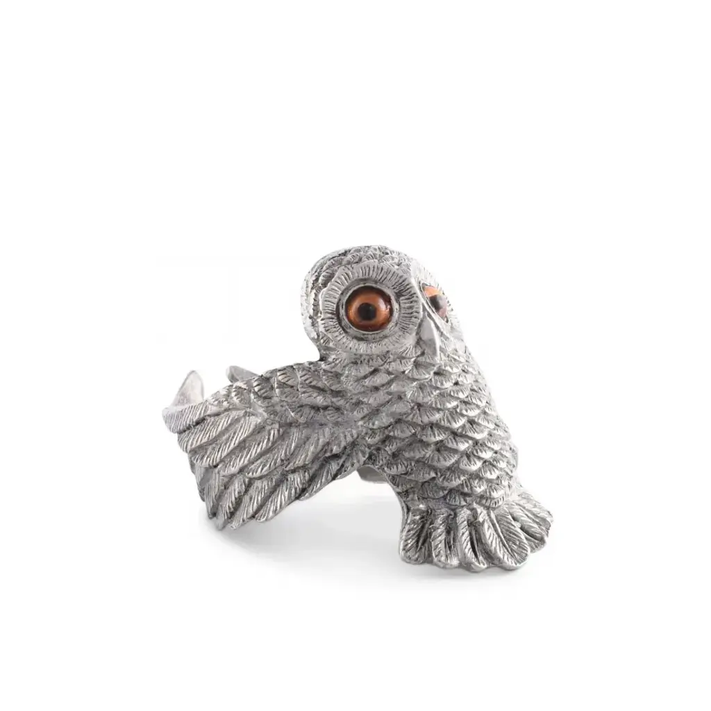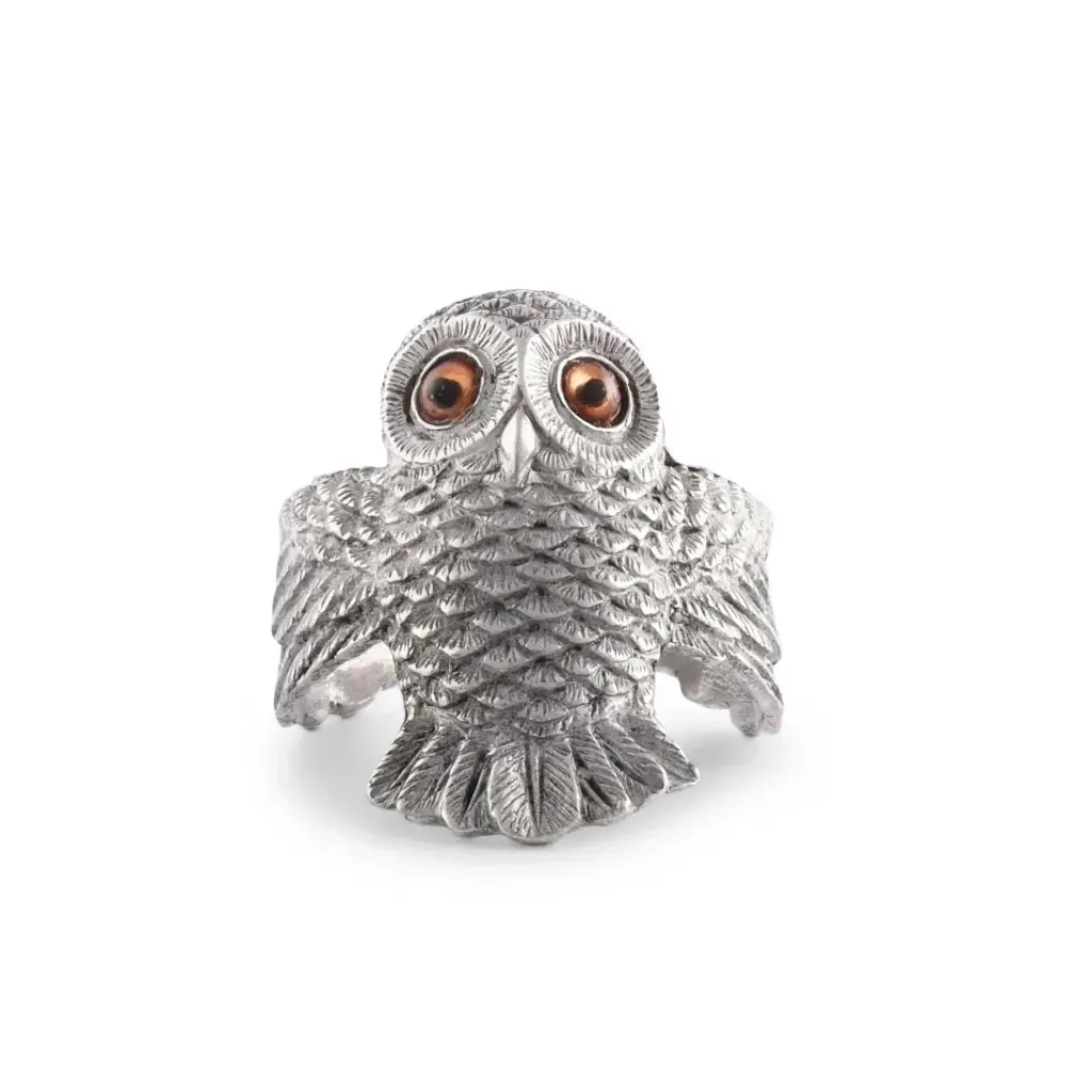 Big, bronze eyes distinguish the intriguing design of Vagabond House's Owl Napkin Ring. As if wrapping the napkin in a warm embrace, the creature's wings fan out and, with the help of its tail feathers, balance on the table. Crafted in luxury-grade pewter, the owl exhibits tremendous craftsmanship in its layered feathers. Vagabond House is a family-owned American company specializing in fine pewter tableware, servingware and giftware. Largely inspired by nature, their exclusive products are designed to be unique, functional heirlooms for those who seek to express tradition and style in both family and formal entertaining.