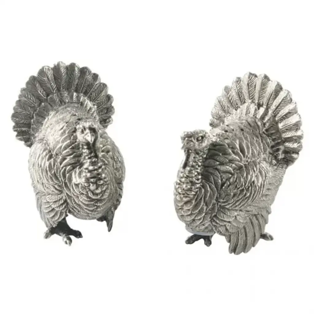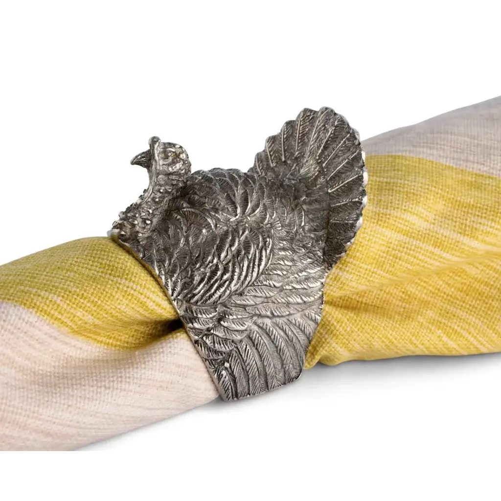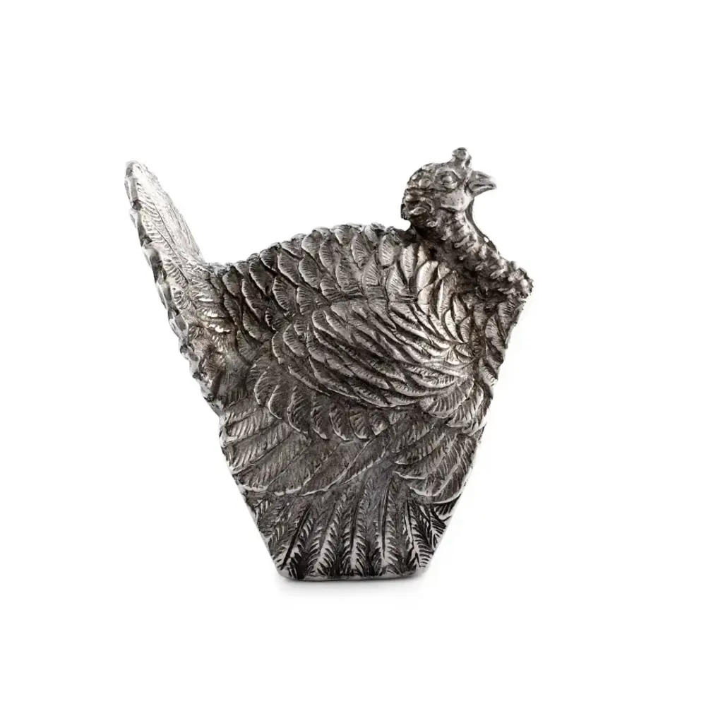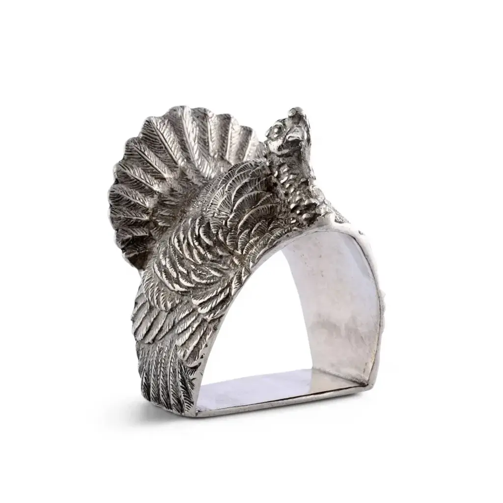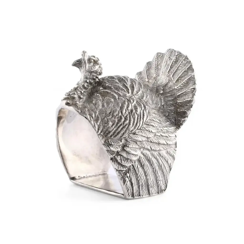Perfect for fall and harvest-themed celebrations, Vagabond House's Turkey Napkin Ring adds a certain nobility to the table. The bird's hollowed body creates an opening for the napkins, while its intricate wings curve down and decorate the ring's exterior. Crafted in luxury-grade pewter, the turkey shows remarkable definition in its layered feathers and detailed wattle. Vagabond House is a family-owned American company specializing in fine pewter tableware, servingware and giftware. Largely inspired by nature, their exclusive products are designed to be unique, functional heirlooms for those who seek to express tradition and style in both family and formal entertaining.