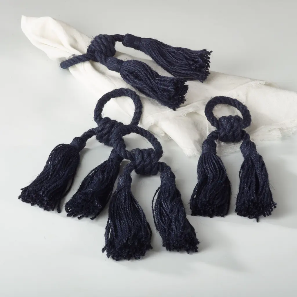 Highly versatile, the Jute Tassel Napkin Rings can bring a classic look to your tabletop, or a contemporary style depending on the occasion. The set can be easily dressed up or pared down and paired with a wide range of tableware and napkins. The tassels bring beautiful texture to each place setting, a lovely accent for the table.Features:
