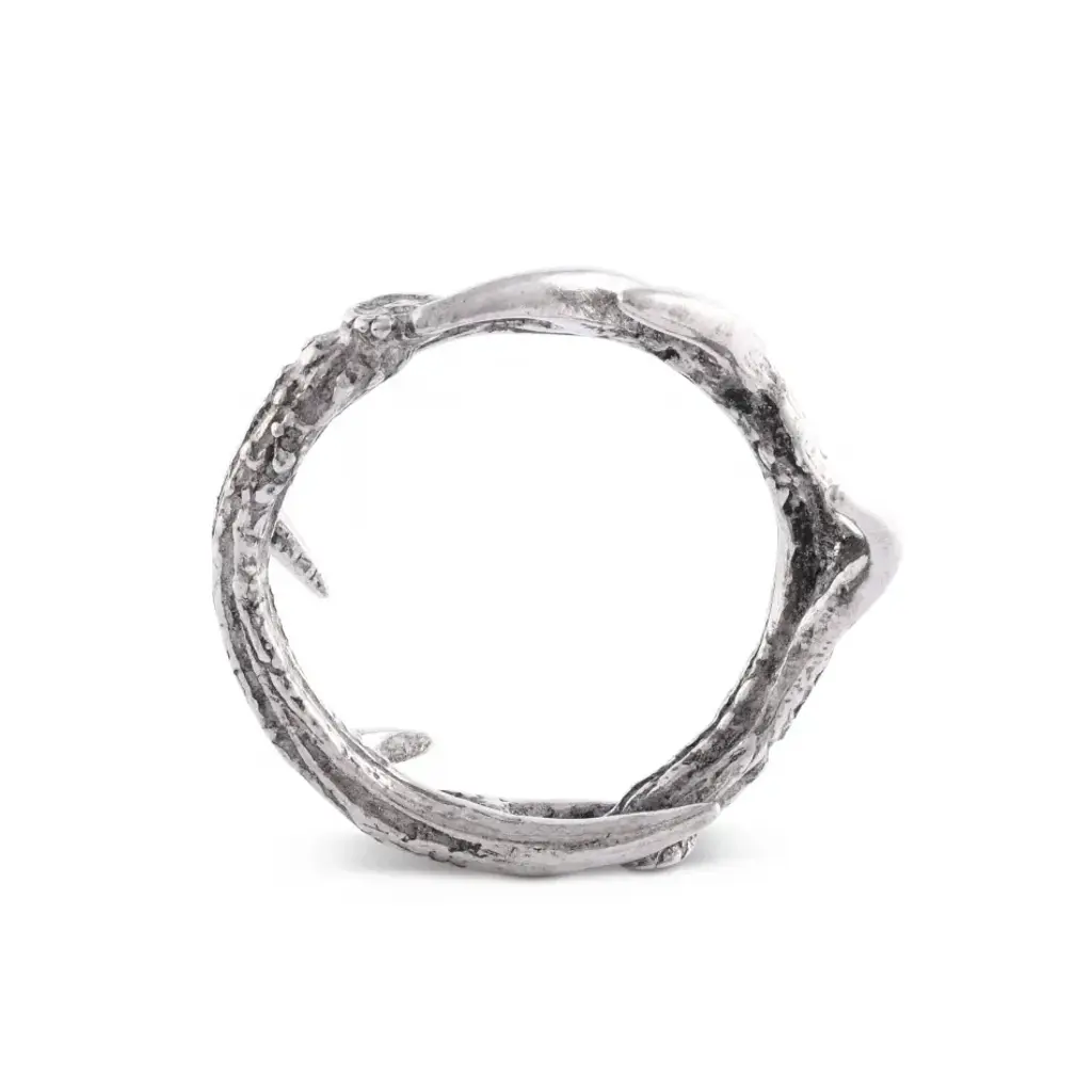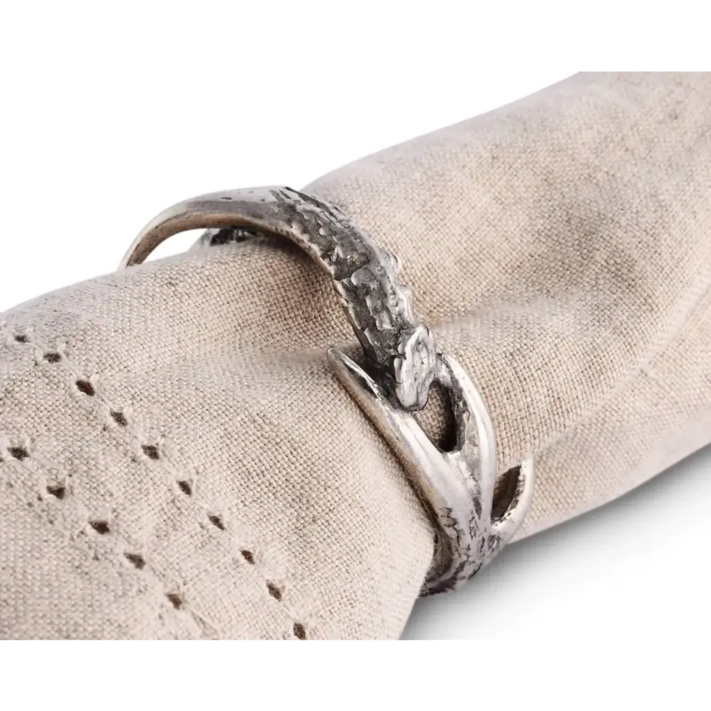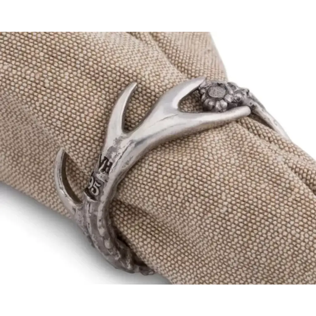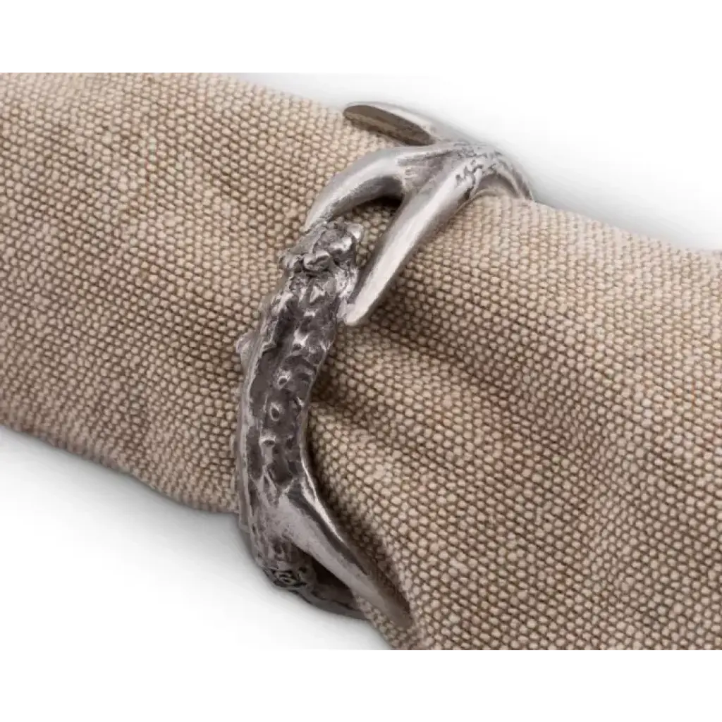 Wrap up your napkins in lodge style antler napkin rings by Vagabond House. Fine pewter is hand-cast and finished as figural antler to create these unusual, realistic napkin rings. Light antiquing highlights details so real it seems as if the antler from tiny deer were used to make them. 6/5 Vagabond House’s Lodge Collection defines rustic and elegant, showcasing pieces inspired by the natural landscape surrounding lodges; whether they are for hunting, skiing or just the place you call home. Vagabond House is a family-owned American company specializing in fine pewter tableware, servingware and giftware. Largely inspired by nature, their exclusive products are designed to be unique, functional heirlooms for those who seek to express tradition and style in both family and formal entertaining.